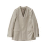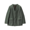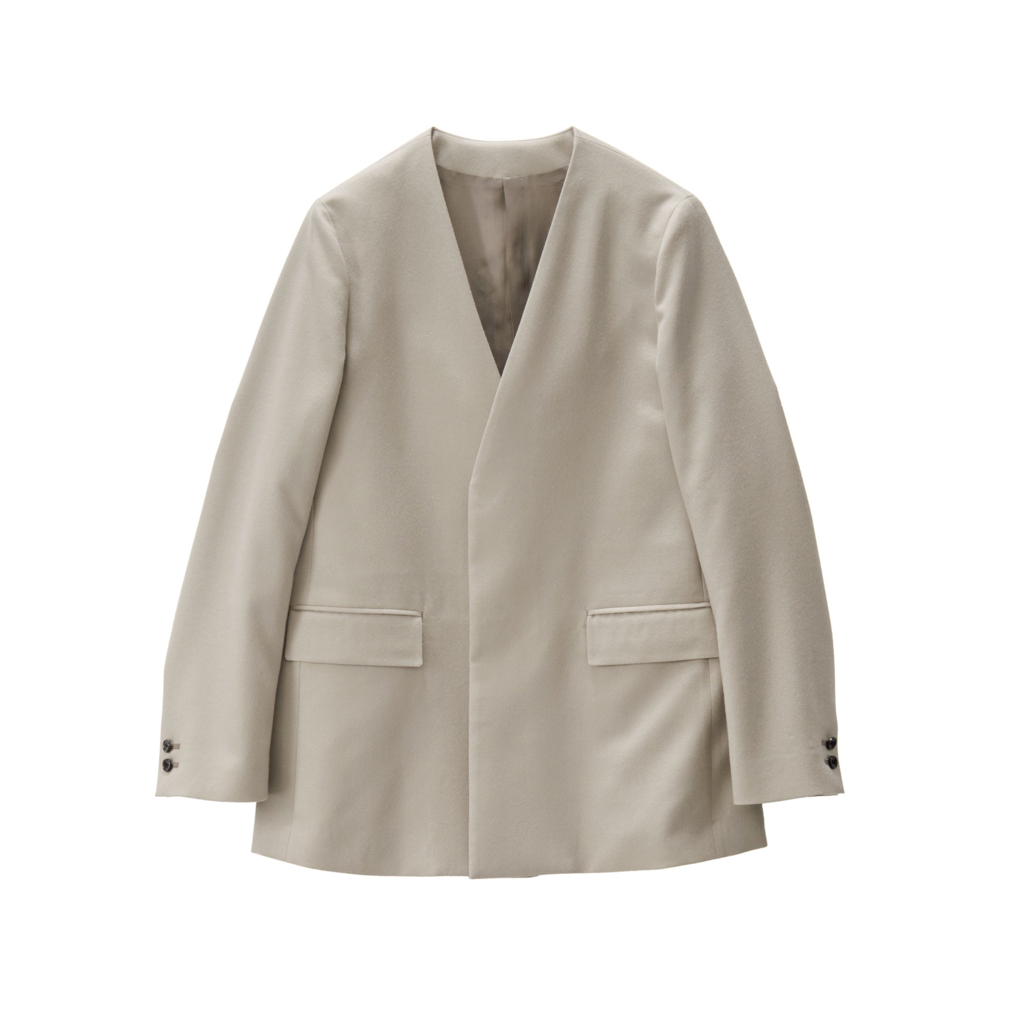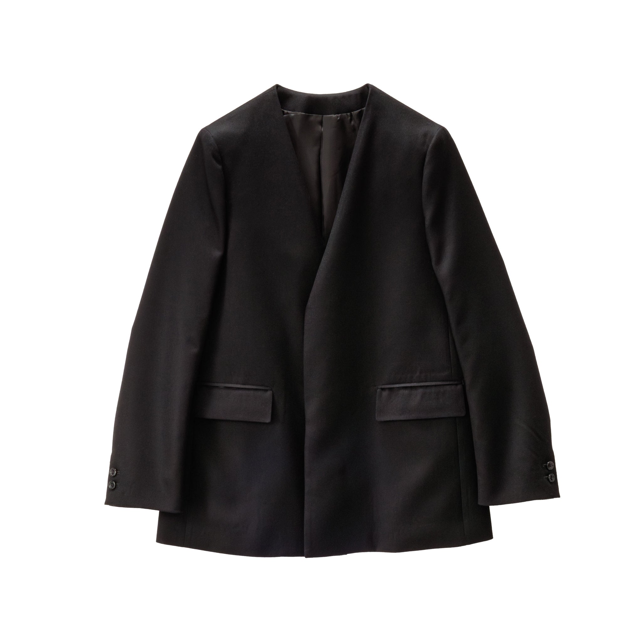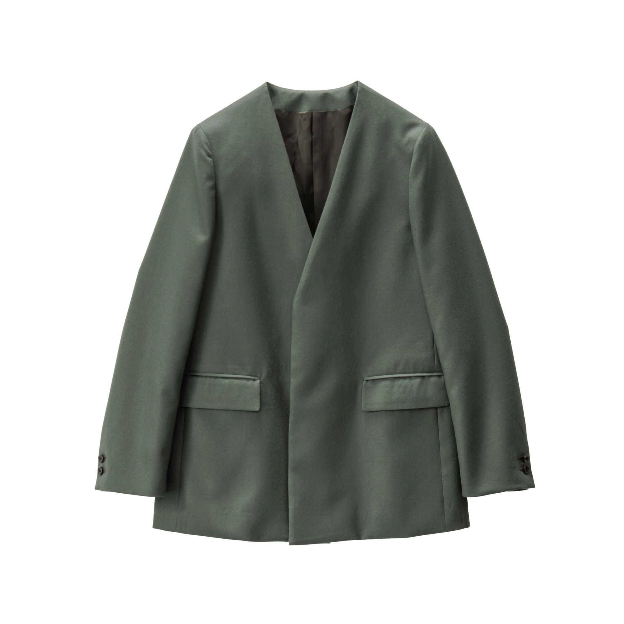 本来打ち込みが甘めに織られ、加工でふっくらと柔らかく仕上げるフラノを高密度サージで表現したフランネル素材。縮絨と毛さばきを何度も繰り返して仕上げたことで深みのある上品な光沢と、力強いハリ感を表現。通常の3倍の工程を経て、独特の風合いが感じられる逸品。クラシカルにジャストで肩を形成したテーラリングジャケット。ラペルレスで比翼に仕立てることでミニマルな美しさを纏う。