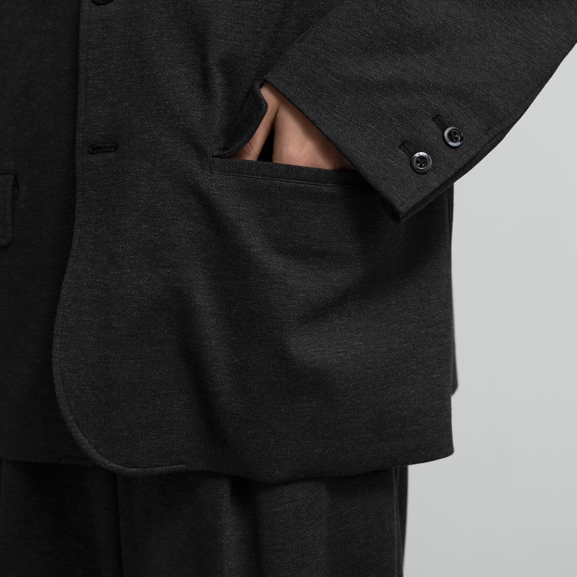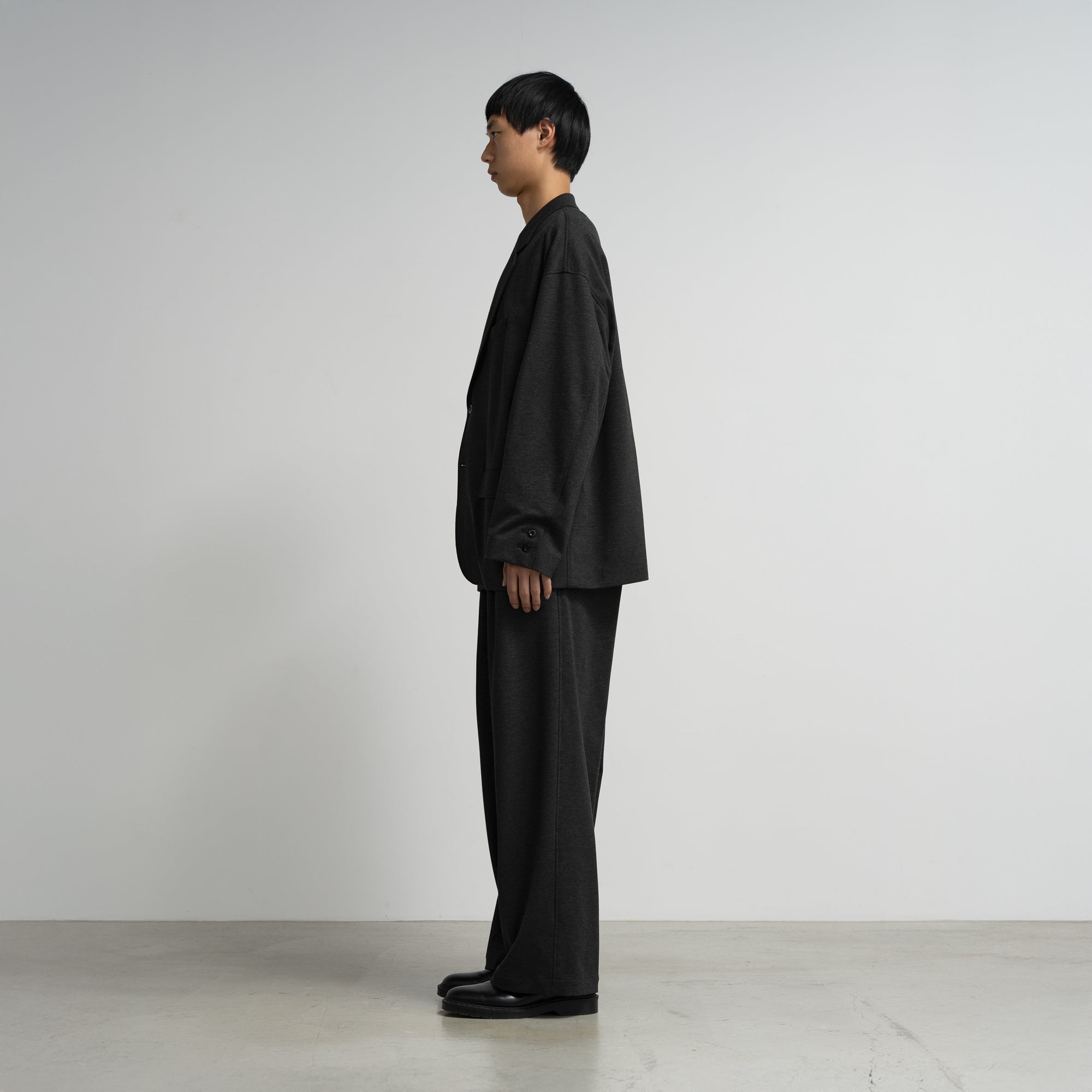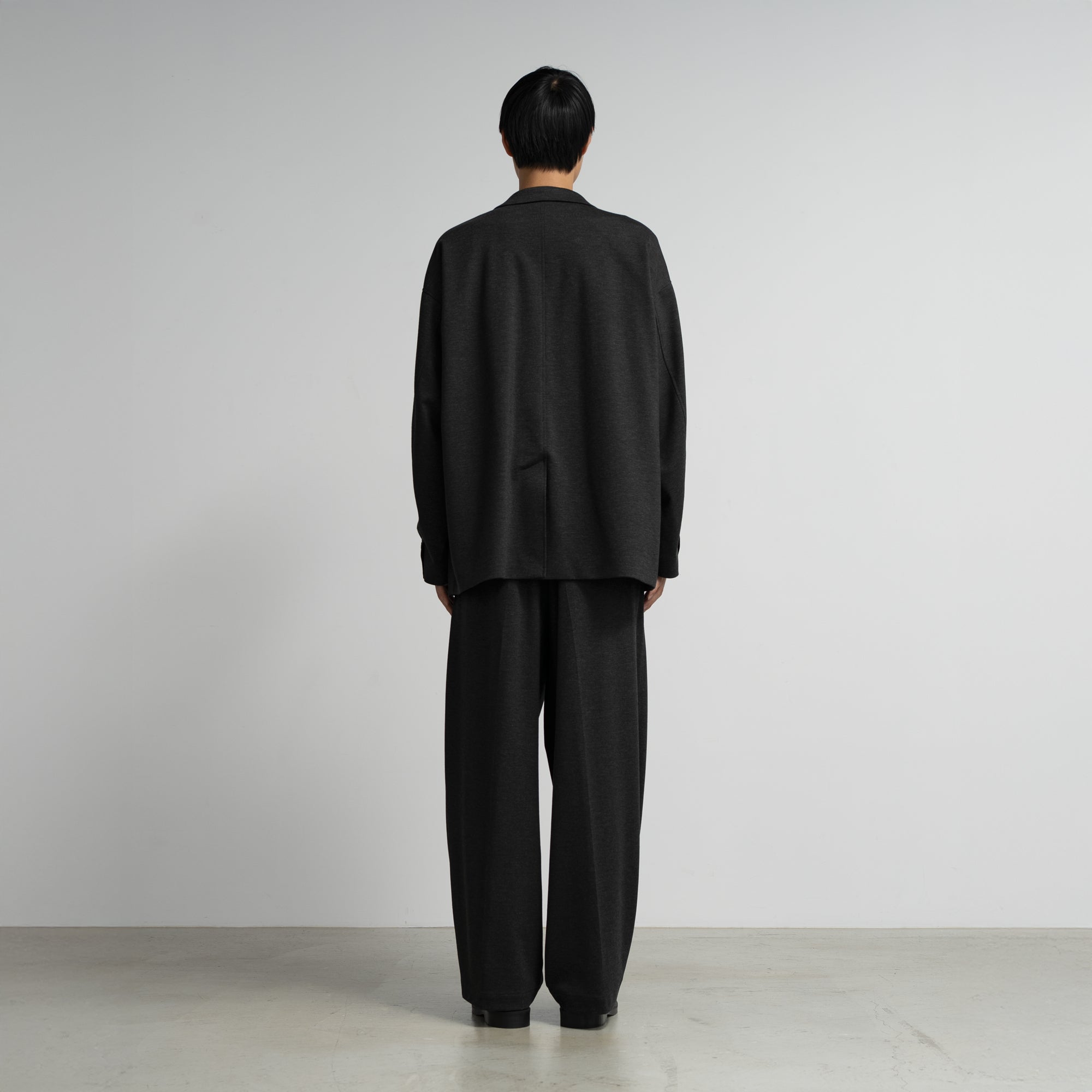 スペイン・バルセロナに拠点を持つSIDOGRAS(シドグラス)社のヴィスコースポンチを使用。布帛のような滑らかなタッチと、ハリがありながら馴染みやすいしなやかさが特徴。ドロップショルダーでボリュームのあるシルエットのジャケット。動きやすくアクティブなスーチングスタイルが楽しめる。