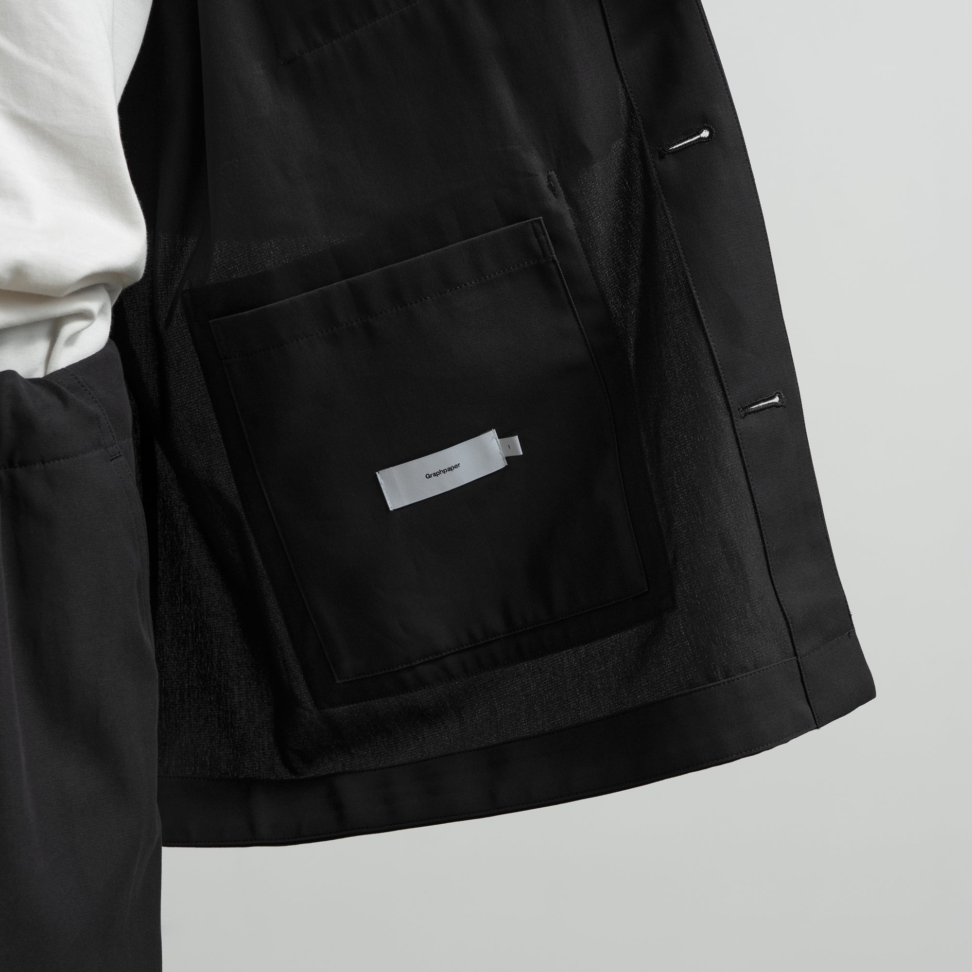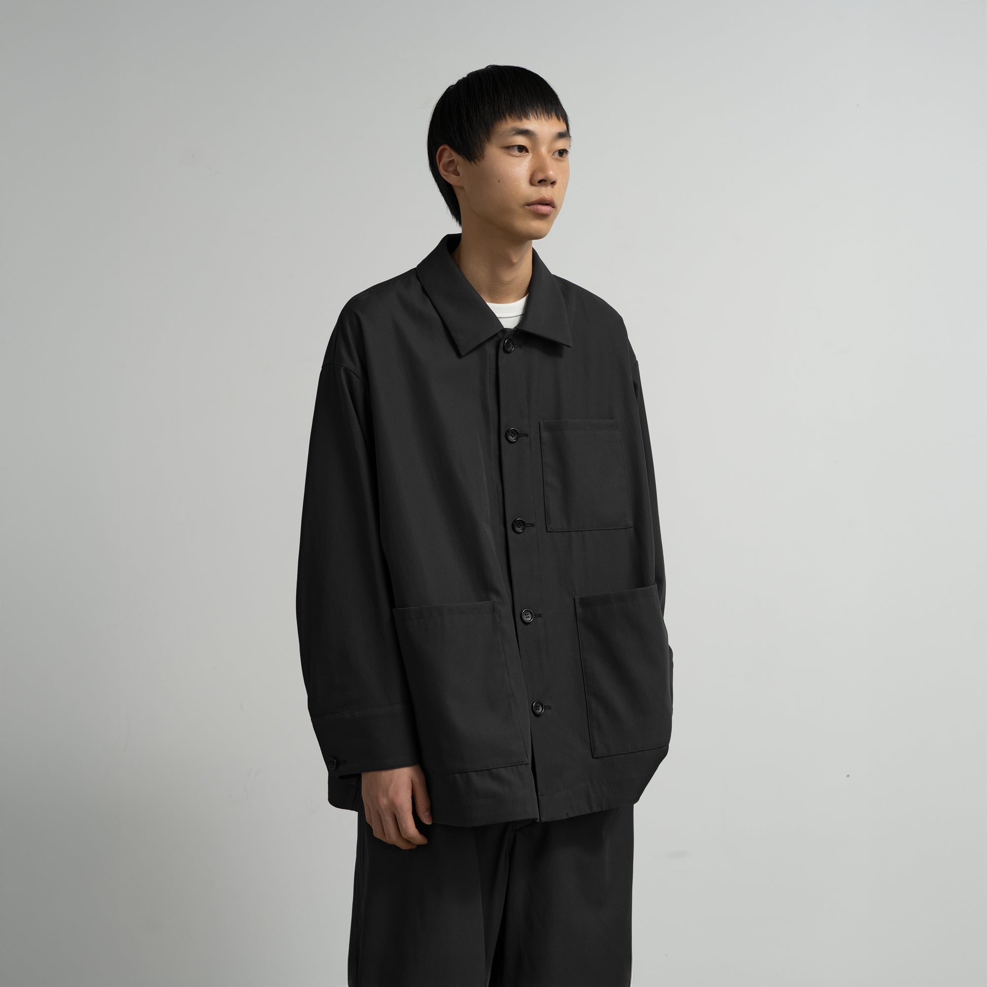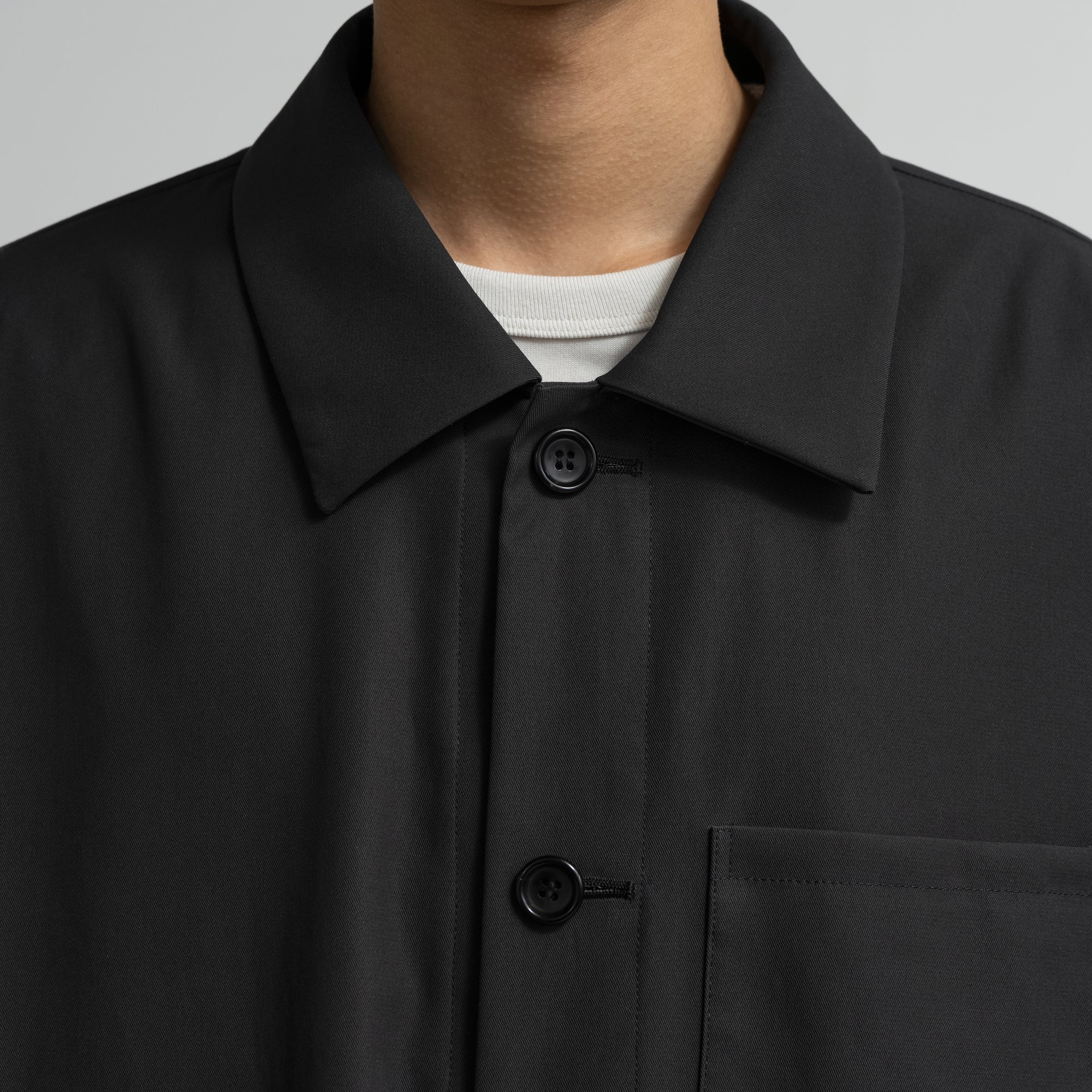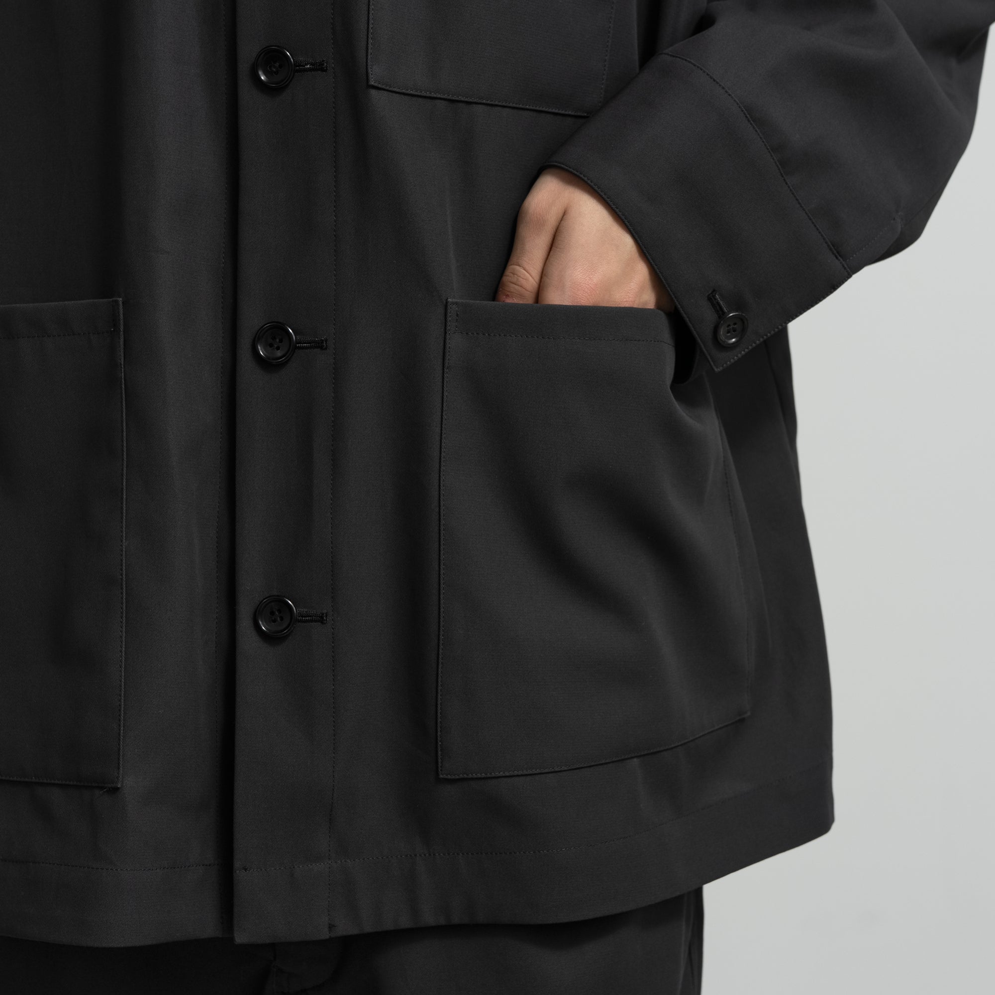 コットンの強撚糸をガス焼きして、毛羽立ちを押さえ合繊のようなクリアな質感を表現した高密度ギャバジン。まるで梳毛のような品のある光沢とシャリ味のあるタッチと、シワになりにくい反撥感のある風合いが特徴の素材。ワークウェアに代表されるカバーオールをベースに、最小限のステッチワークによってミニマルなアイテムにモダナイズされている。