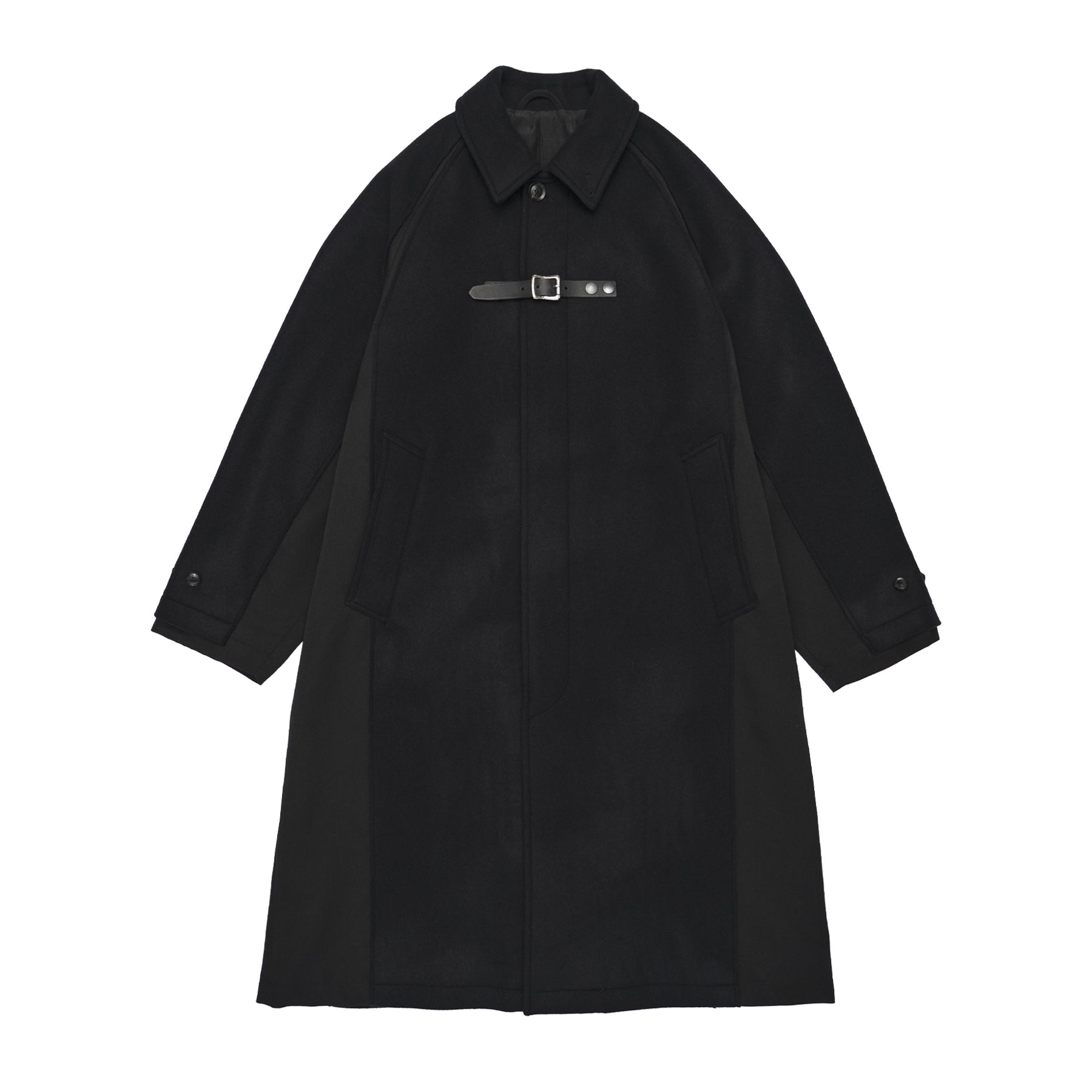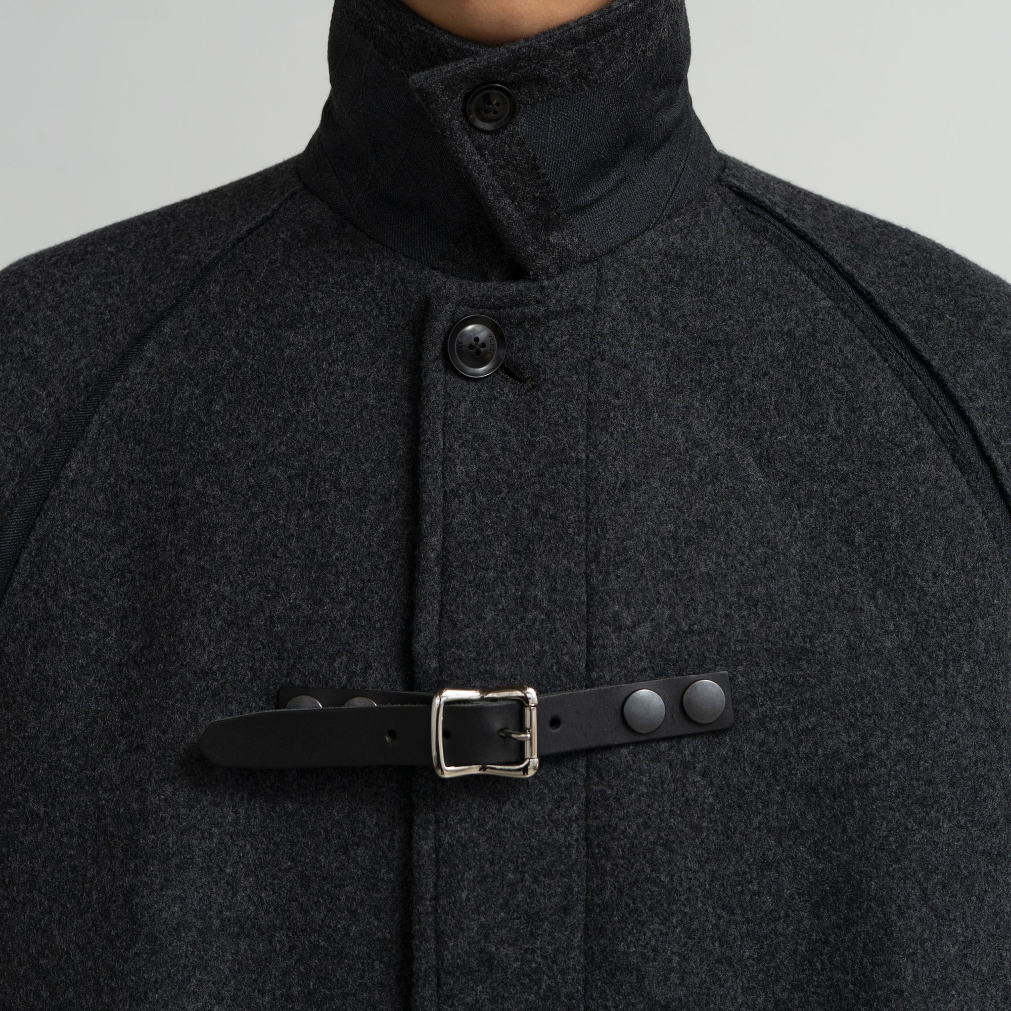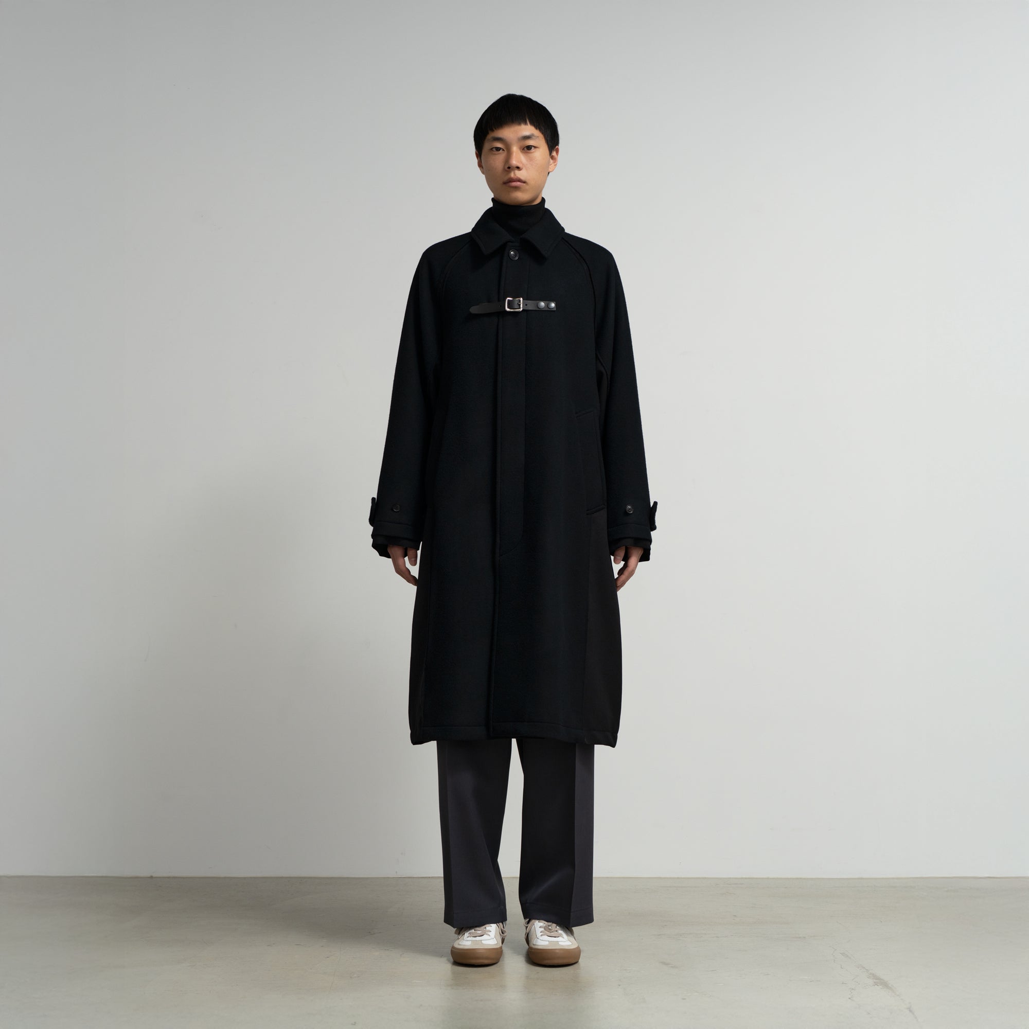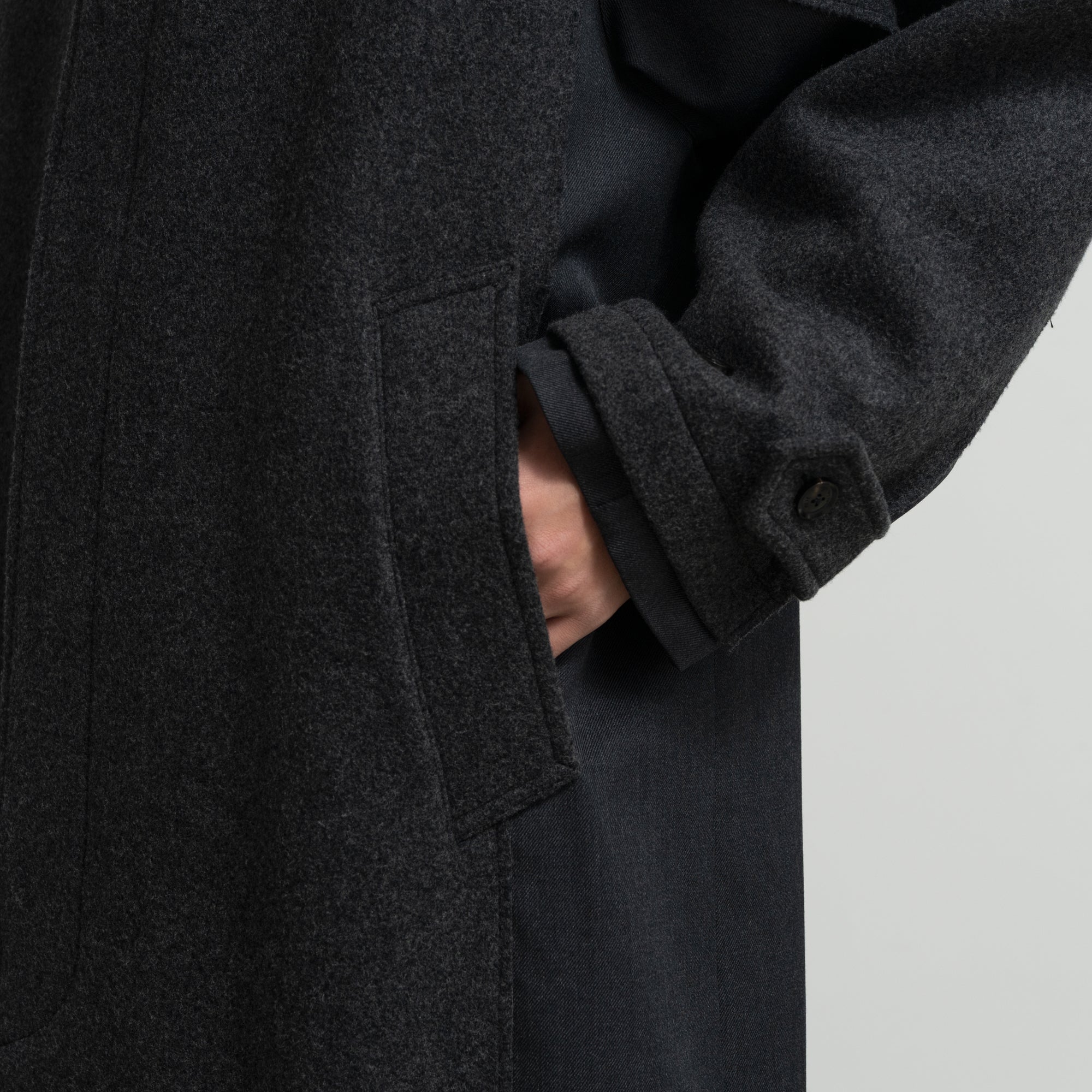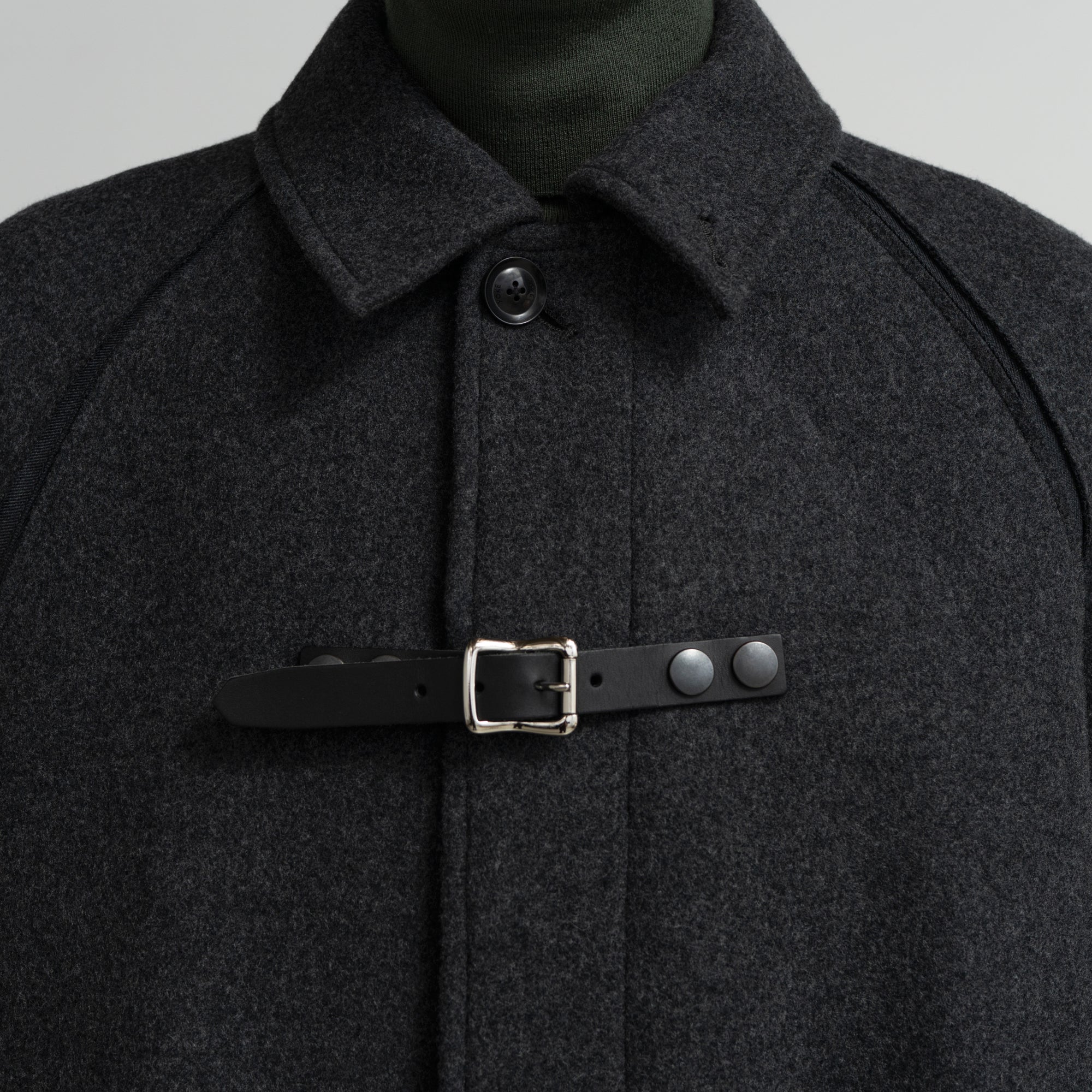 上質なウールカシミヤメルトンを贅沢に使用した、コネクテッドバルマカーンオーバーコート。YOKEのアーカイブである「ドッキング仕様」を、Graphpaper 25AWのテーマである「コラージュ」として再構築した一着です。メルトンコートをベースに、脇から外袖にかけてウールギャバジンのコートをドッキング。異素材をコラージュしたような独創的なレイヤード感を表現しています。フロントに配されたレザーベルトはドットボタンで簡単に着脱可能で、スタイリングに応じた調整が可能。大ぶりの襟はスタンドカラーとしてボタン留めができ、襟裏に施したウールギャバジンの切り替えが立てた際の美しいコントラストを生み出します。メイン素材には高い保温性と滑らかな肌触りを備えたウールカシミヤメルトンを採用し、重厚感がありながらも、エレガントな落ち感を演出します。