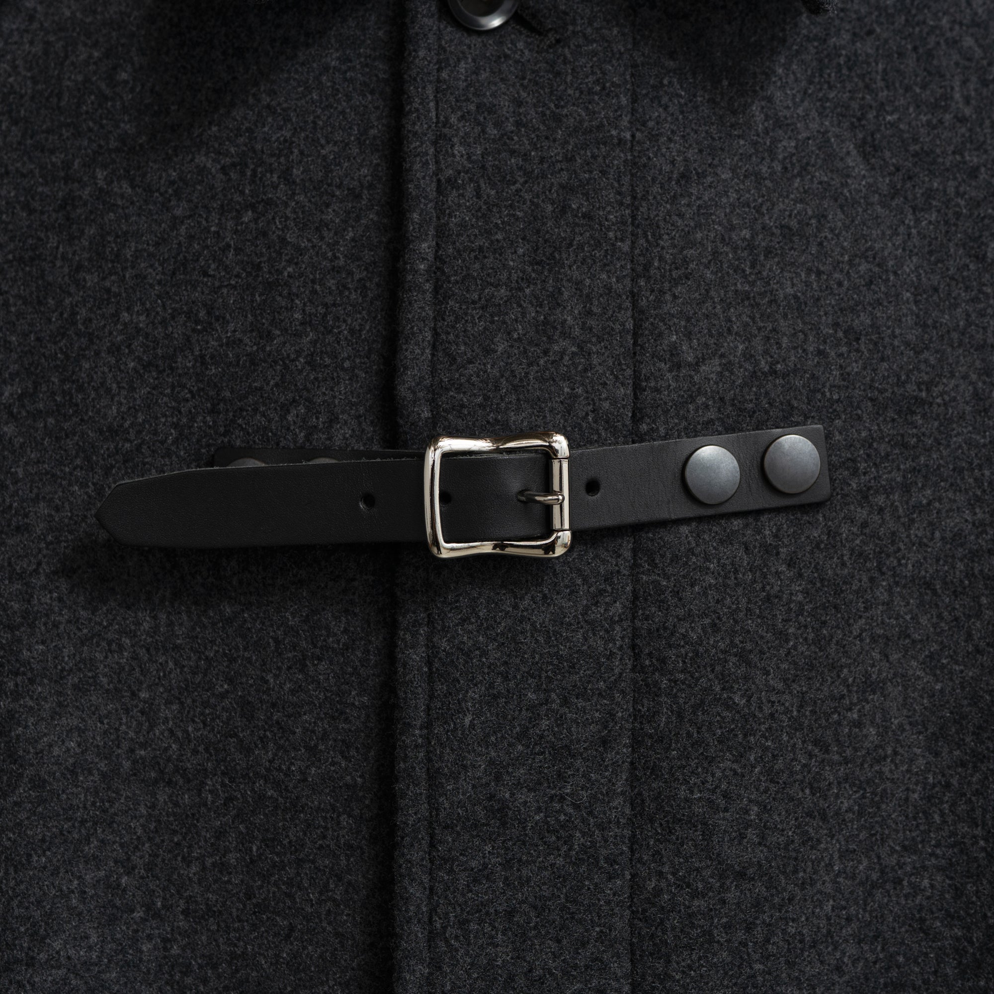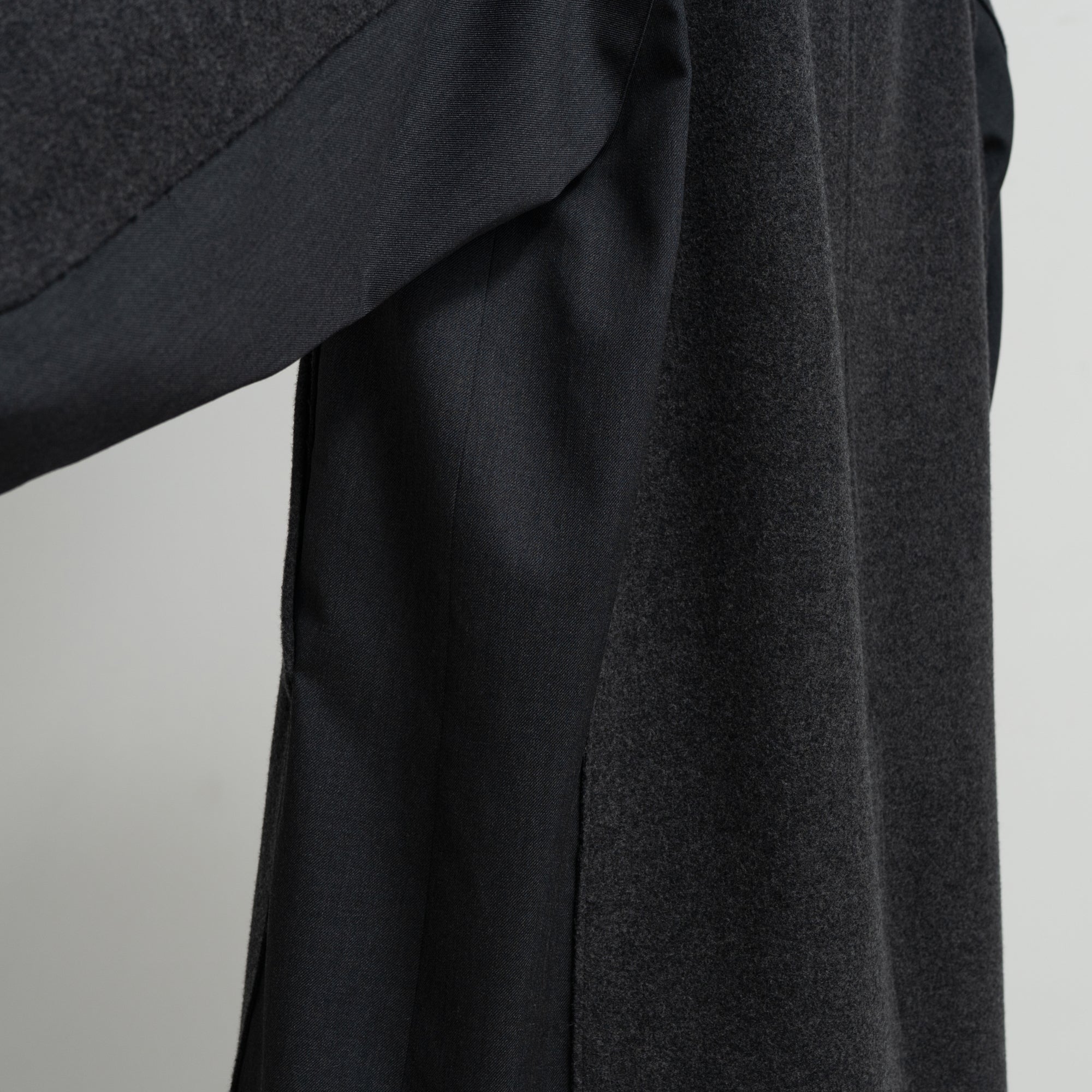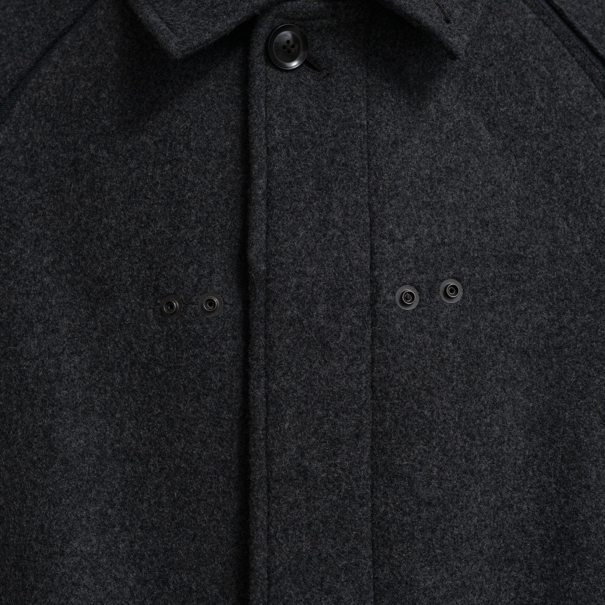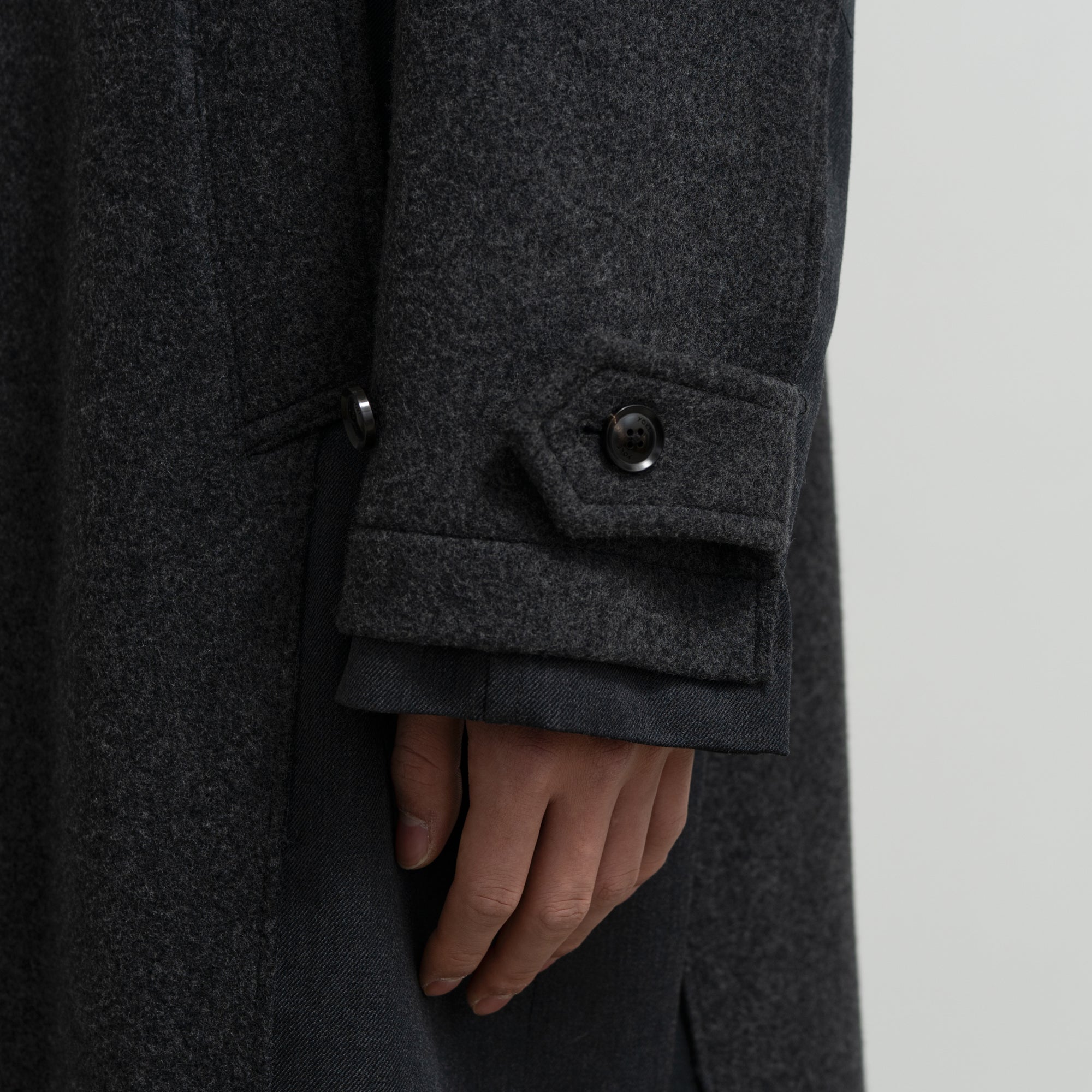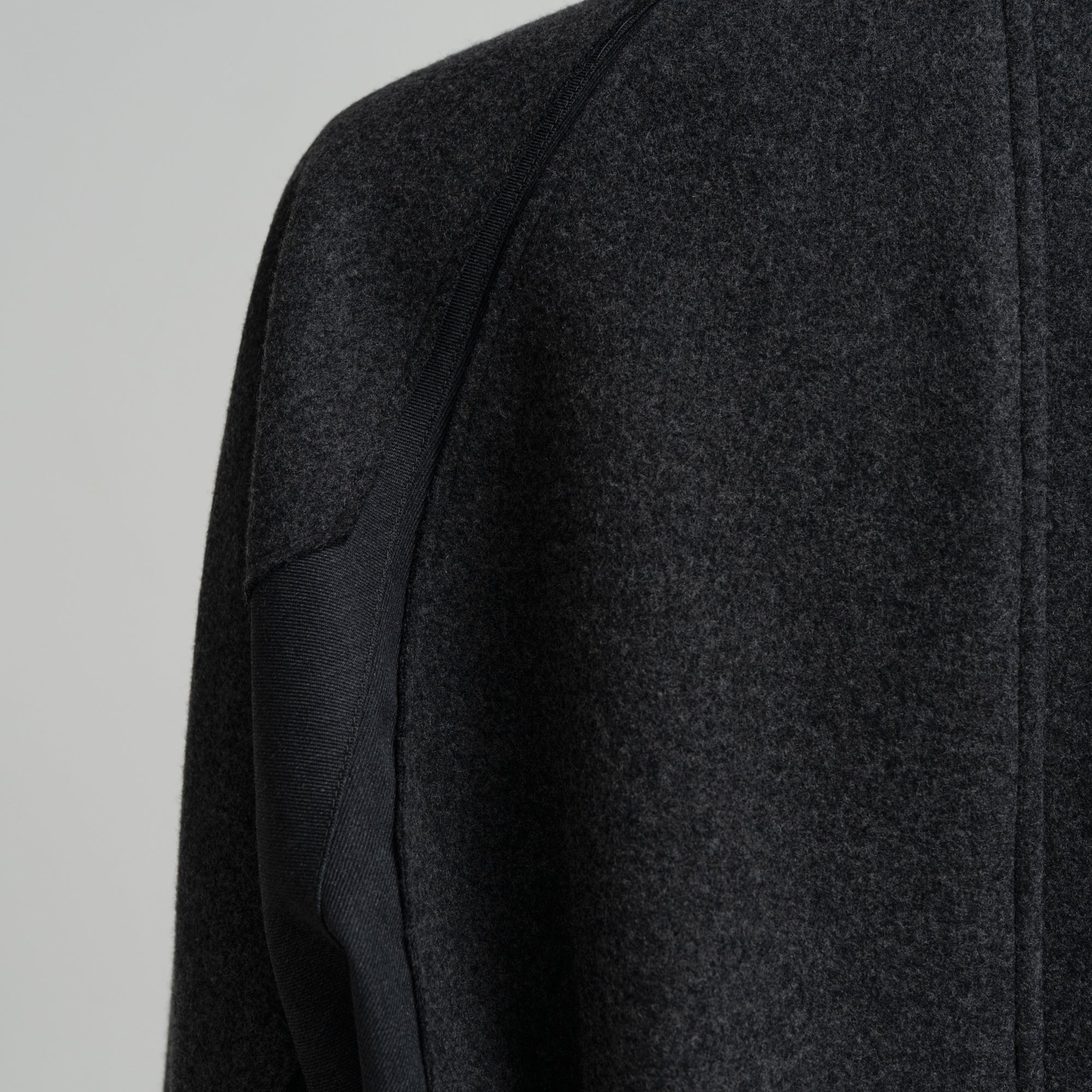 上質なウールカシミヤメルトンを贅沢に使用した、コネクテッドバルマカーンオーバーコート。YOKEのアーカイブである「ドッキング仕様」を、Graphpaper 25AWのテーマである「コラージュ」として再構築した一着です。メルトンコートをベースに、脇から外袖にかけてウールギャバジンのコートをドッキング。異素材をコラージュしたような独創的なレイヤード感を表現しています。フロントに配されたレザーベルトはドットボタンで簡単に着脱可能で、スタイリングに応じた調整が可能。大ぶりの襟はスタンドカラーとしてボタン留めができ、襟裏に施したウールギャバジンの切り替えが立てた際の美しいコントラストを生み出します。メイン素材には高い保温性と滑らかな肌触りを備えたウールカシミヤメルトンを採用し、重厚感がありながらも、エレガントな落ち感を演出します。