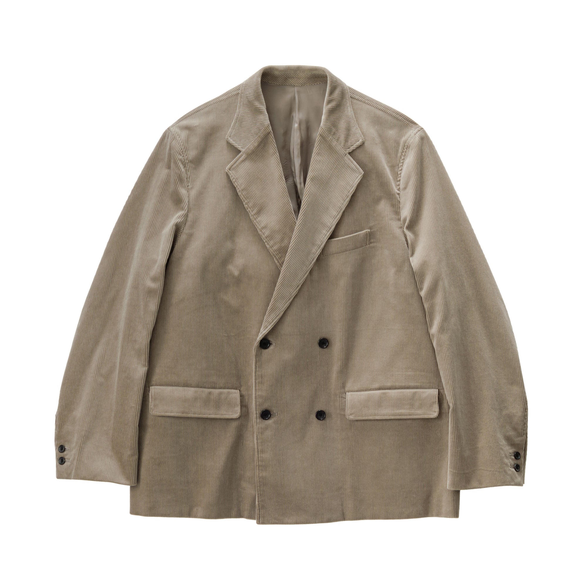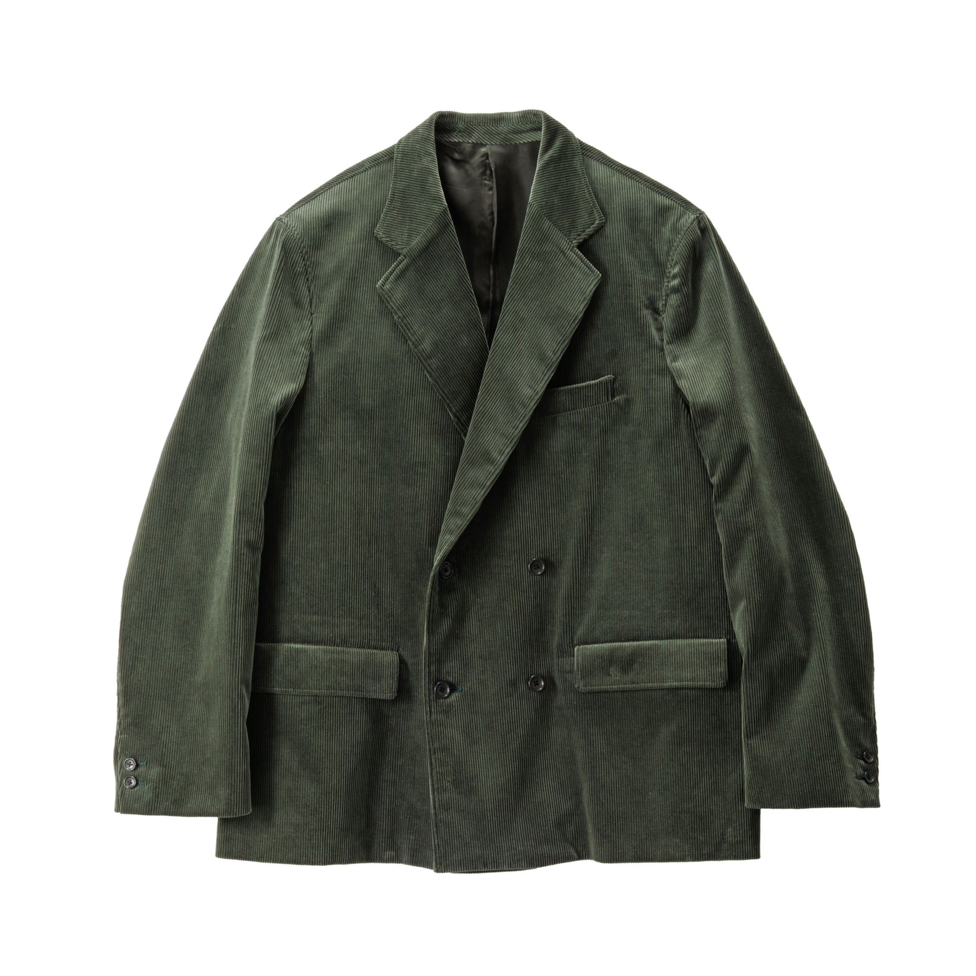 希少なスビンゴールドコットンを用いて織り上げたコーデュロイ生地。柔らかくしなやかな手触りと、太い畝一本一本の深味ある光沢、さらに美しい発色が特徴的な上品な素材。肩幅をコンパクトに構成しながら、バストから裾にかけてたっぷりのゆとりを持ったシルエットバランスに仕上げたダブルジャケット。