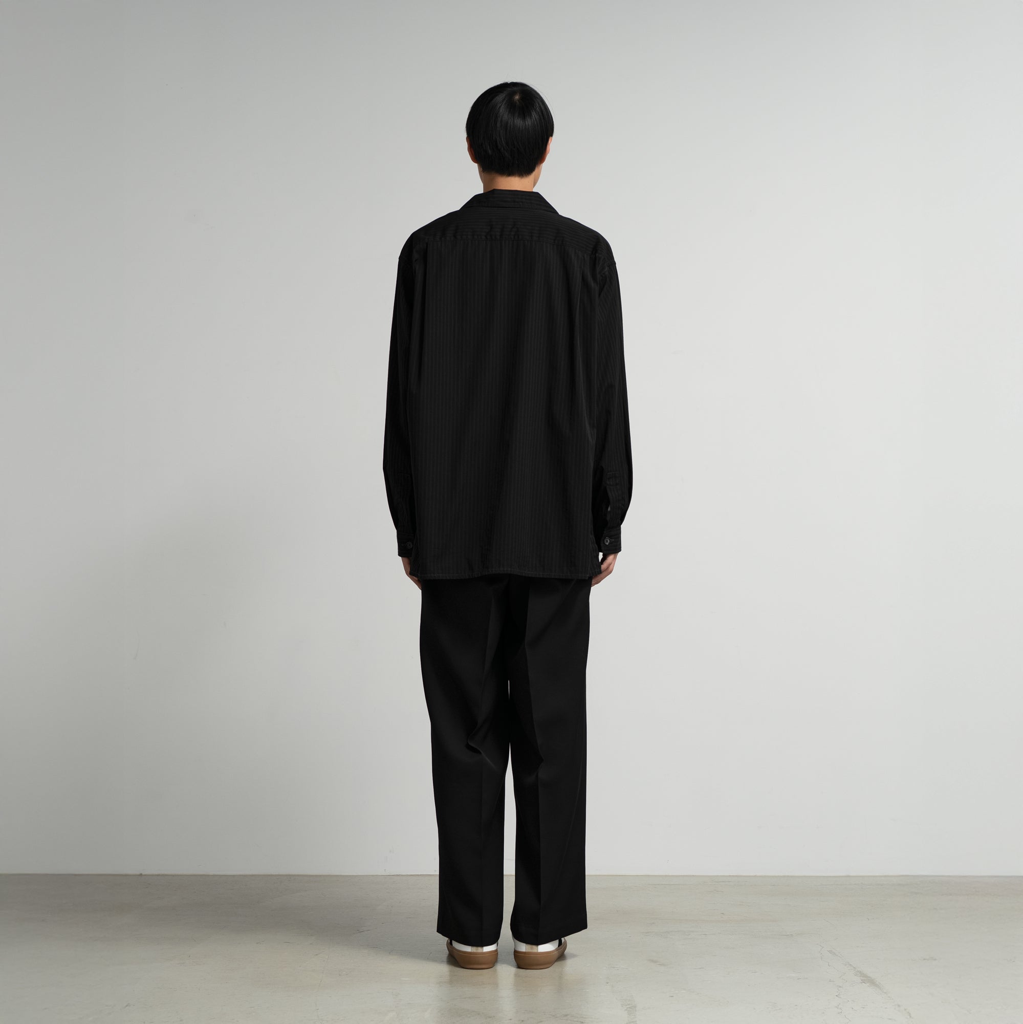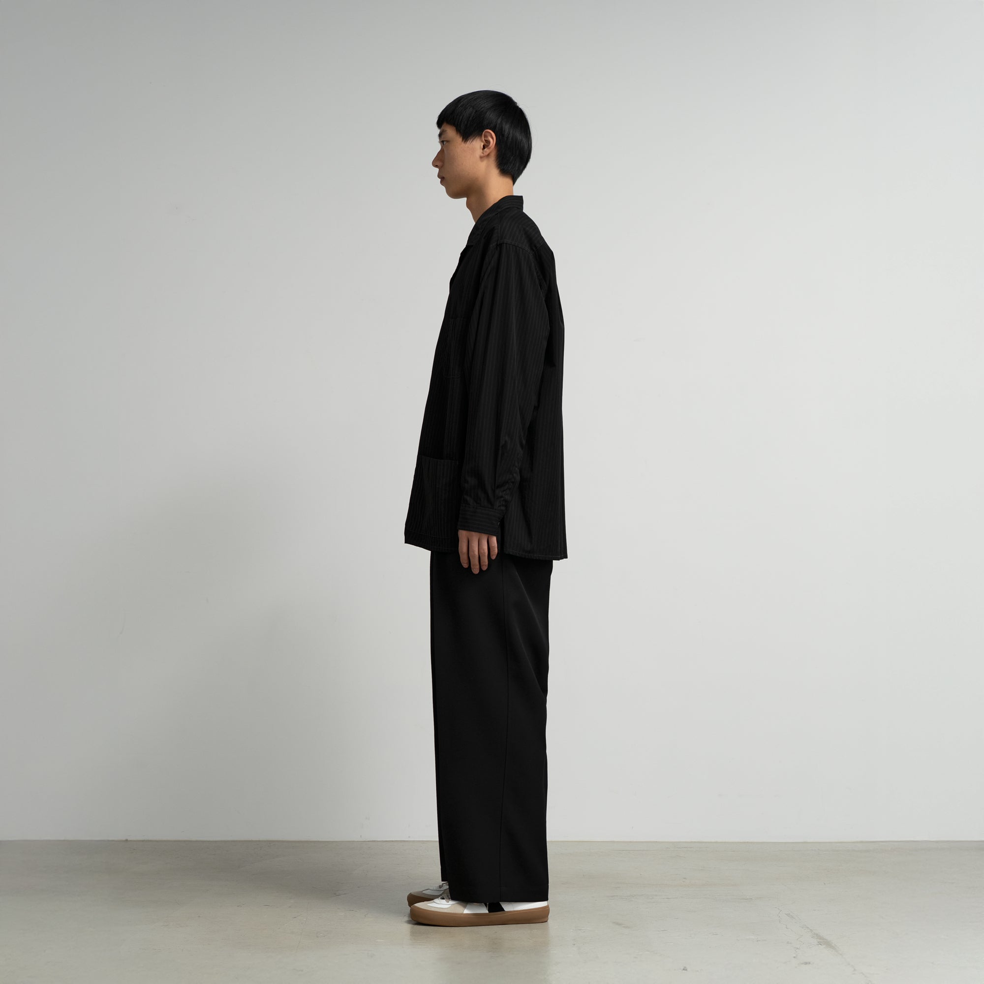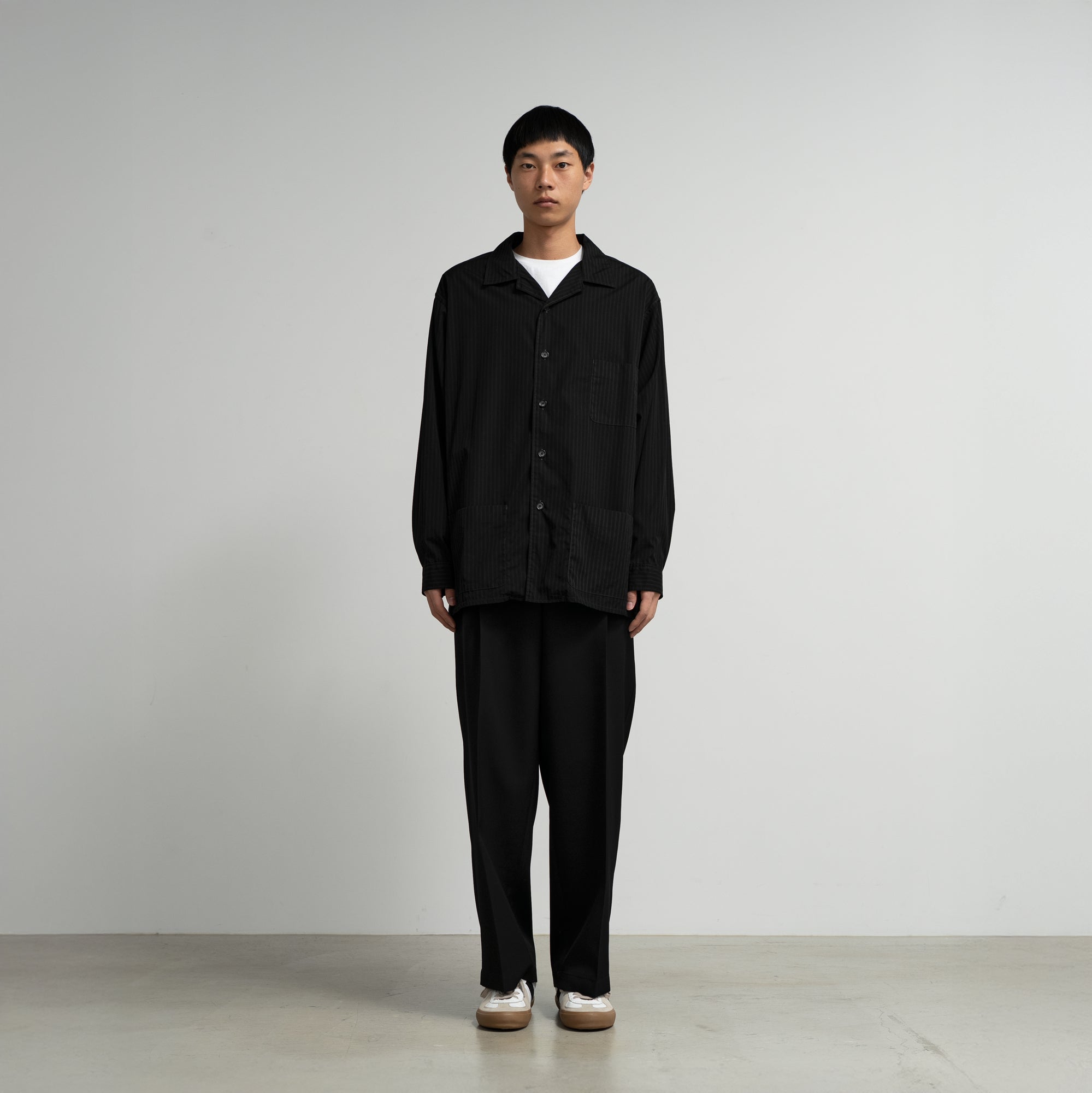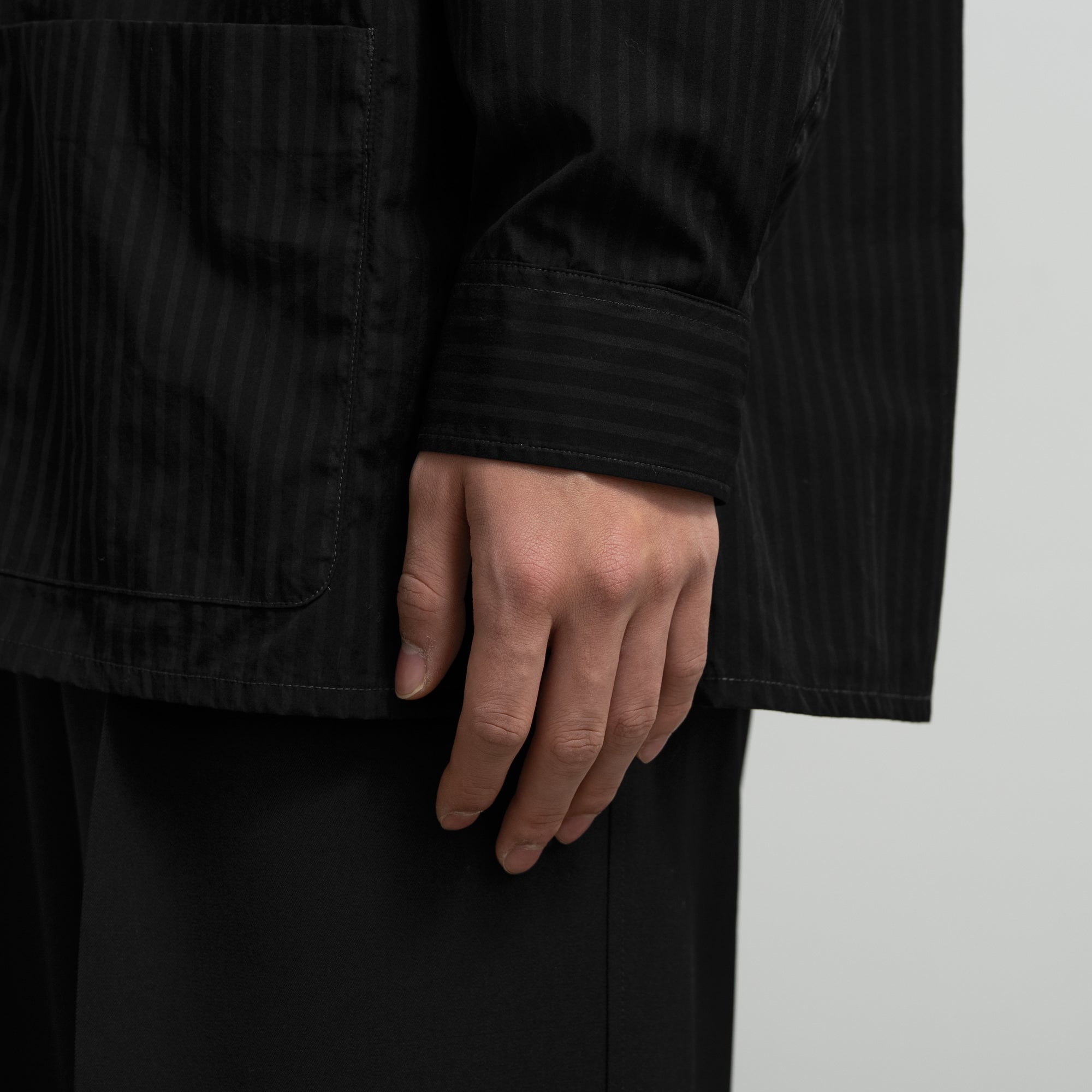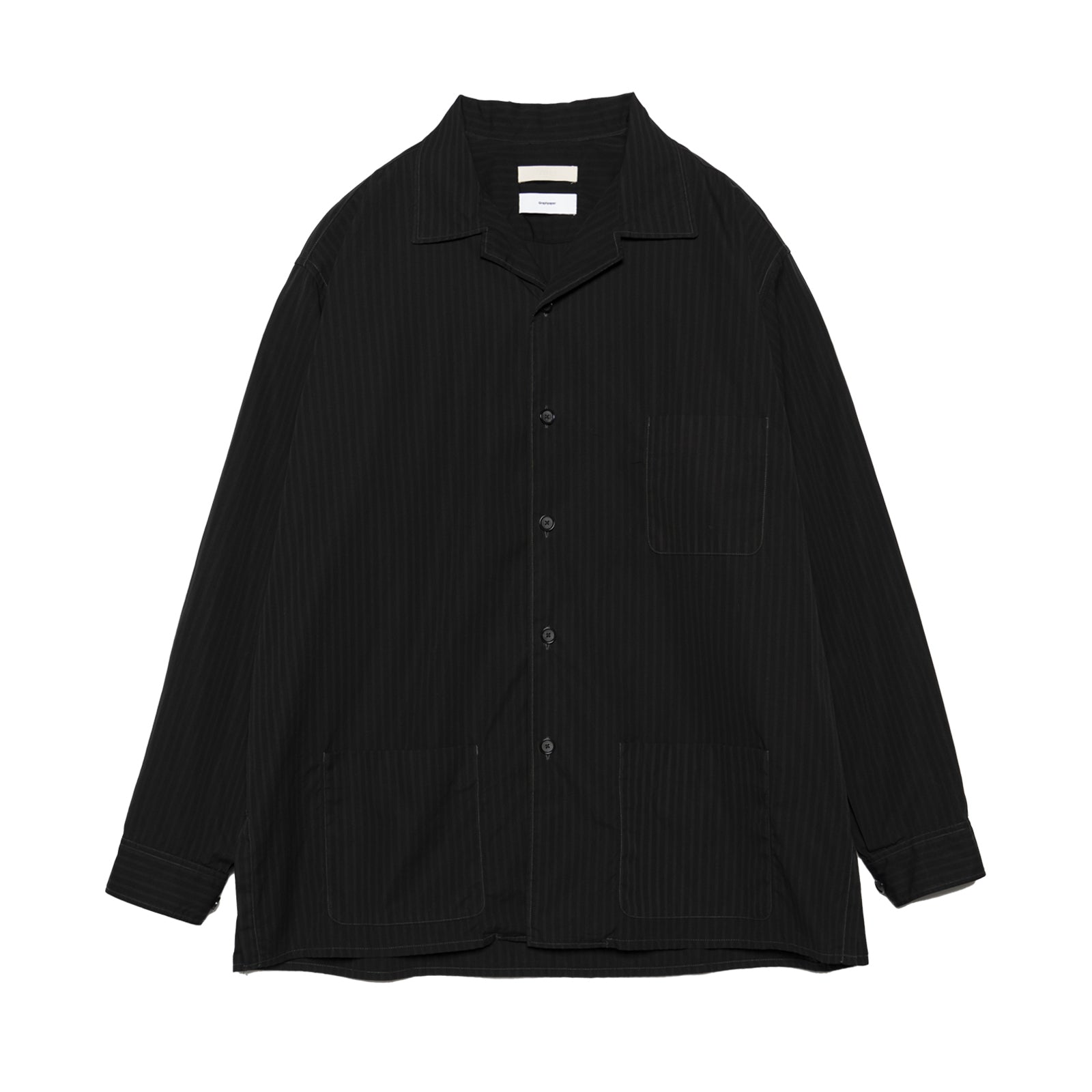 Graphpaperのコットンストライプタイプライターを用いた、新型のガーメントダイシャツジャケット。カバーオールのワーク感とシャツの軽快さを併せ持つ、汎用性の高い一着です。ワークジャケットをベースにしながら、胸や腰のポケットを小ぶりに設計することで、クリーンで上品な印象に。製品染め後にタンブラー乾燥を施し、肌に自然と馴染むこなれた質感を表現しています。限りなく黒に近い色調で染め上げることで、光の当たり方によって繊細なシャドーストライプが浮かび上がる、奥行きのある表情が特徴です。