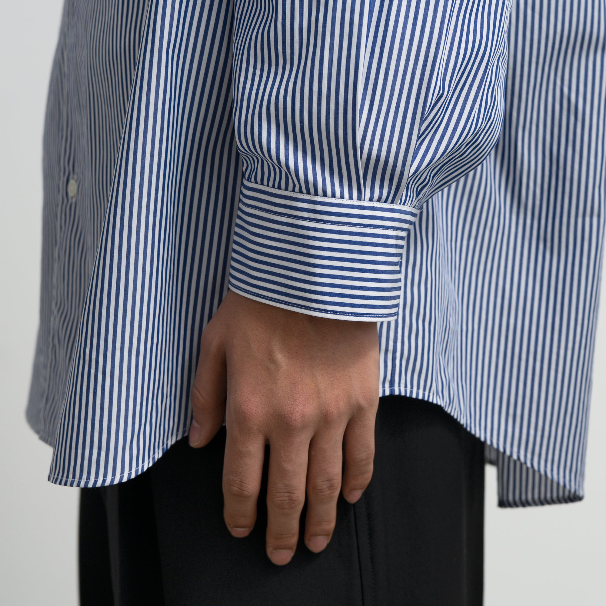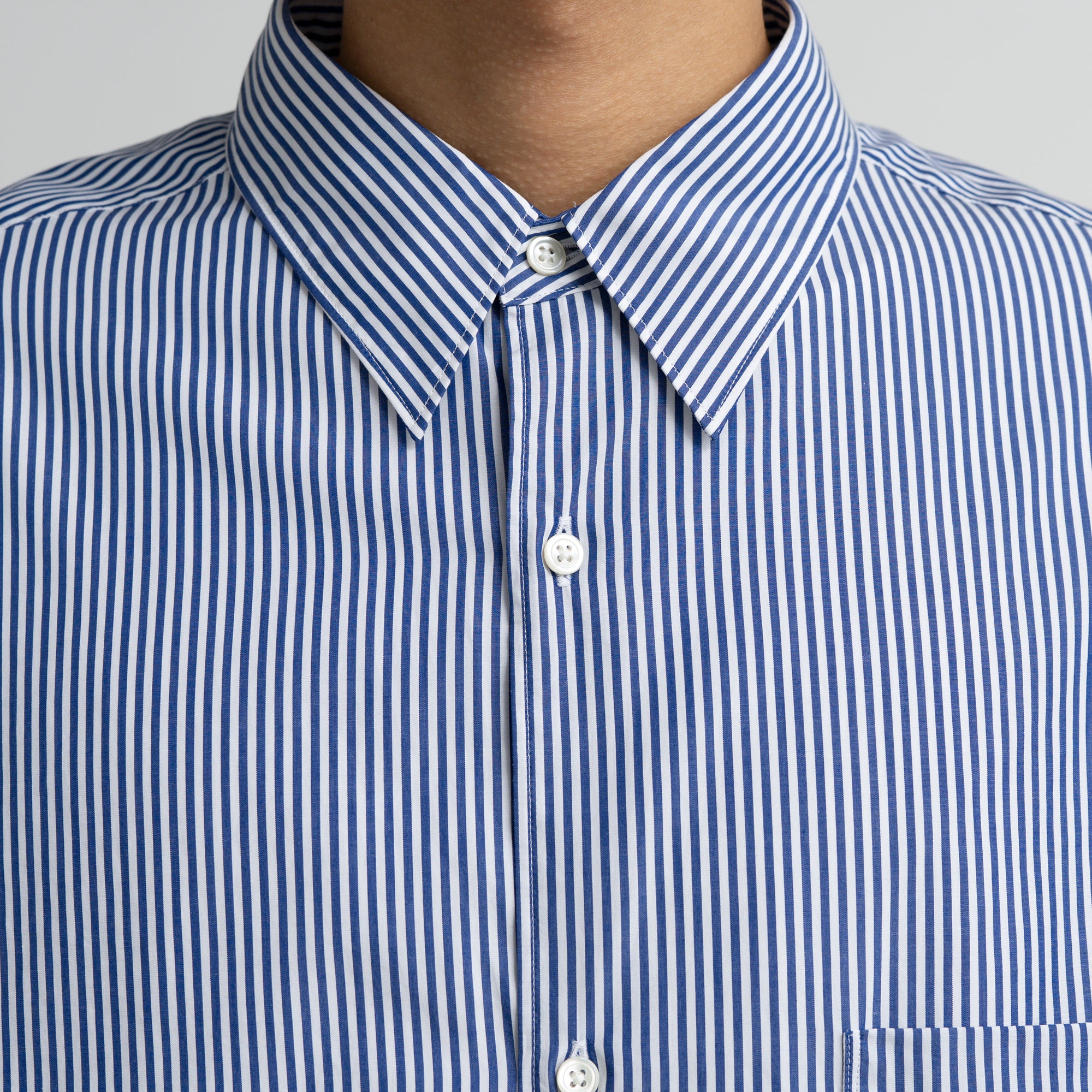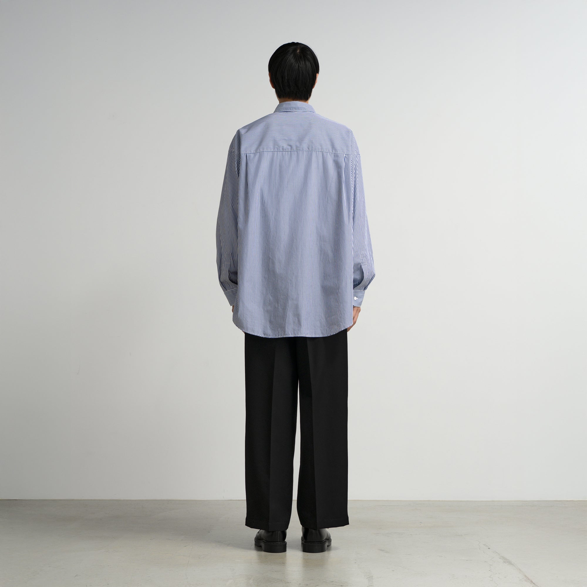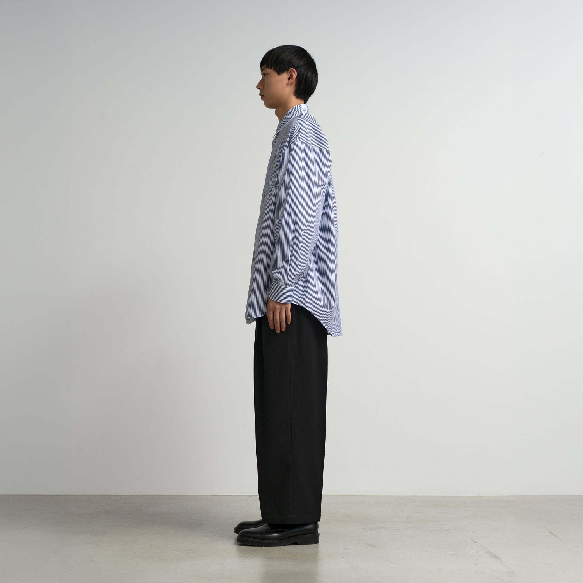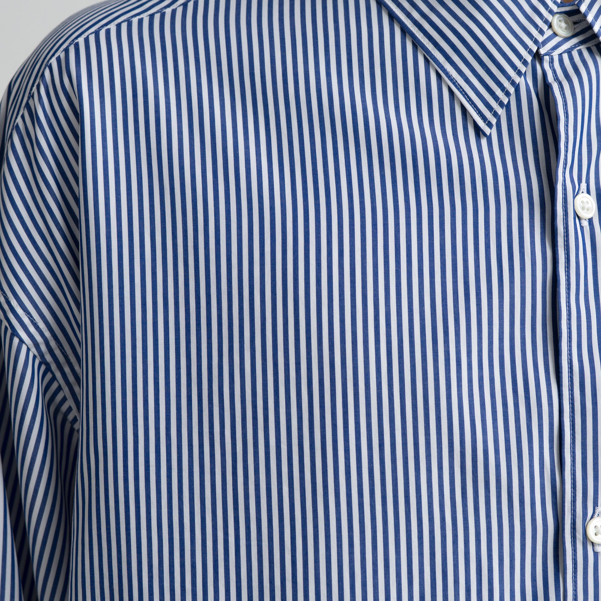 なめらかに整った繊維そのものの光沢感と、均一な撚りにより毛羽立ちにくい超長綿であるスーピマコットン。非常に繊細な糸番手で製織したストライプのブロード生地を使用。高級シーツにも使用されている生地で適度なハリと柔らかさがあり着心地が非常に良い。ドロップショルダーでボリュームのあるボックスシルエット。オーセンティックなレギュラーカラー。