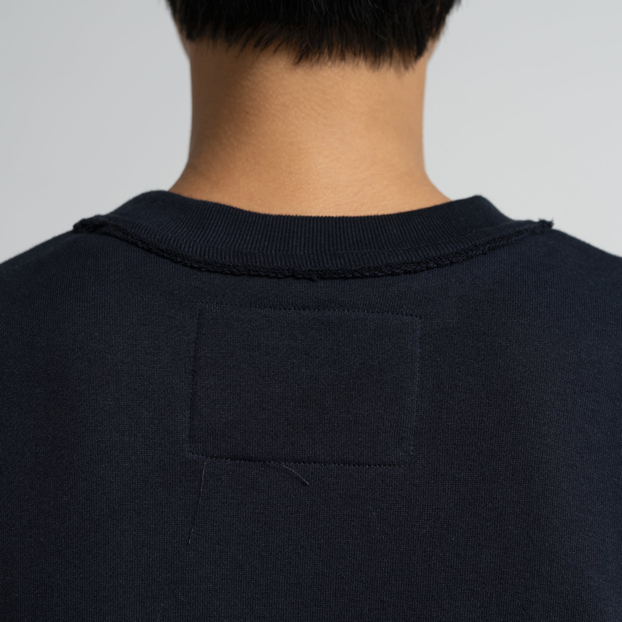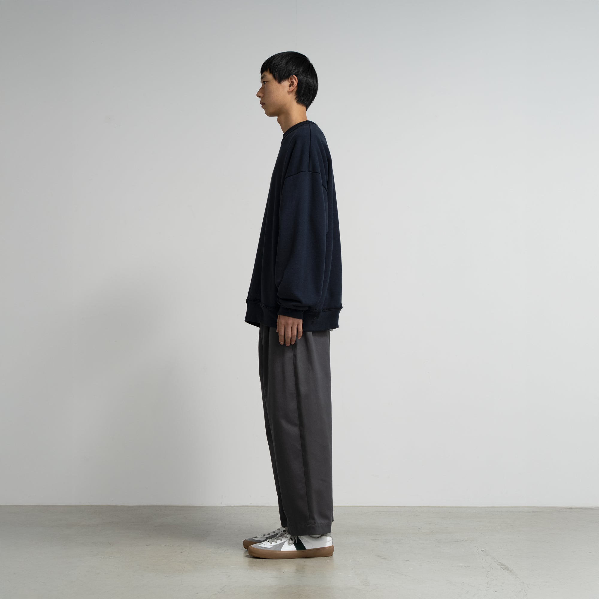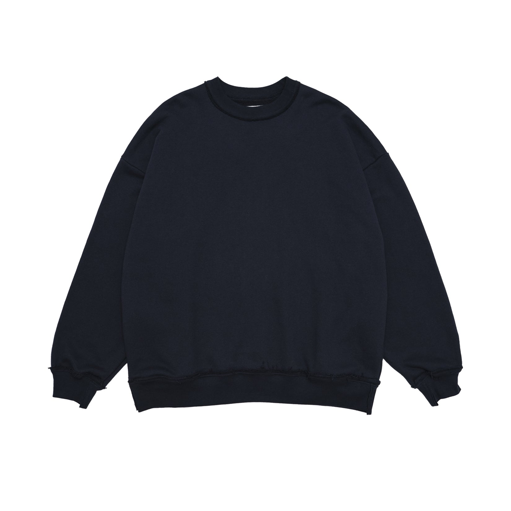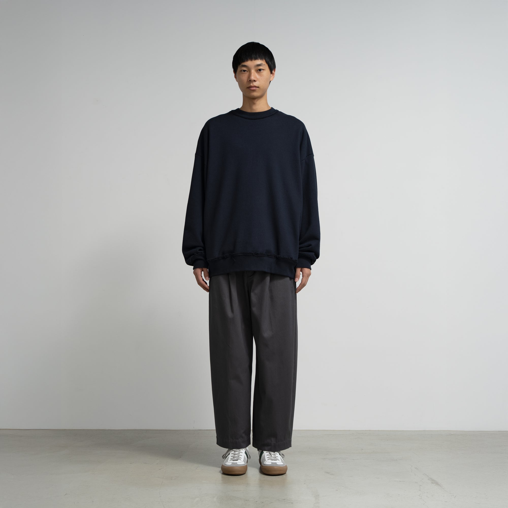 Graphpaper定番のAzuma Terry Crew NeckをCAMIEL FORTGENSが再構築。襟ぐり・袖口・裾に施されたカットオフリブが、未完成の表情を演出。希少な東編み機で編み立てられたオリジナル裏毛素材を使用し、表面は整った天竺、裏面は均一なループが特徴です。