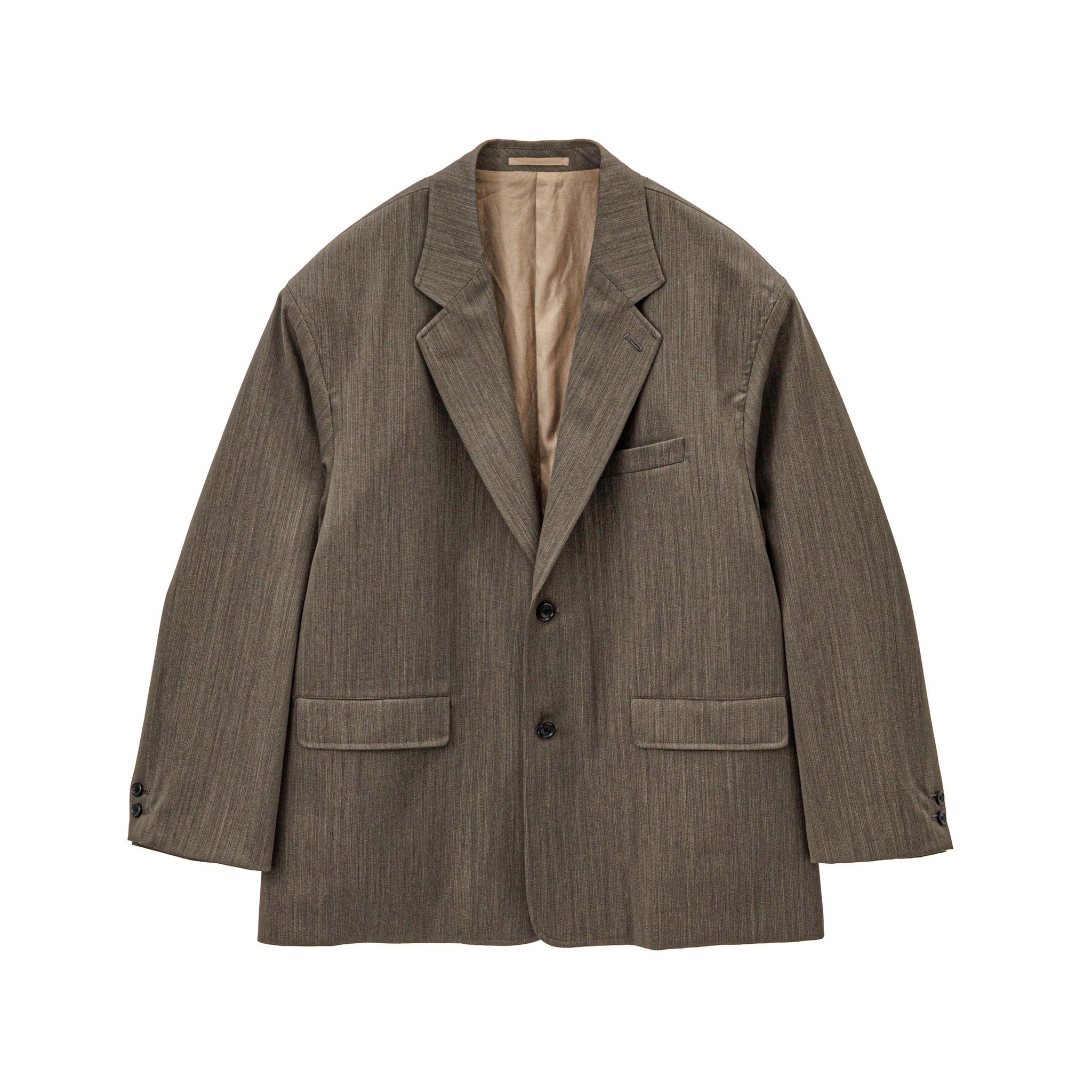 80'sのムードを纏う組織感の際立つメランジウールのミニヘリンボン生地。膨らみのあるウールとポリエステルを限界まで撚糸することで細かいチラついた撚り杢の表情が印象的。アメリカンアイビーのテーラードを再編集したオーバーサイズ2ボタンジャケット。フラワーホールでも留めることのできる仕様。