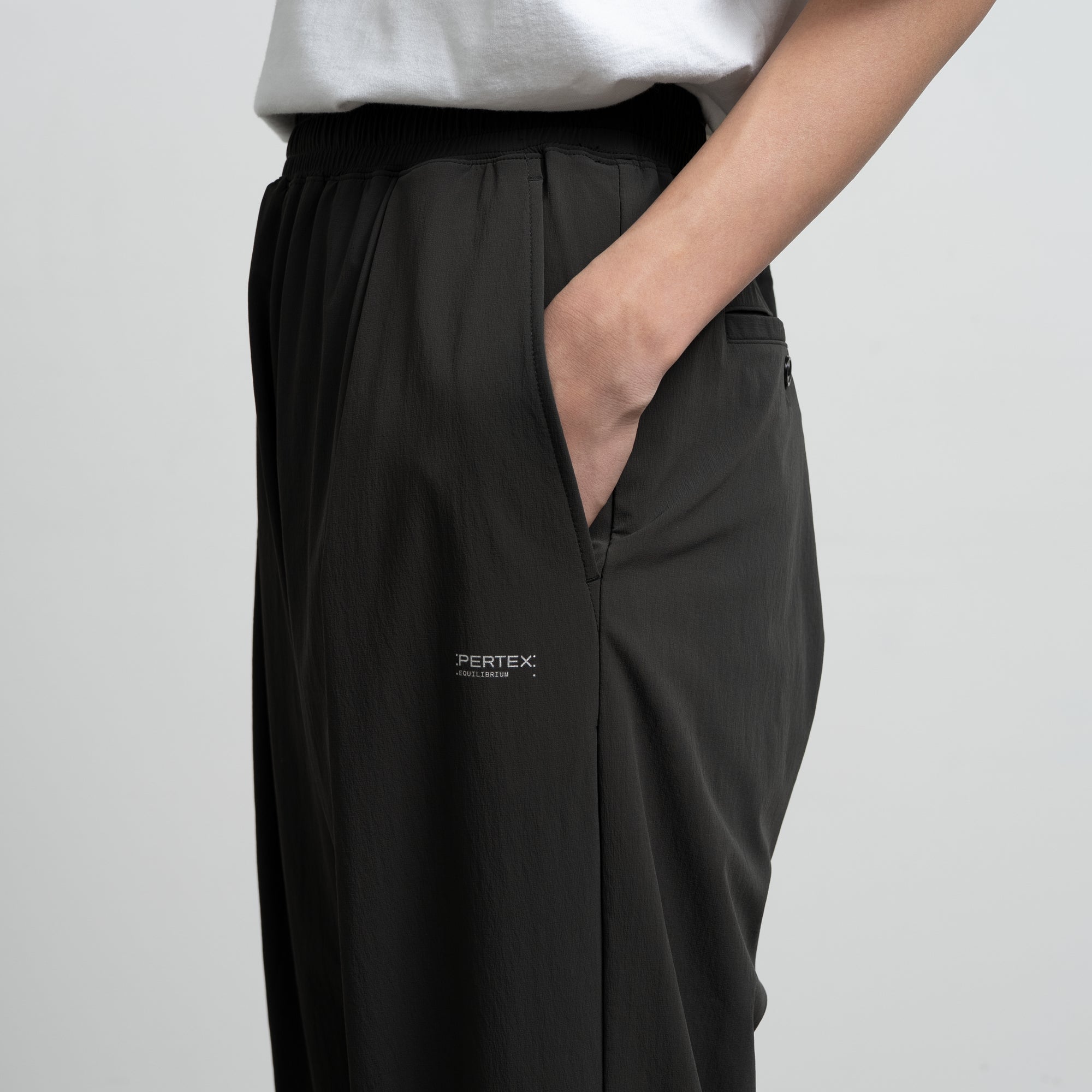 軽量かつ高い耐久性を誇り、加えて抜群の速乾性・透湿性により最適な衣類内環境を整える PERTEX® Equilibrium。ゆったりとしたリラックス感のあるイージーパンツ。
