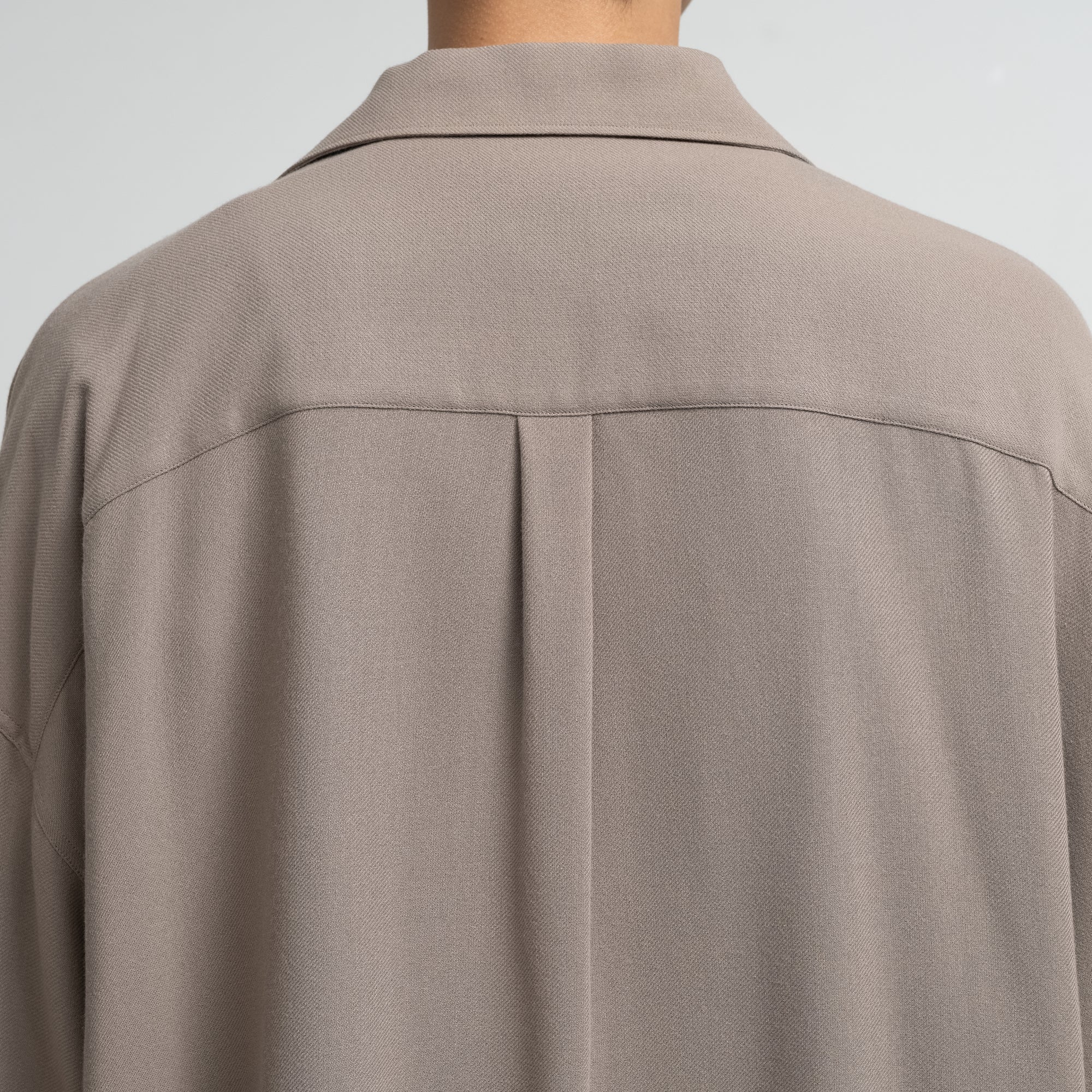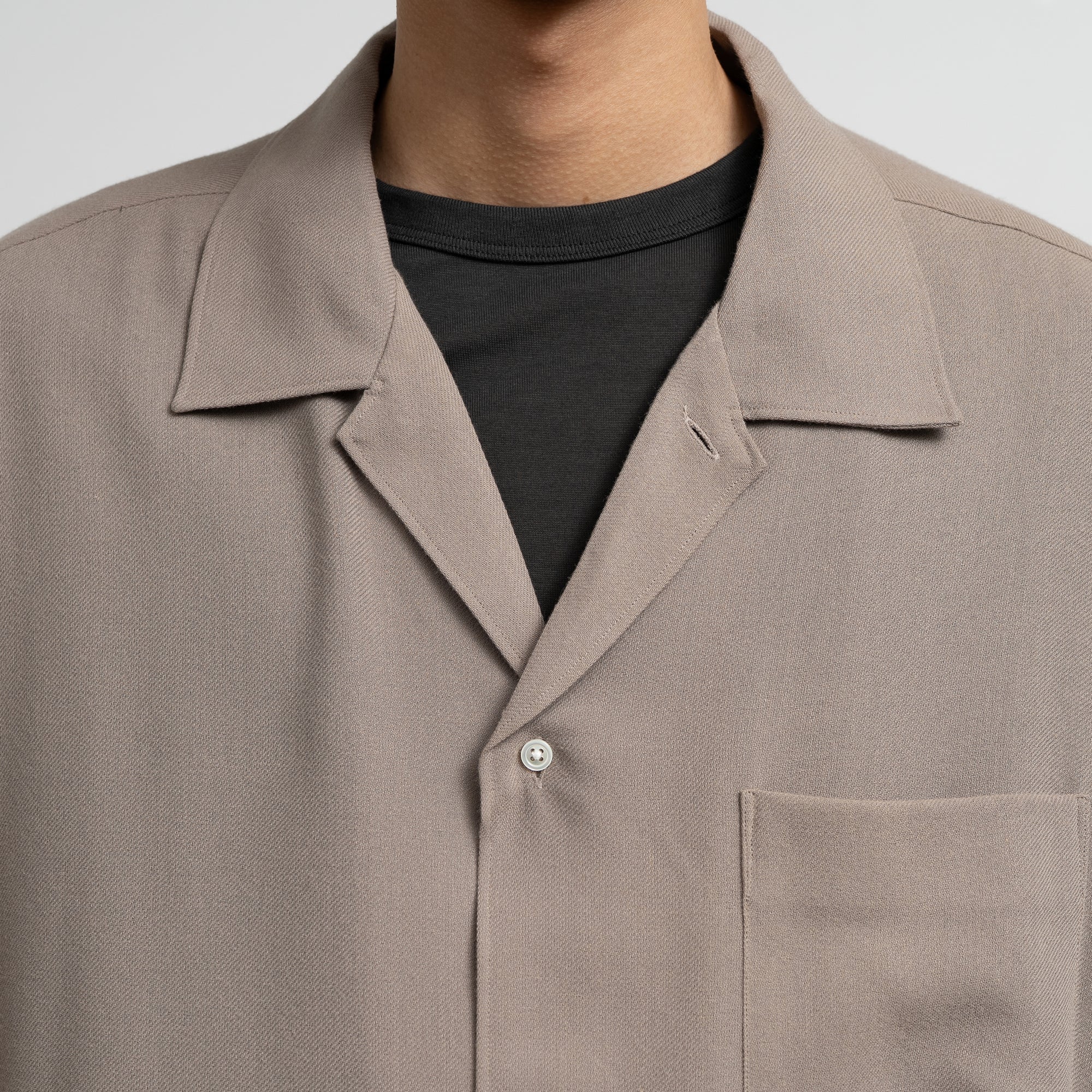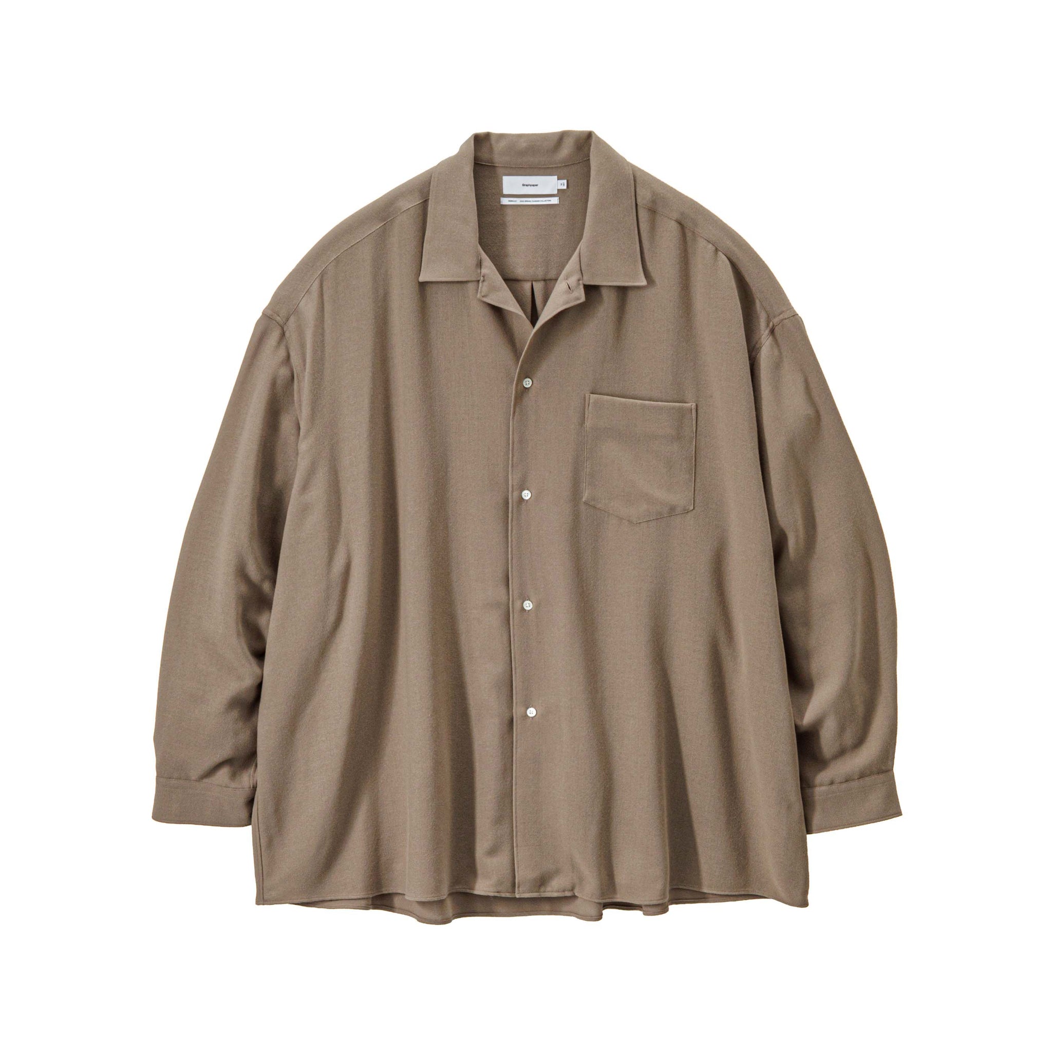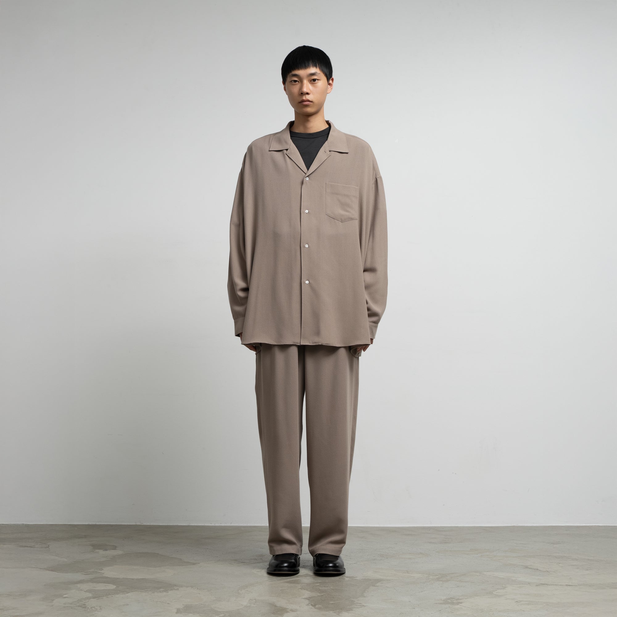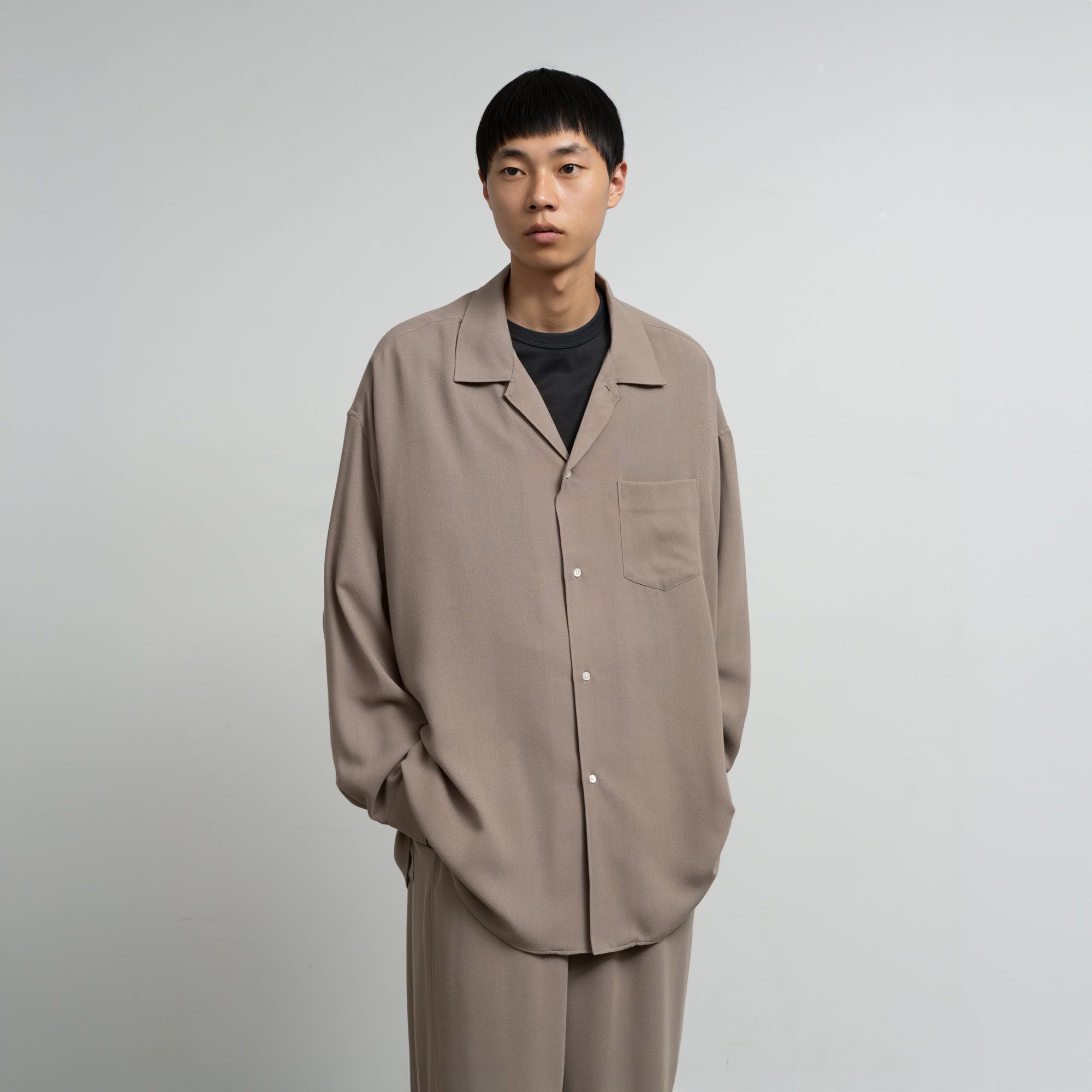 ビスコースとポリエステルの強撚糸を用いたビエラ素材。強撚糸を使うことでドライなタッチとサラサラとした清涼感ある風合いを生み出し、仕上げの加工でワッシャー加工を施すことで、柔らかさを両立。ゆったりとした身幅を持った開衿のスリーピングシャツ。