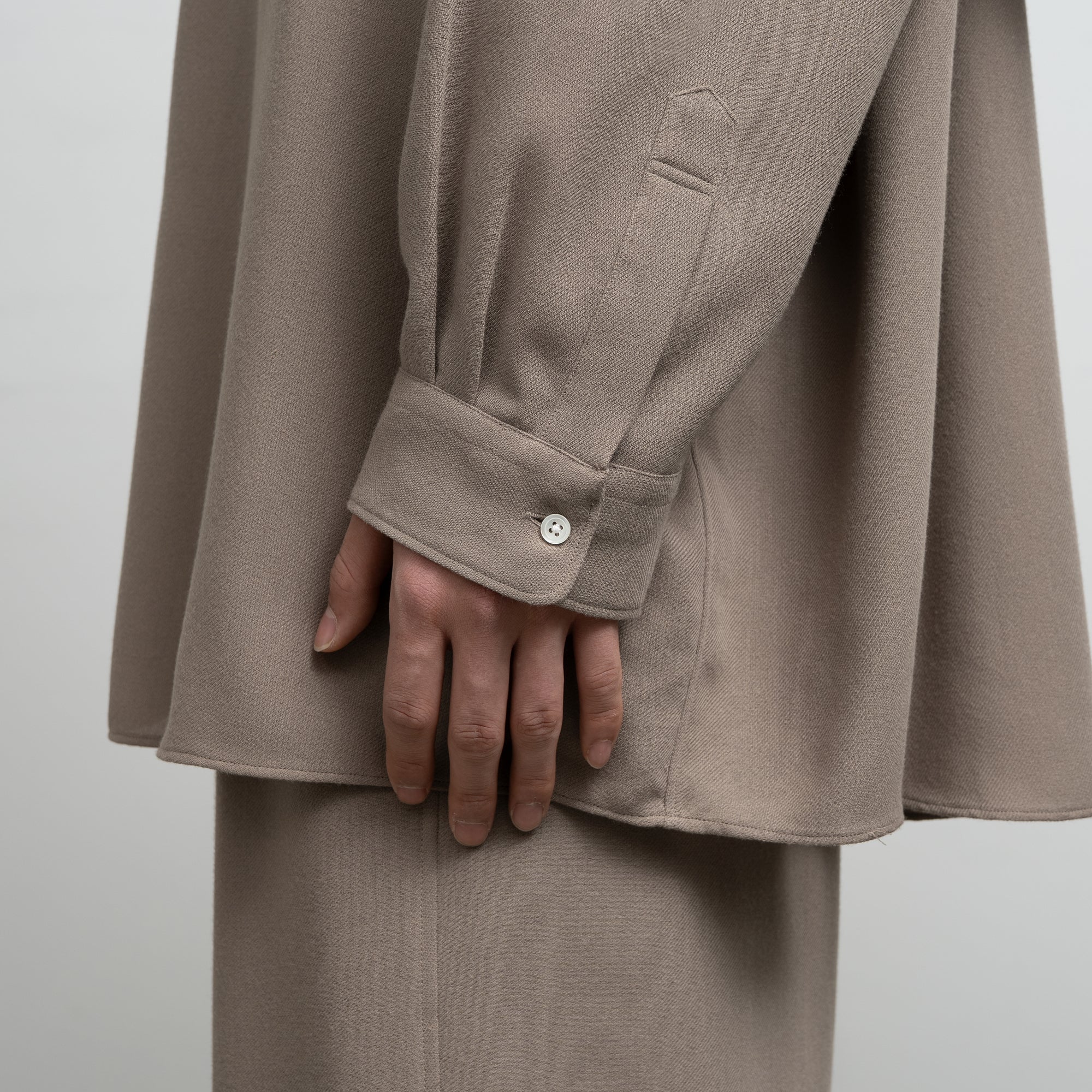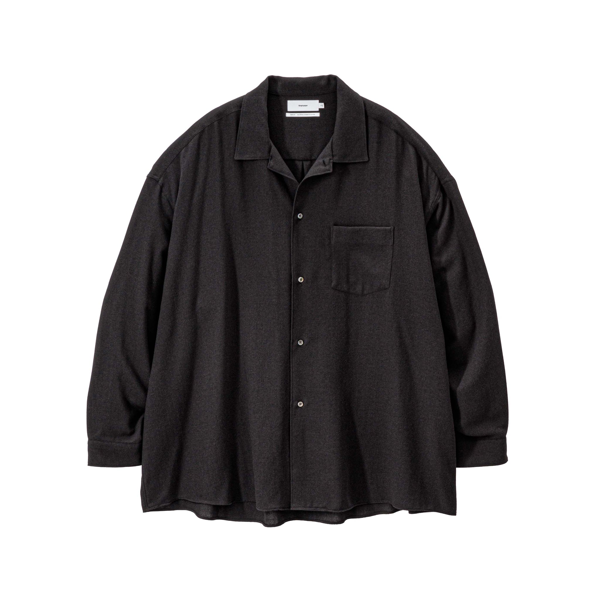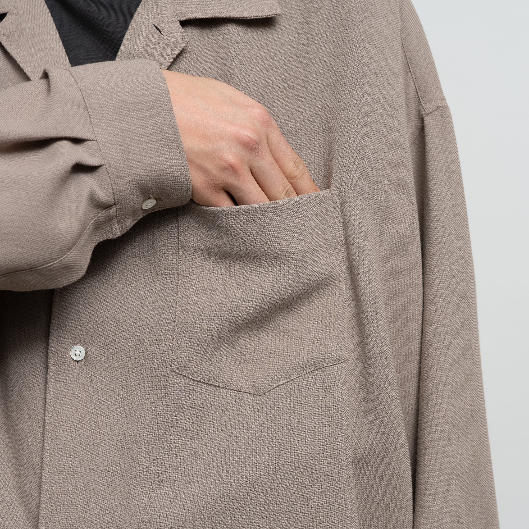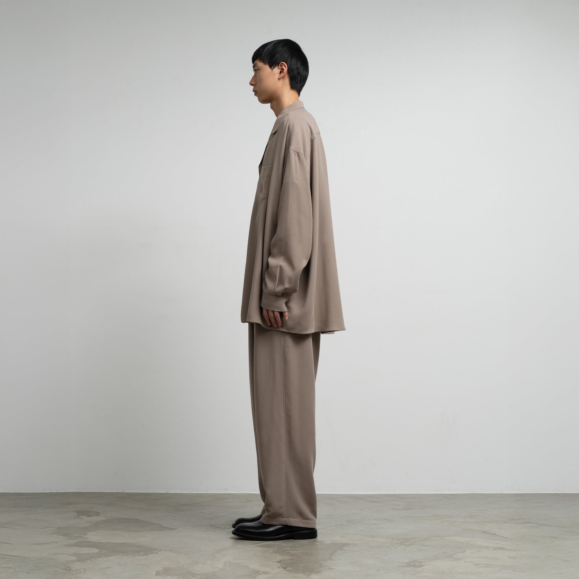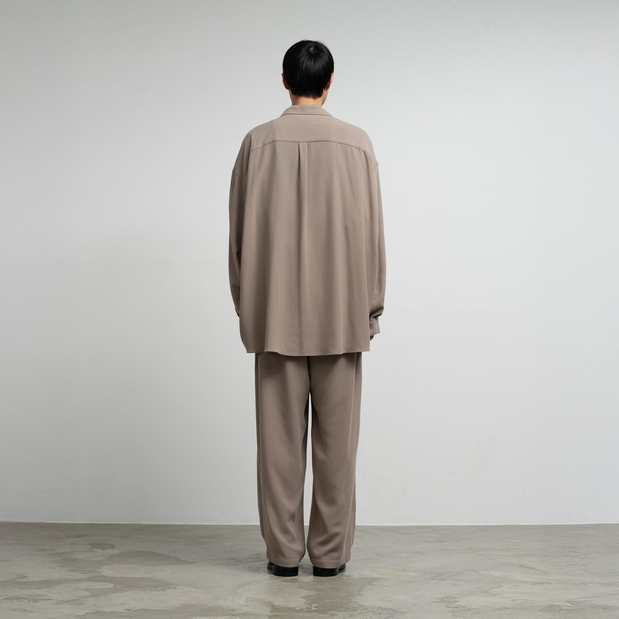 ビスコースとポリエステルの強撚糸を用いたビエラ素材。強撚糸を使うことでドライなタッチとサラサラとした清涼感ある風合いを生み出し、仕上げの加工でワッシャー加工を施すことで、柔らかさを両立。ゆったりとした身幅を持った開衿のスリーピングシャツ。