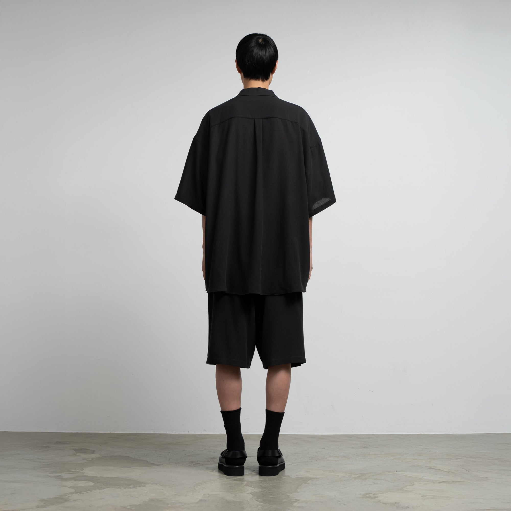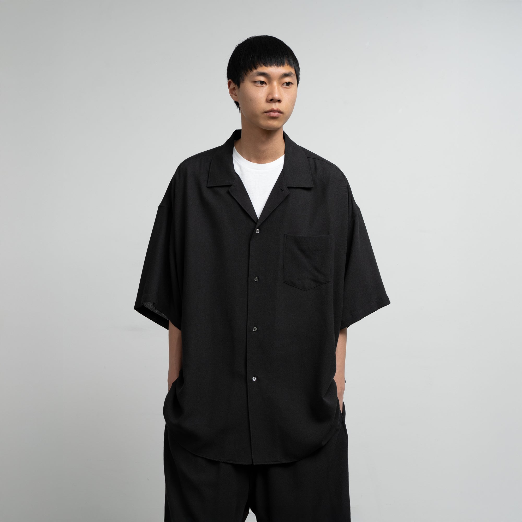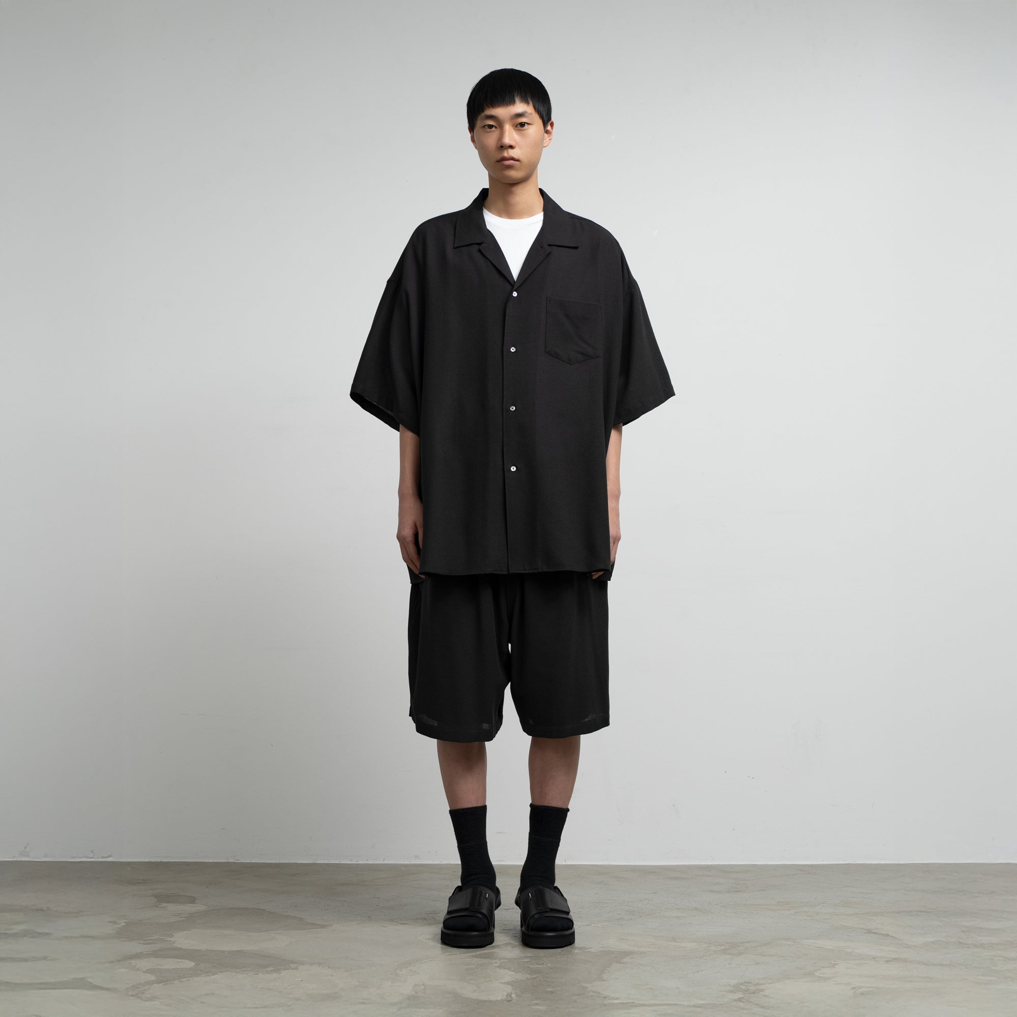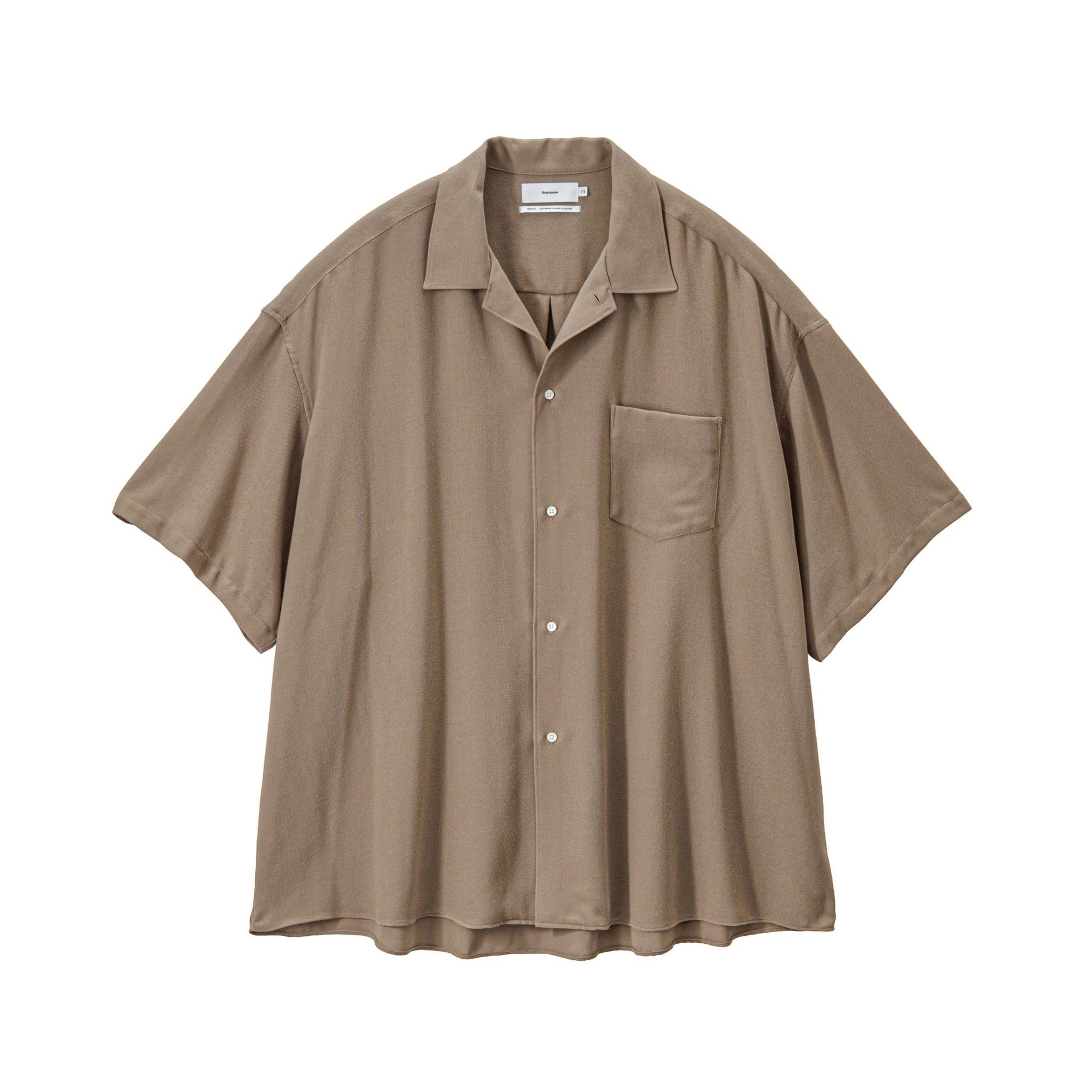 ビスコースとポリエステルの強撚糸を用いたビエラ素材。強撚糸を使うことでドライなタッチとサラサラとした清涼感ある風合いを生み出し、仕上げの加工でワッシャー加工を施すことで、柔らかさを両立。ゆったりとした身幅を持った開衿の半袖スリーピングシャツ。