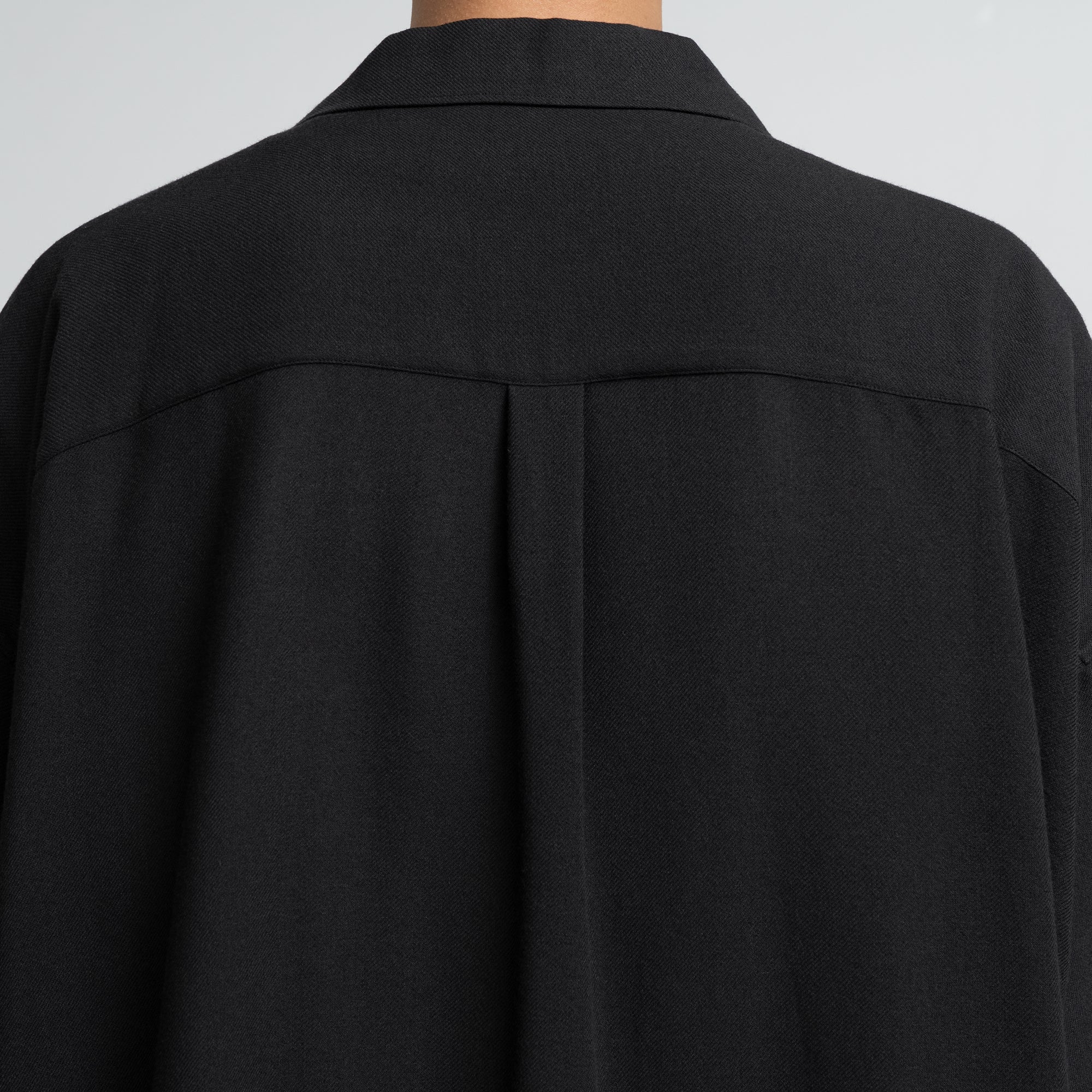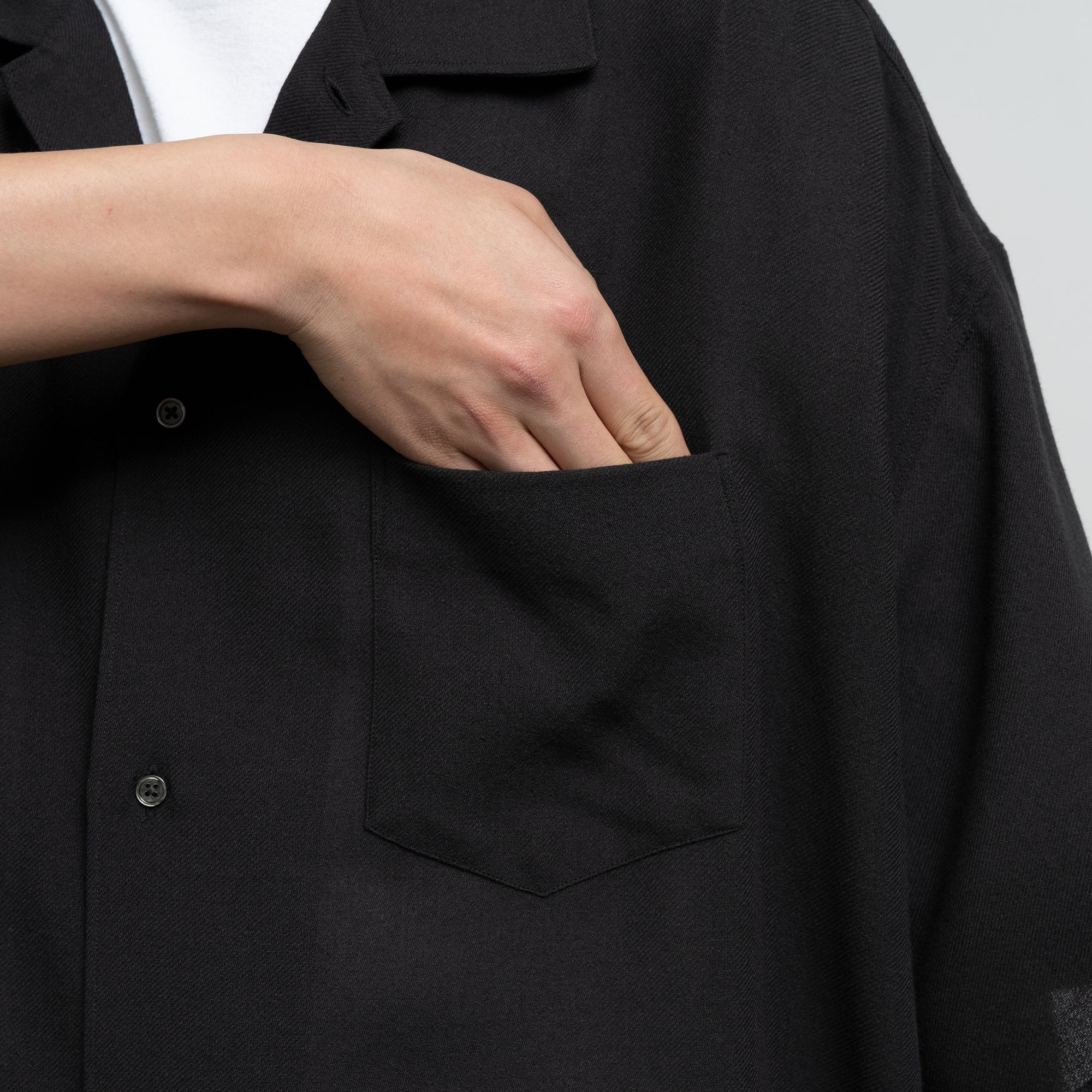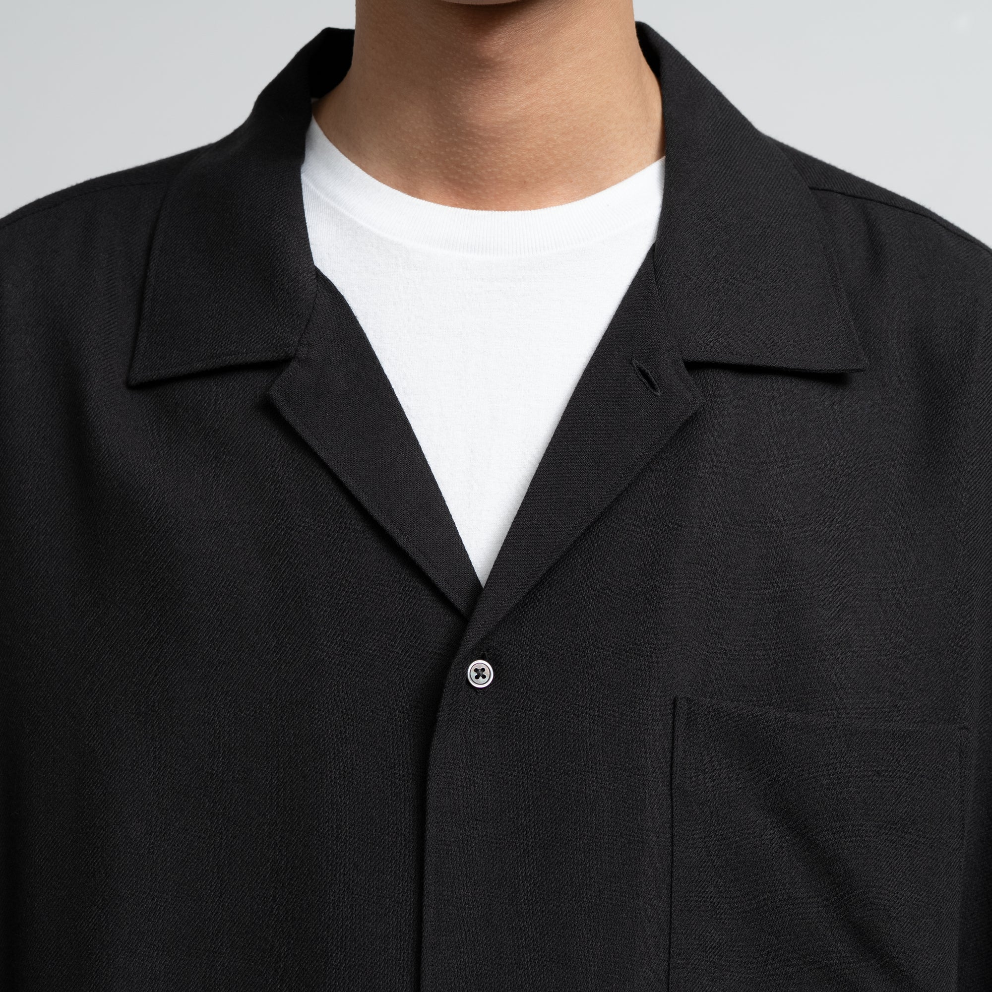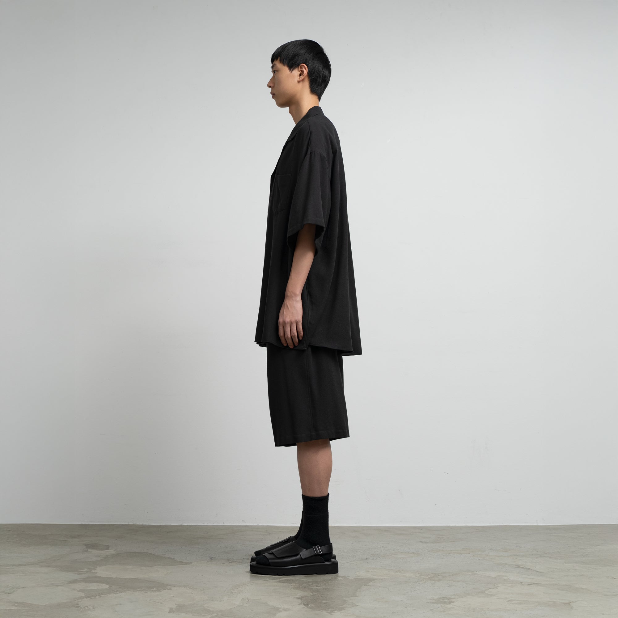 ビスコースとポリエステルの強撚糸を用いたビエラ素材。強撚糸を使うことでドライなタッチとサラサラとした清涼感ある風合いを生み出し、仕上げの加工でワッシャー加工を施すことで、柔らかさを両立。ゆったりとした身幅を持った開衿の半袖スリーピングシャツ。