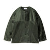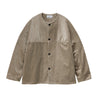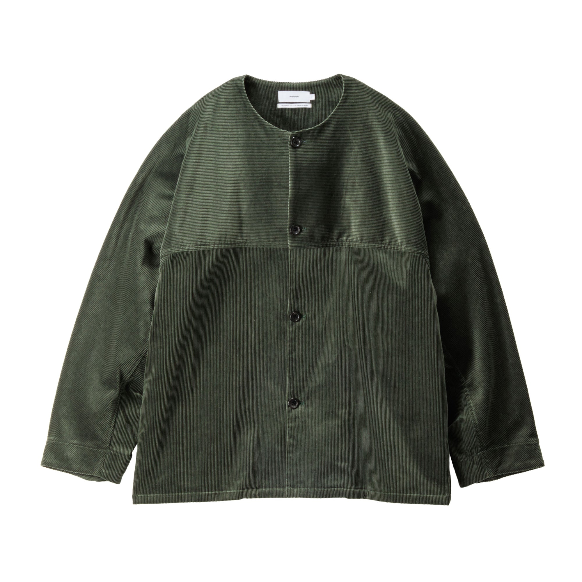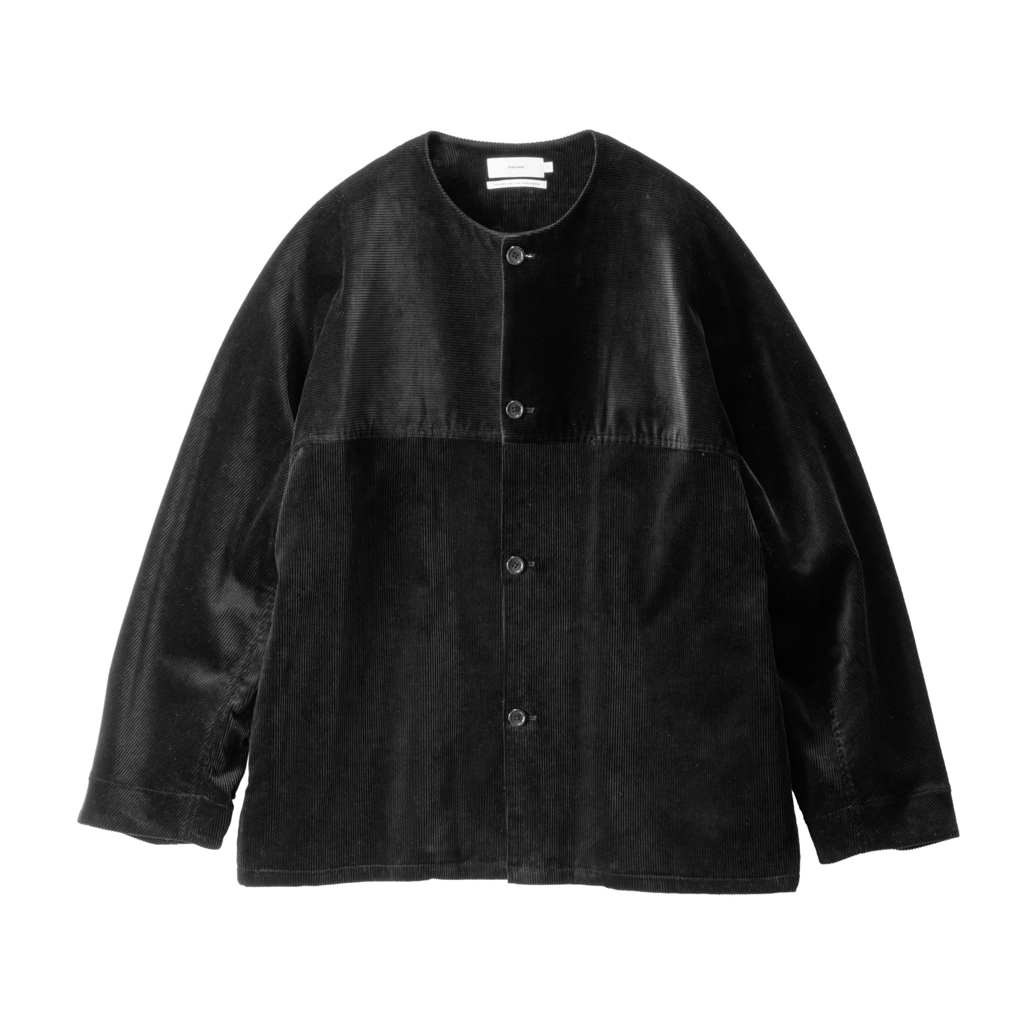 希少なスビンゴールドコットンを用いて織り上げたコーデュロイ生地。柔らかくしなやかな手触りと、太い畝一本一本の深味ある光沢、さらに美しい発色が特徴的な上品な素材。前後に配したヨークスリーブとカラーレスのネックラインが特徴的なジャケット。