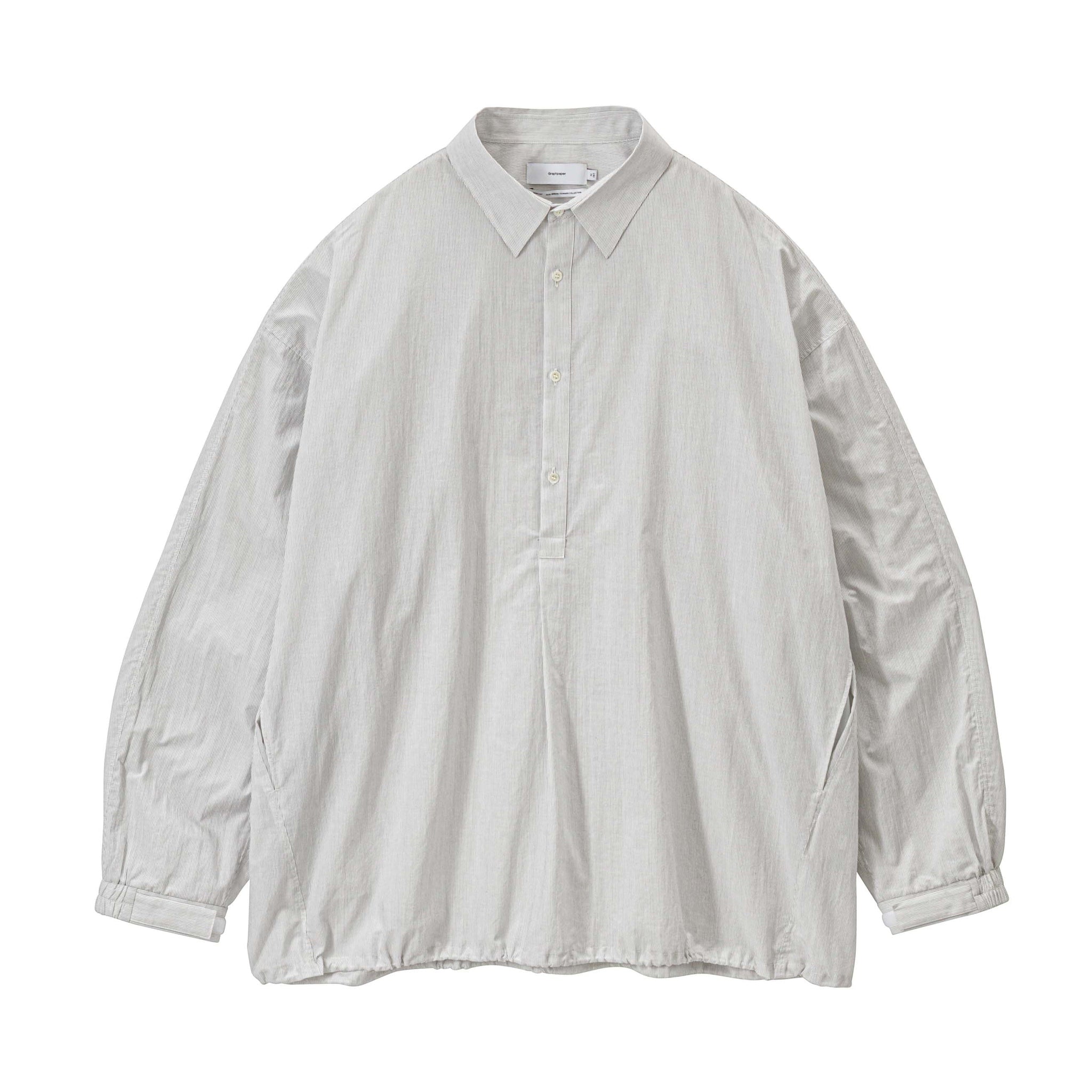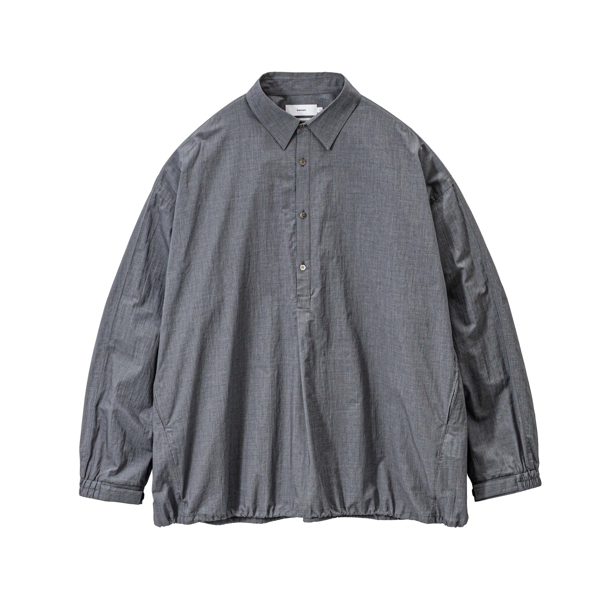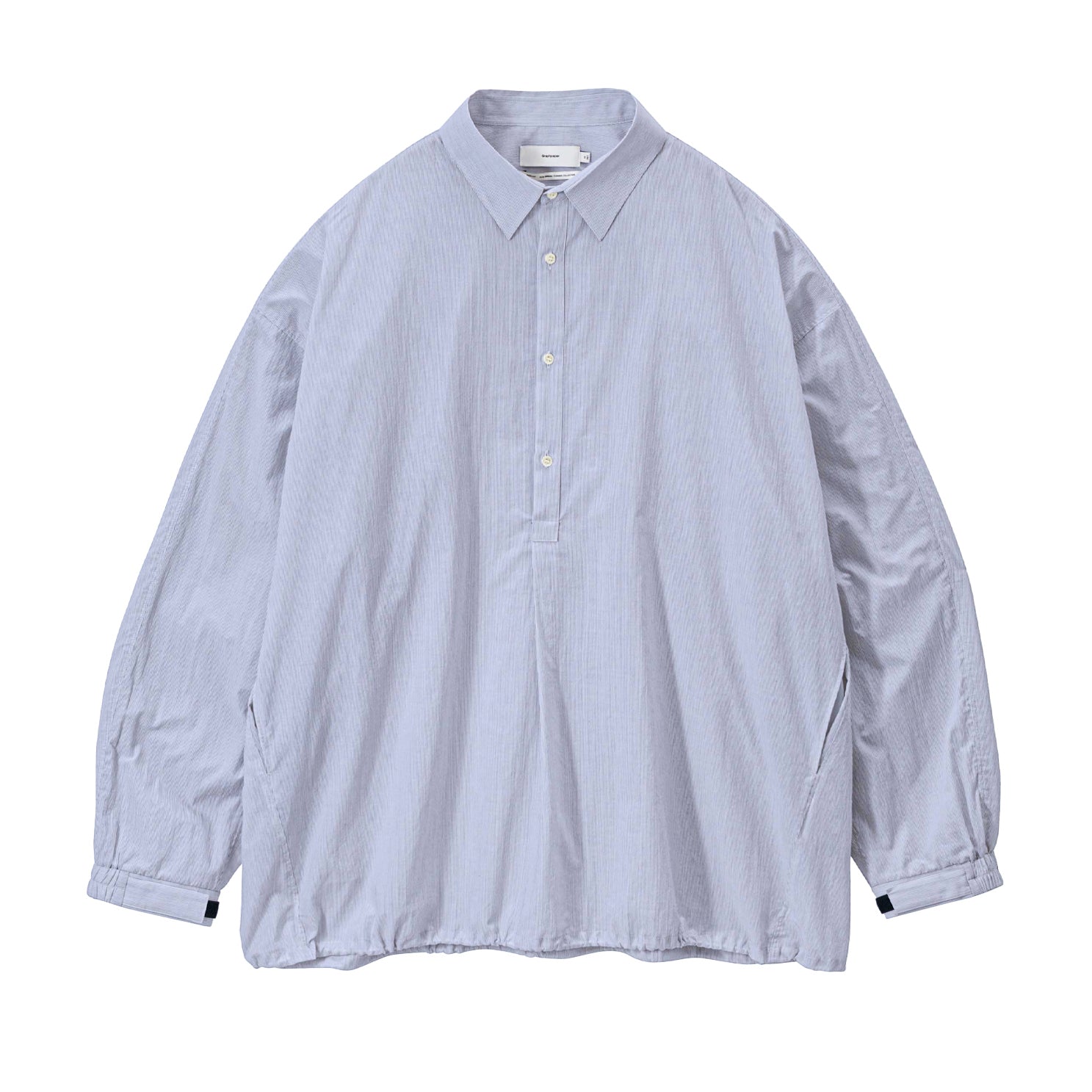 ヨークからひと続きの袖構造と、丸みのあるフォルムが特徴のレギュラーカラーアノラック。裾に配したドローコードでシルエットの調整が可能です。素材には、200番と140番の極細番手の糸を交互にサッカー織りで仕上げた、非常に細かな凹凸を持つシアサッカーを使用。日本の素材の中でも最細番手に位置する繊細な生地で、肌にまとわりつきにくいドライタッチな風合いと、コンパクト糸による毛羽の少ない適度な光沢が、クリーンな表情を生み出しています。
