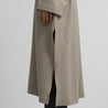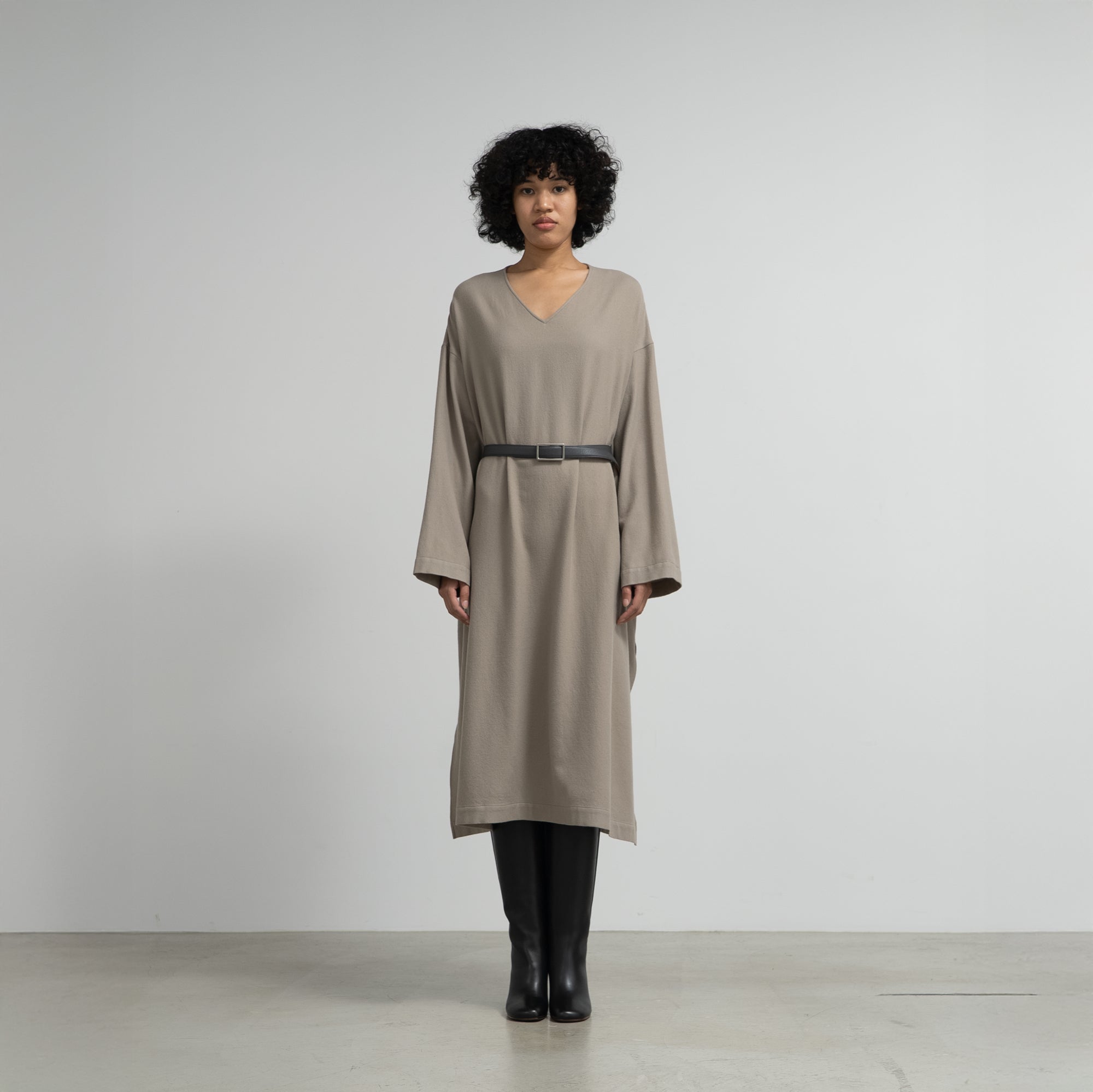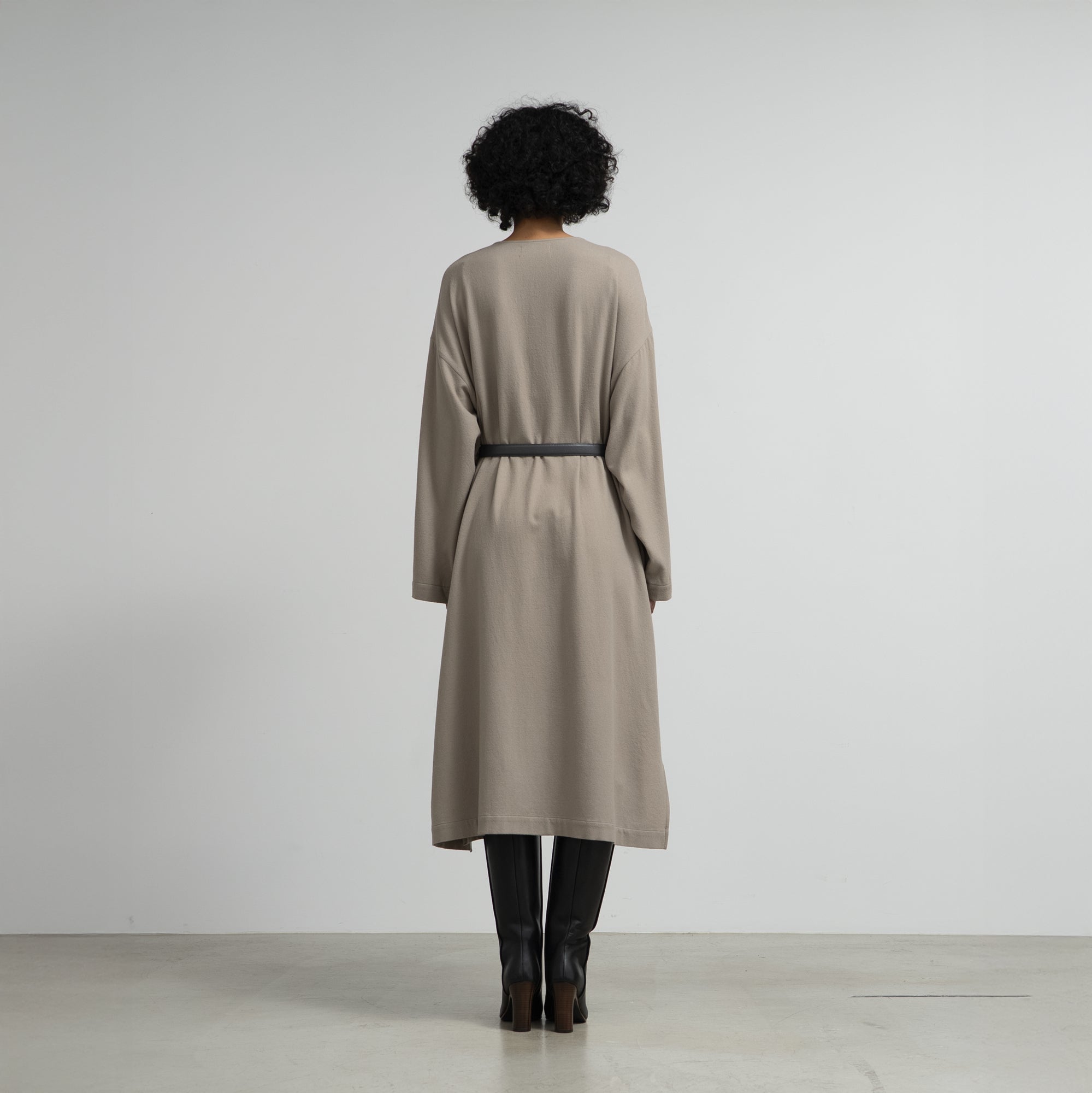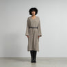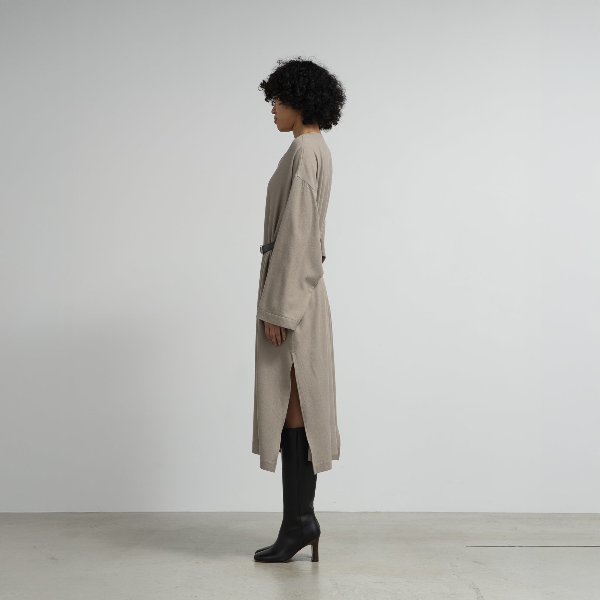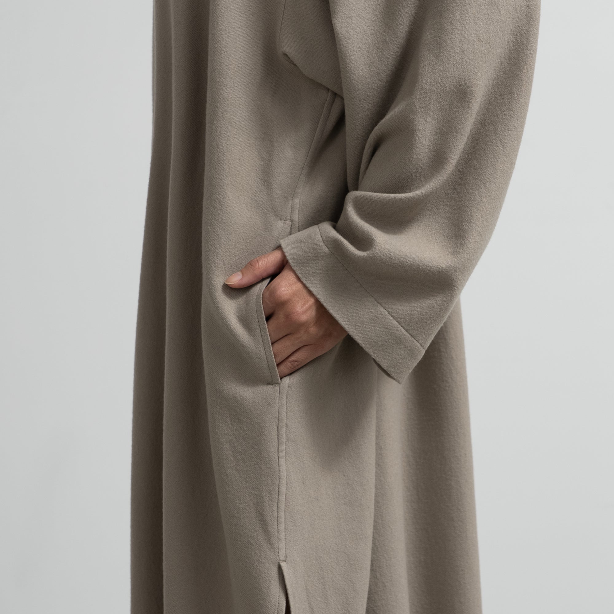 カシミヤに匹敵する繊細さと上質感を持つSUPER180's原料を使用したオリジナルのウールビエラ。甘く織り上げ柔らかさのある滑らかな手触りに仕上げた素材。直線的なカッティングでゆったりと丈が長く両サイドにスリットを設けた民族衣装を由来にもつカフタン。柔らかなシルエットと温かみのある表情が程よい抜け感を演出。