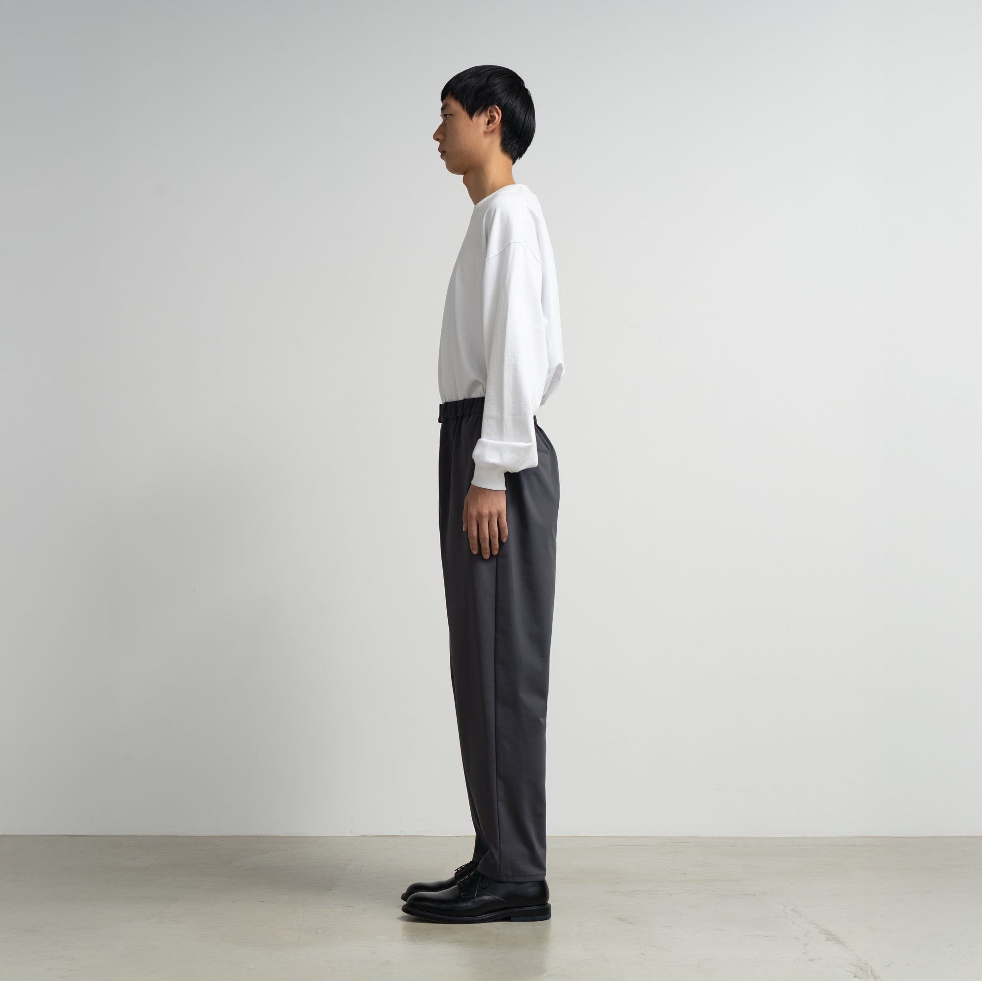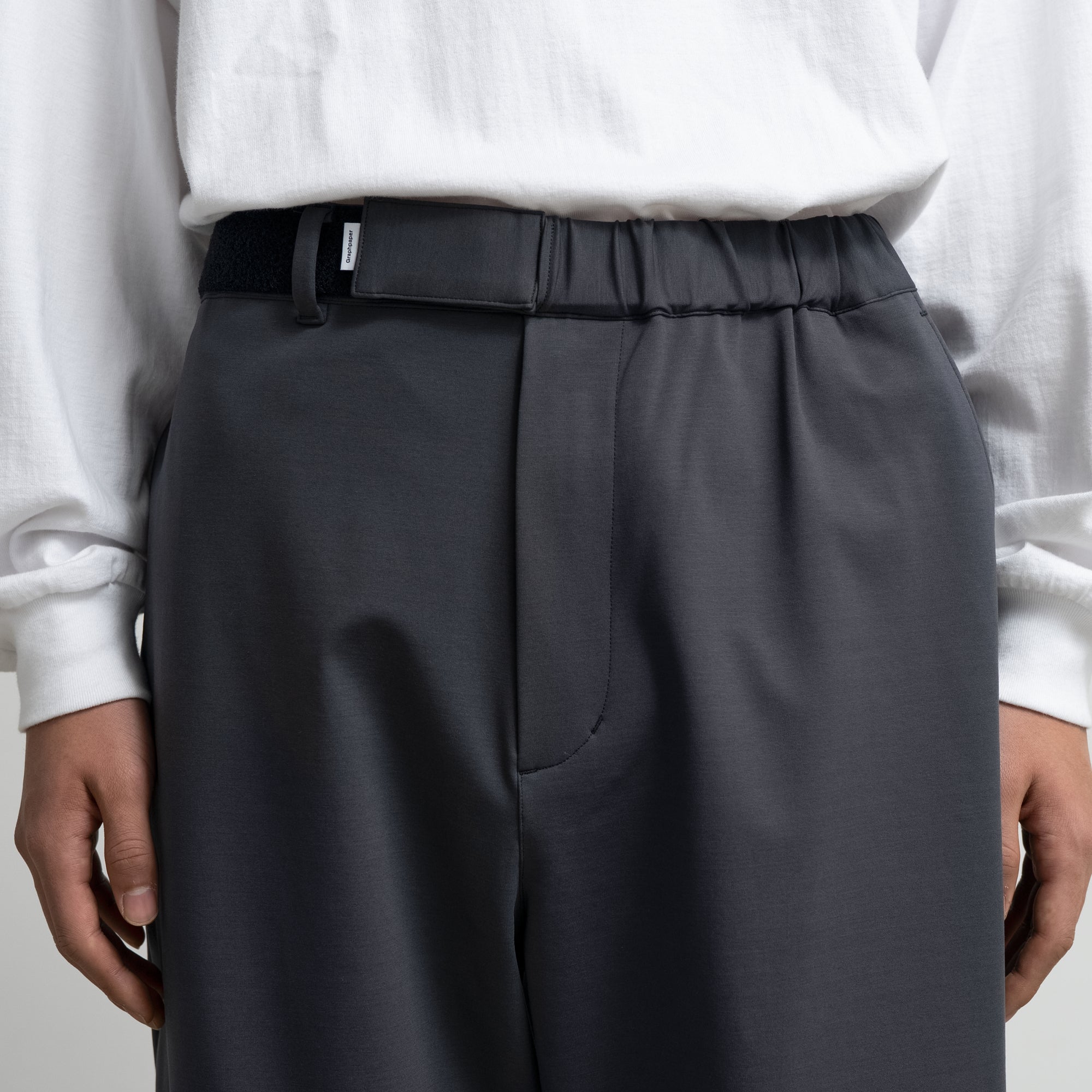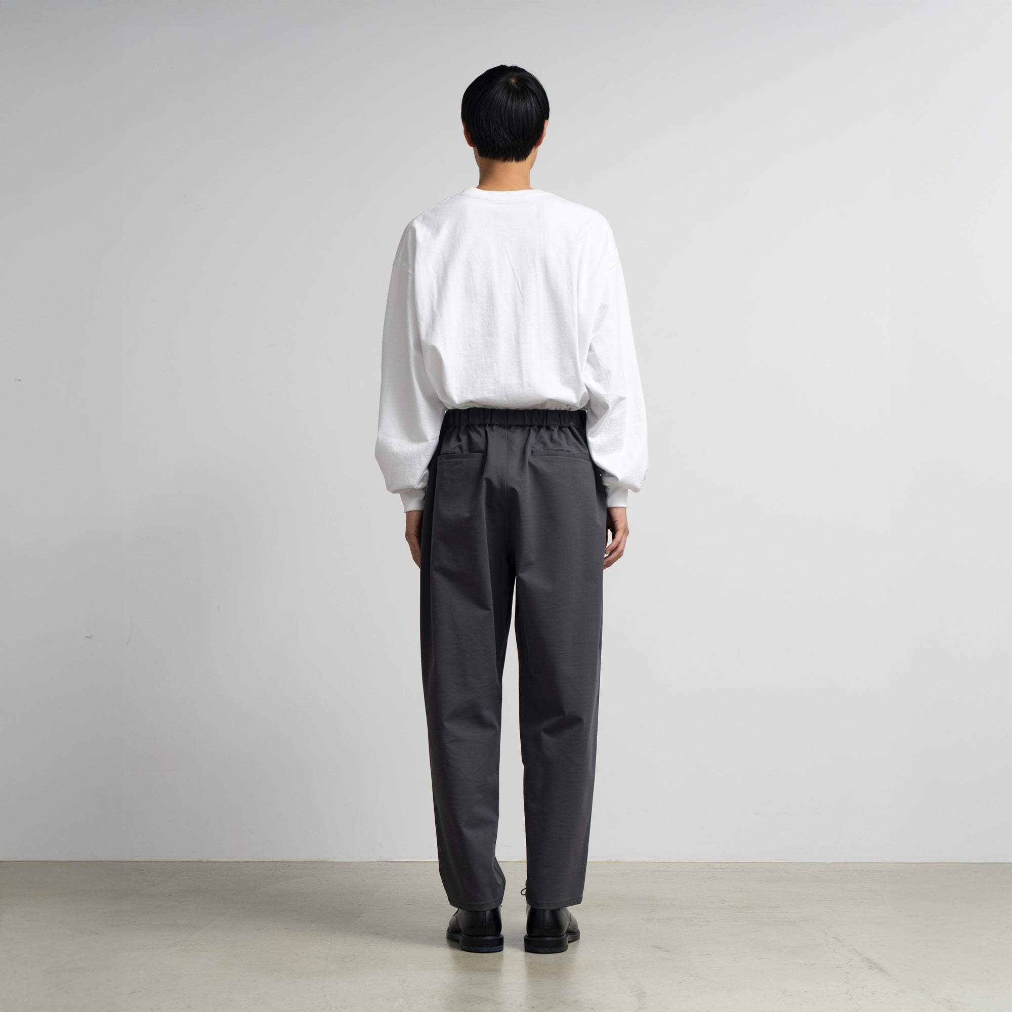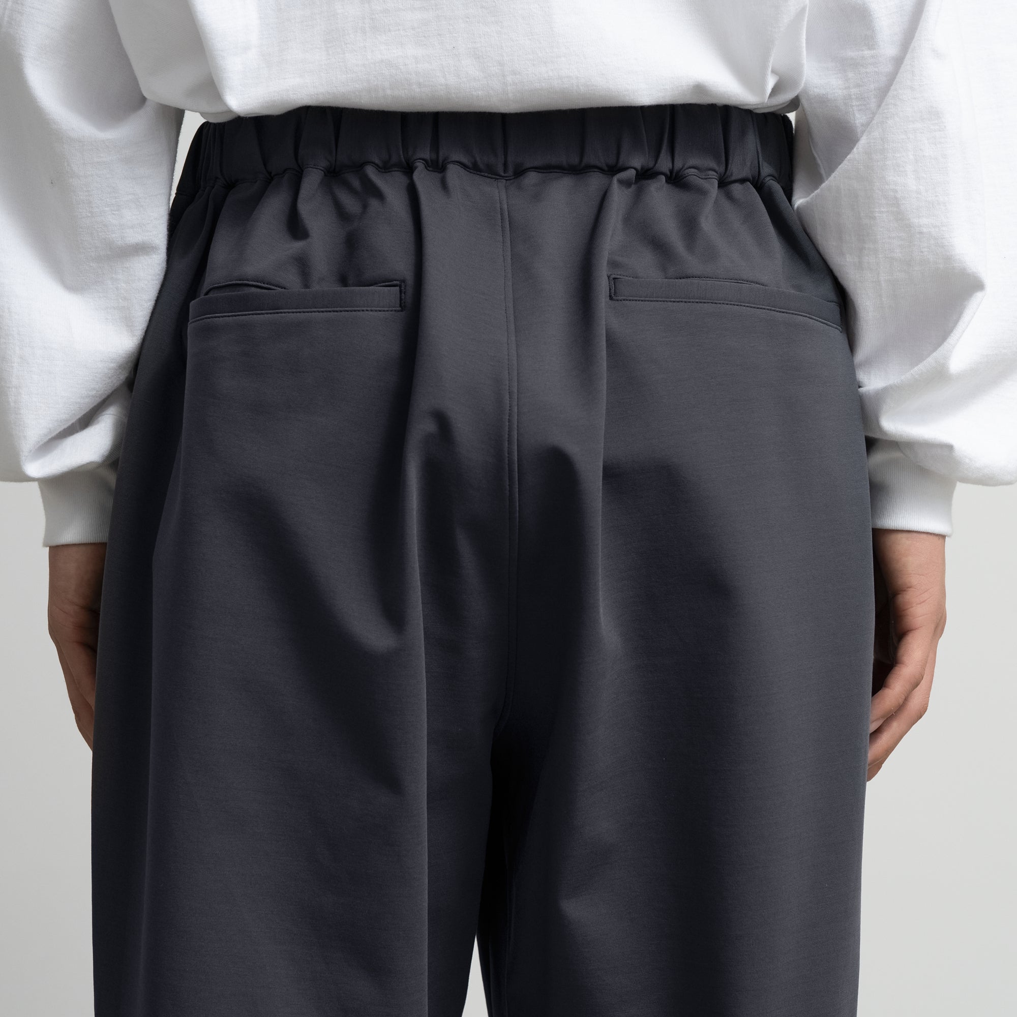ハイゲージの編機で製作した光沢感とハリ感のあるオリジナルのポンチ素材。ウエストのサイズを簡単に調整できるブランド定番のパンツ。フランスのシェフパンツをべースにした毎シーズン定評のあるデザイン。