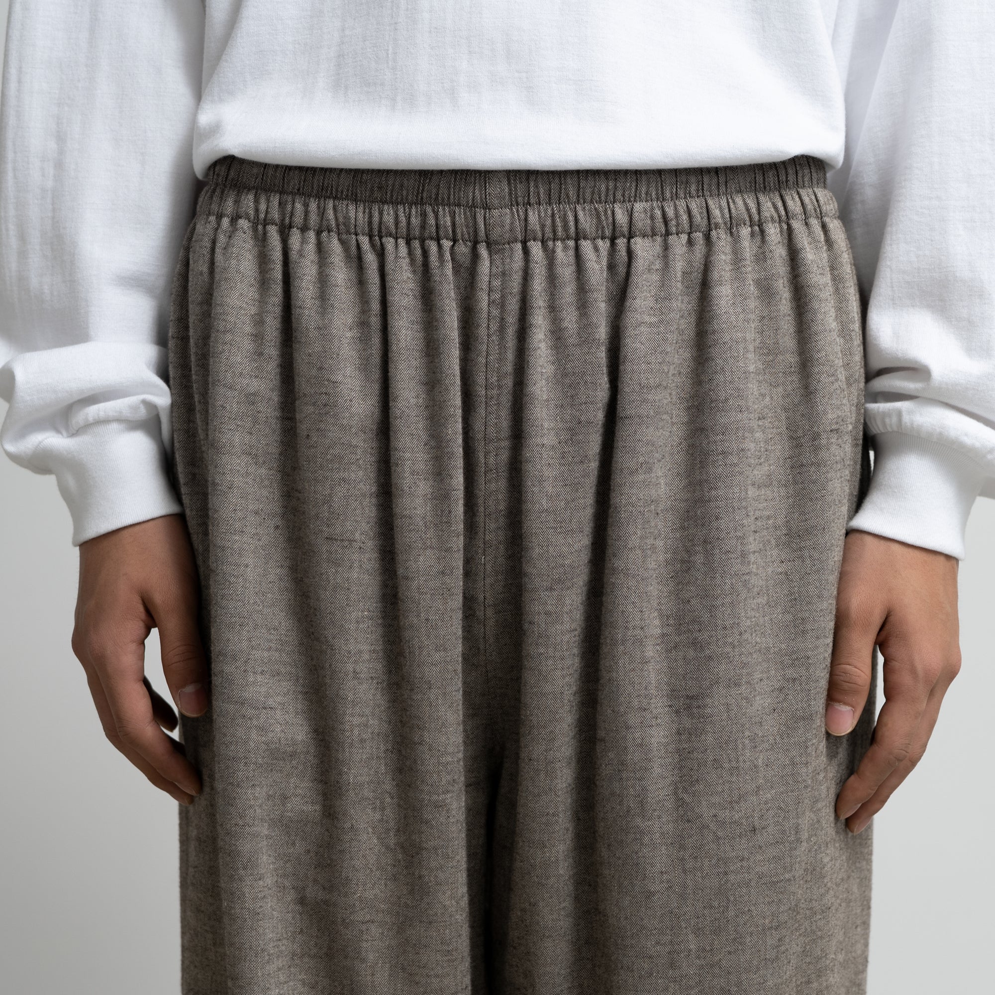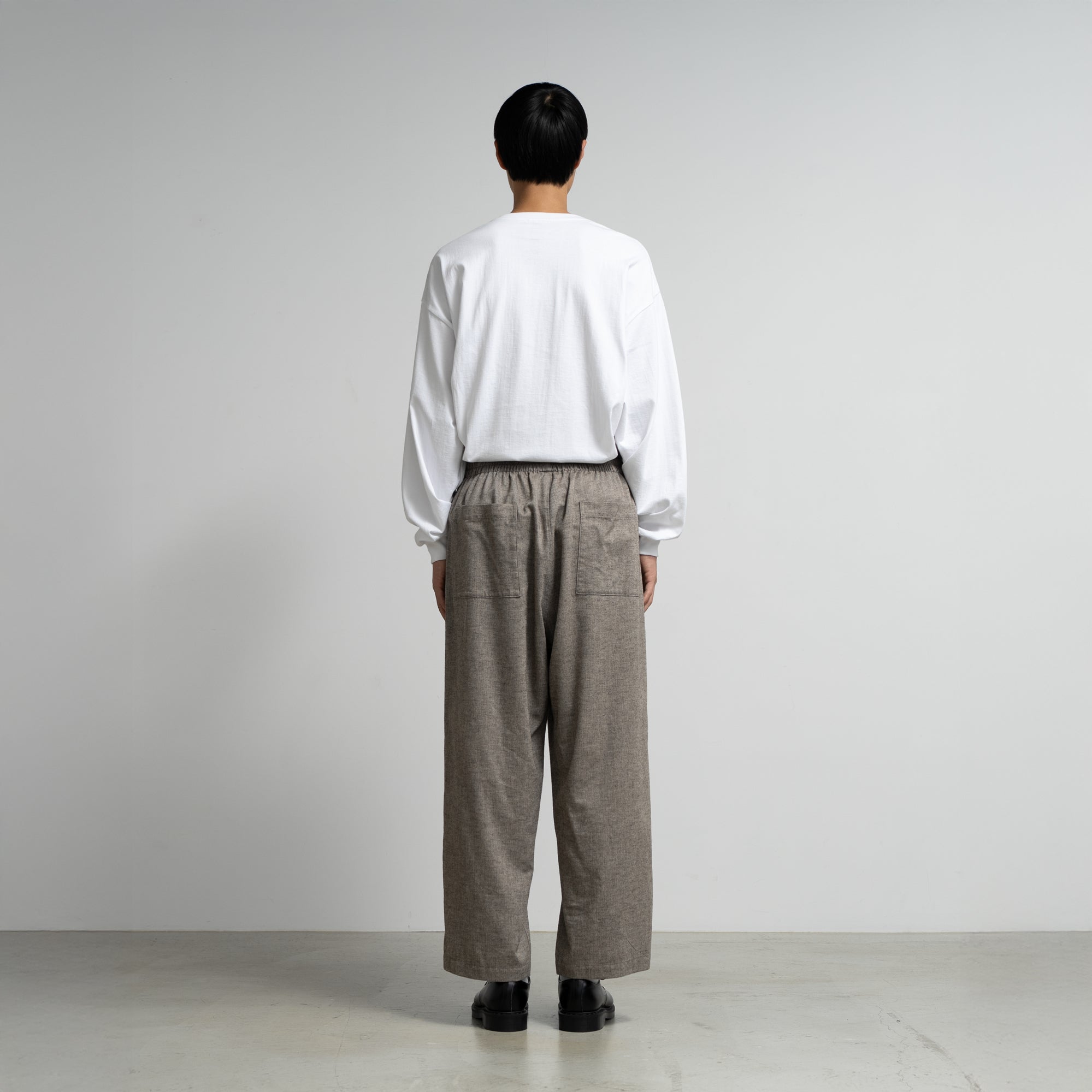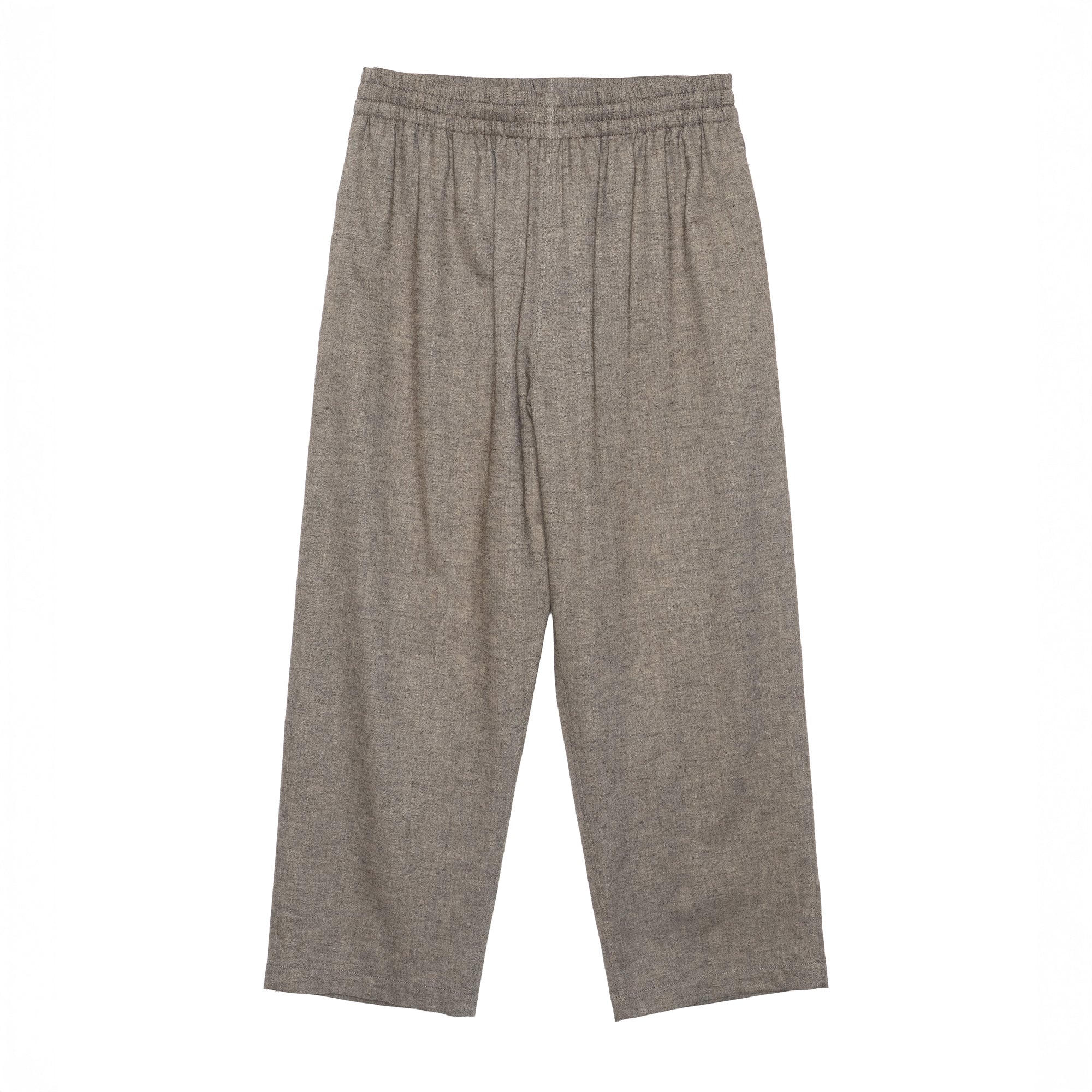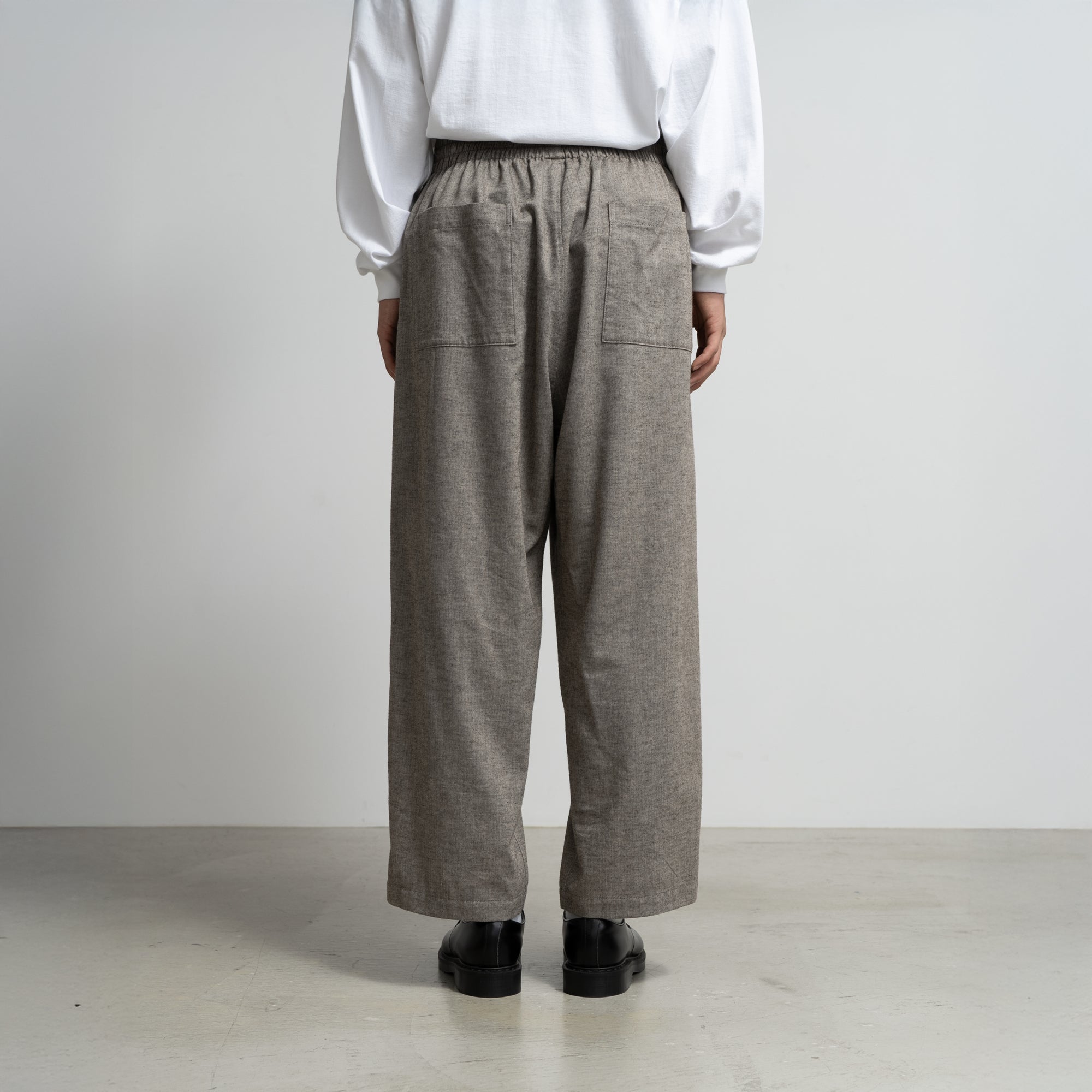 スペイン・バルセロナに拠点を持つSIDOGRAS(シドグラス)社の上質で繊細なコットンを用いたフランネルを使用。品のある柔らかい肌触りと温かみのある起毛感が魅力。ウエストゴムでシンプルなパターン構成のスリーピングパンツ。ゆとりのある腰回りで、裾にかけテーパードさせたリラックス感のあるシルエット。