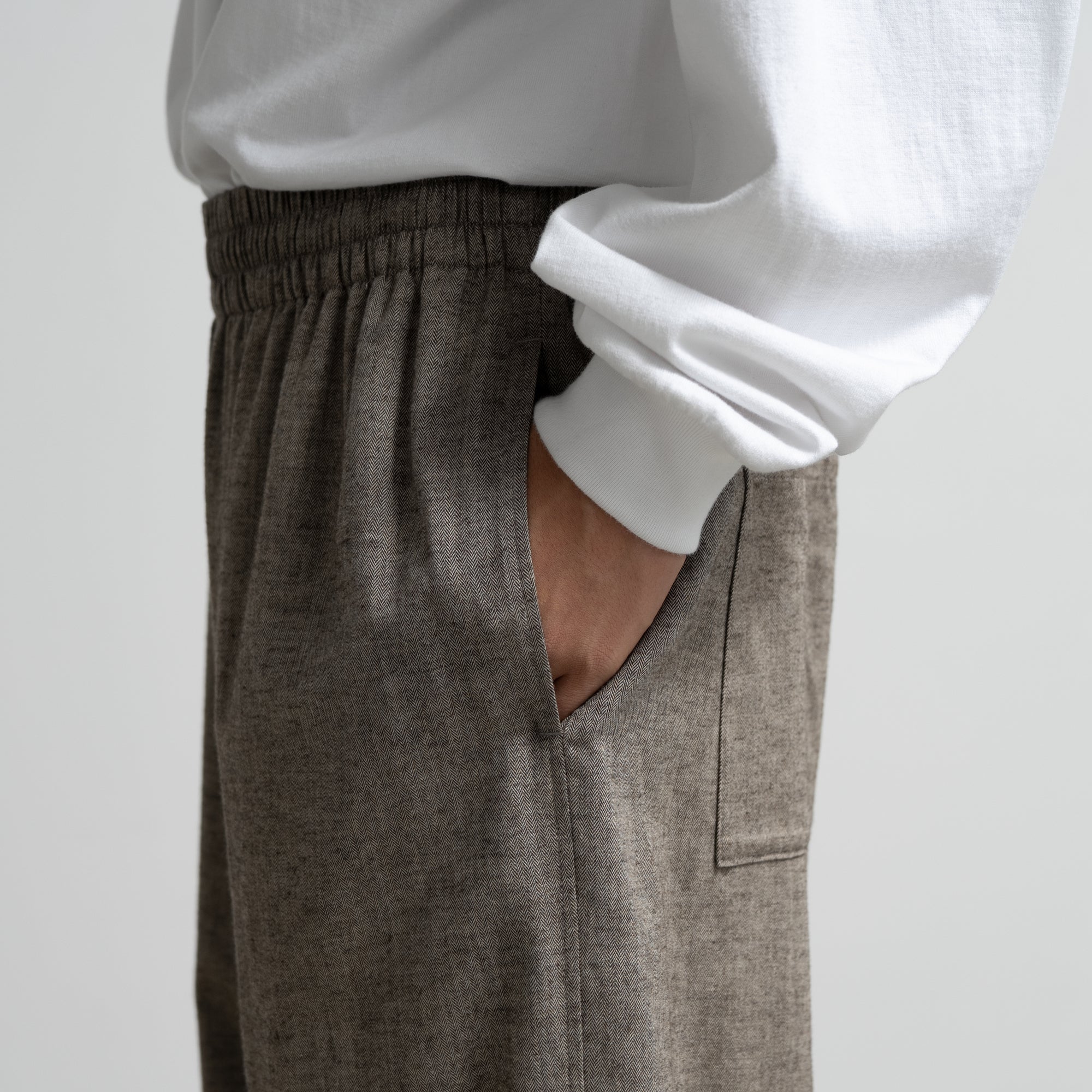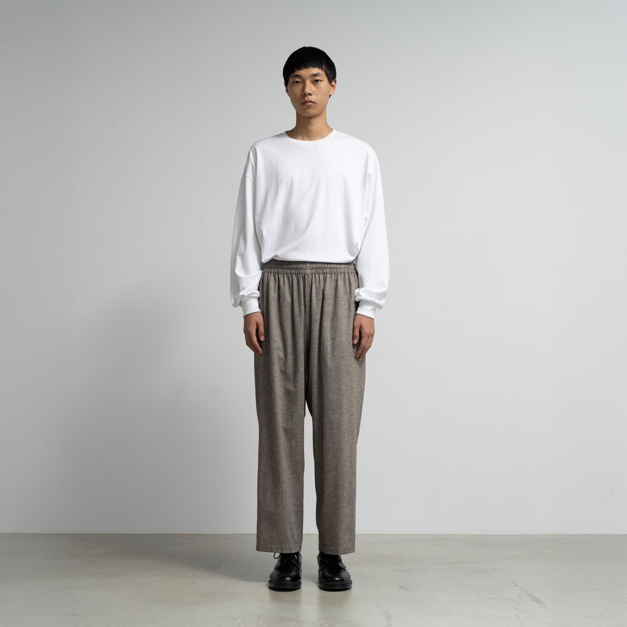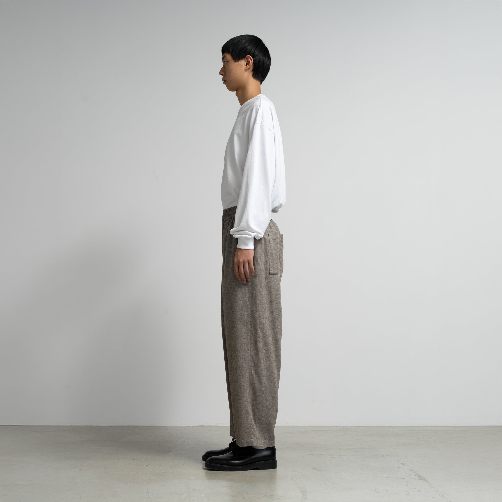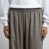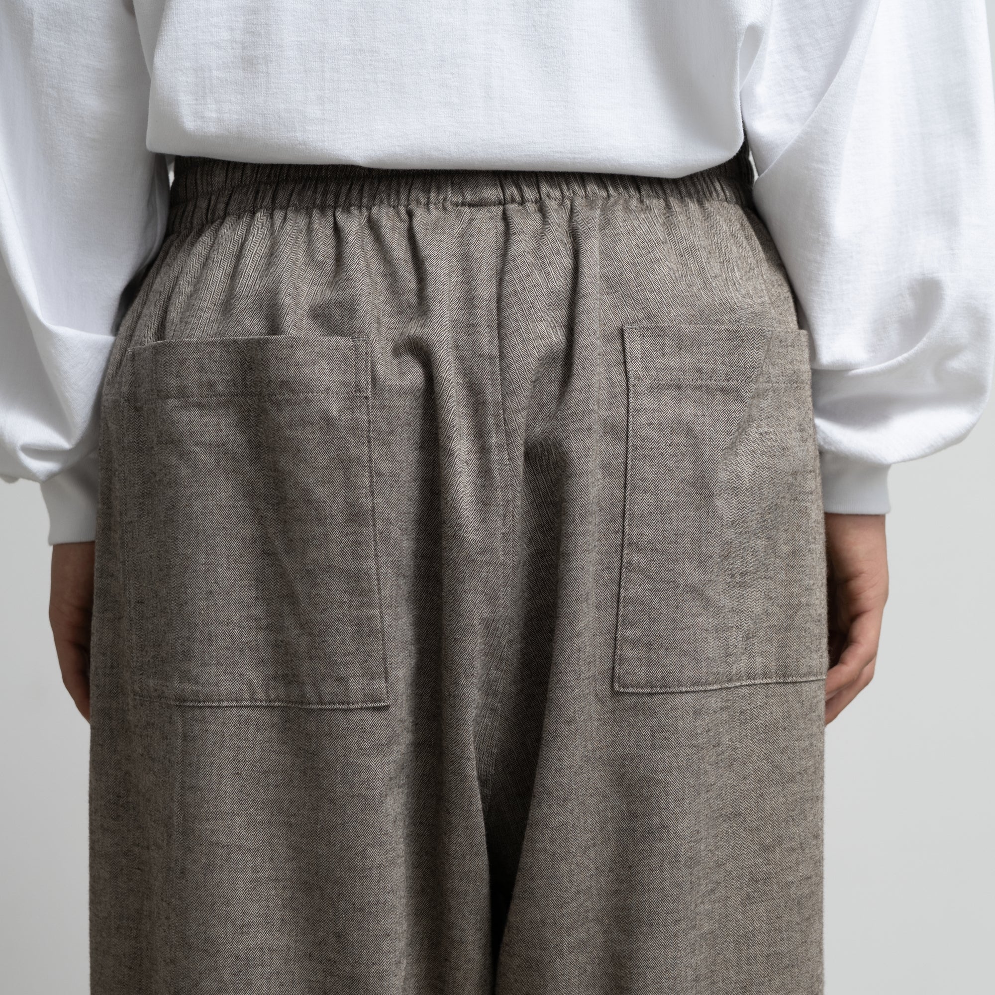 スペイン・バルセロナに拠点を持つSIDOGRAS(シドグラス)社の上質で繊細なコットンを用いたフランネルを使用。品のある柔らかい肌触りと温かみのある起毛感が魅力。ウエストゴムでシンプルなパターン構成のスリーピングパンツ。ゆとりのある腰回りで、裾にかけテーパードさせたリラックス感のあるシルエット。