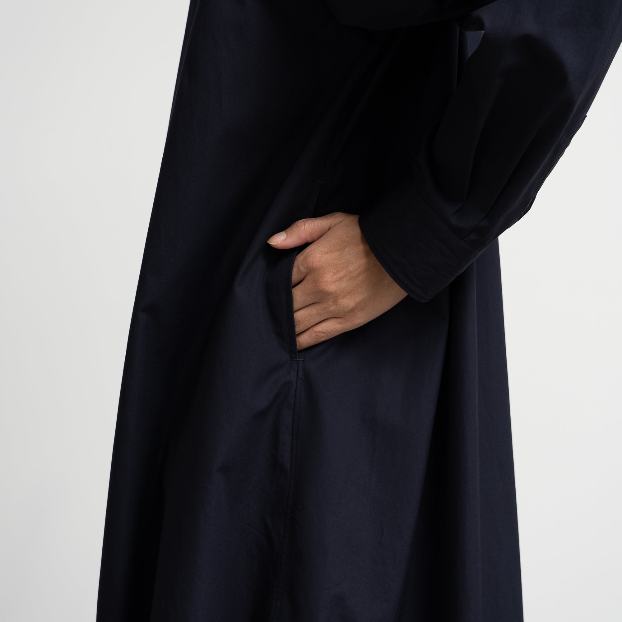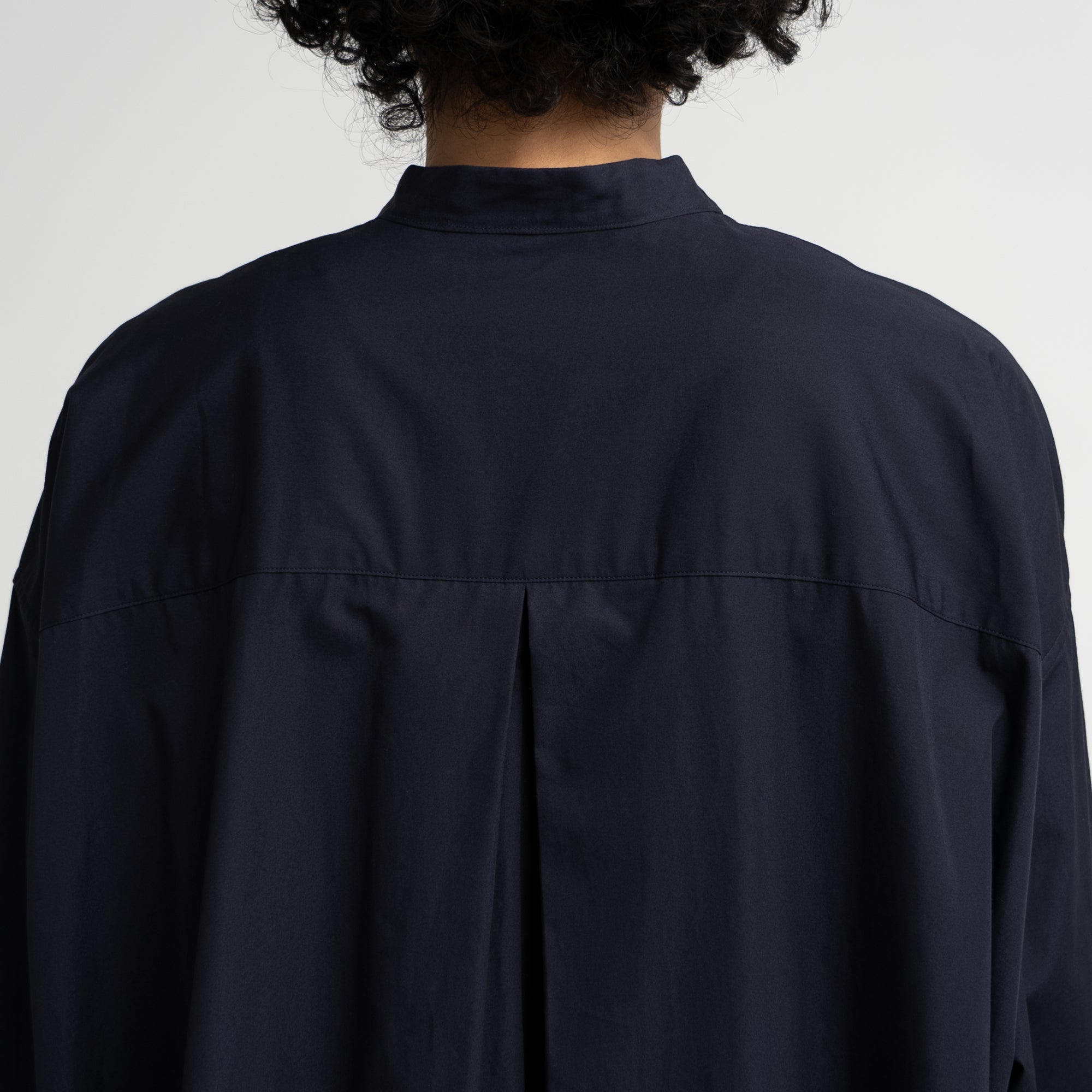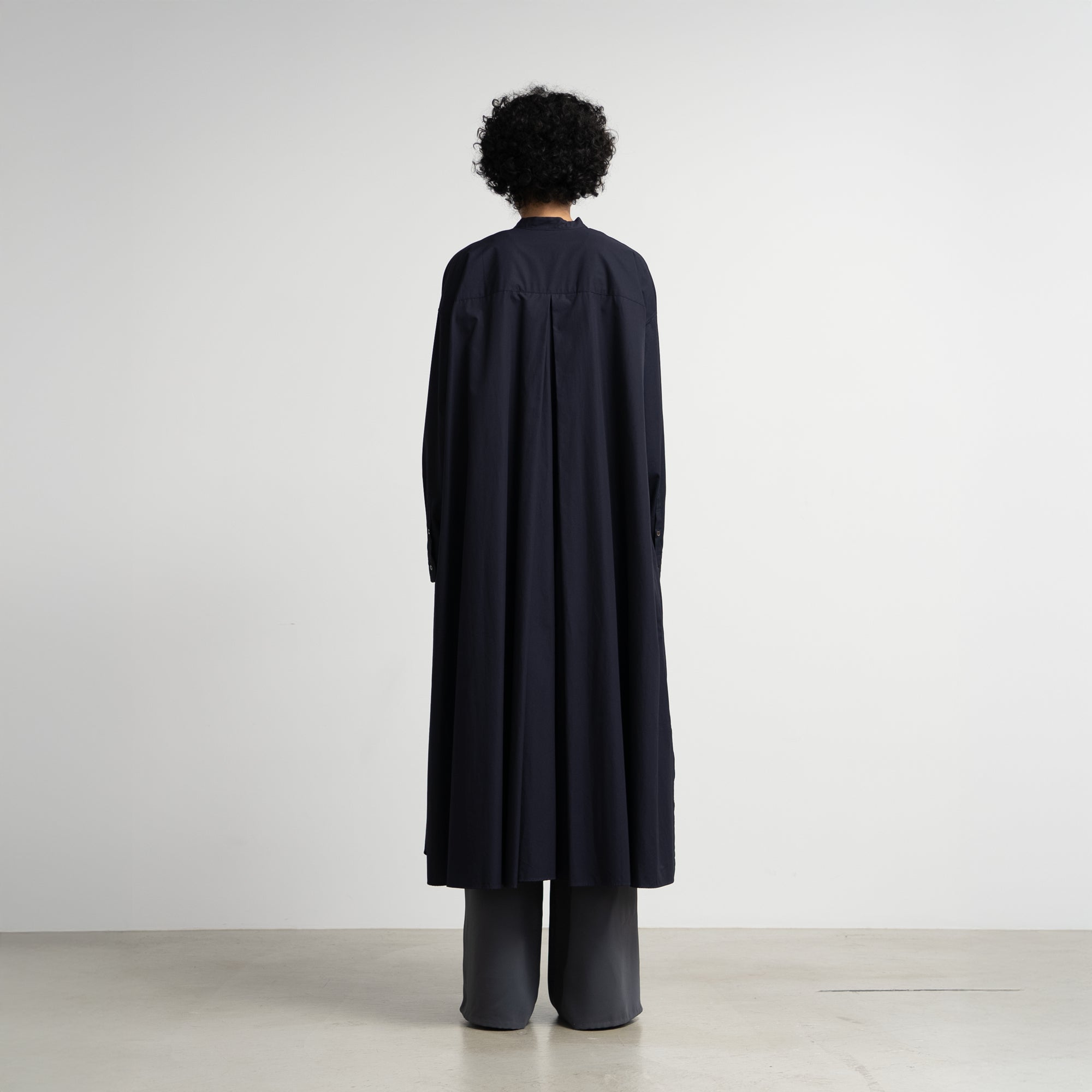 オーバーサイズのバンドカラーワンピースは背中のインバーテッドプリーツが動きとともに広がりエレガントな雰囲気を。