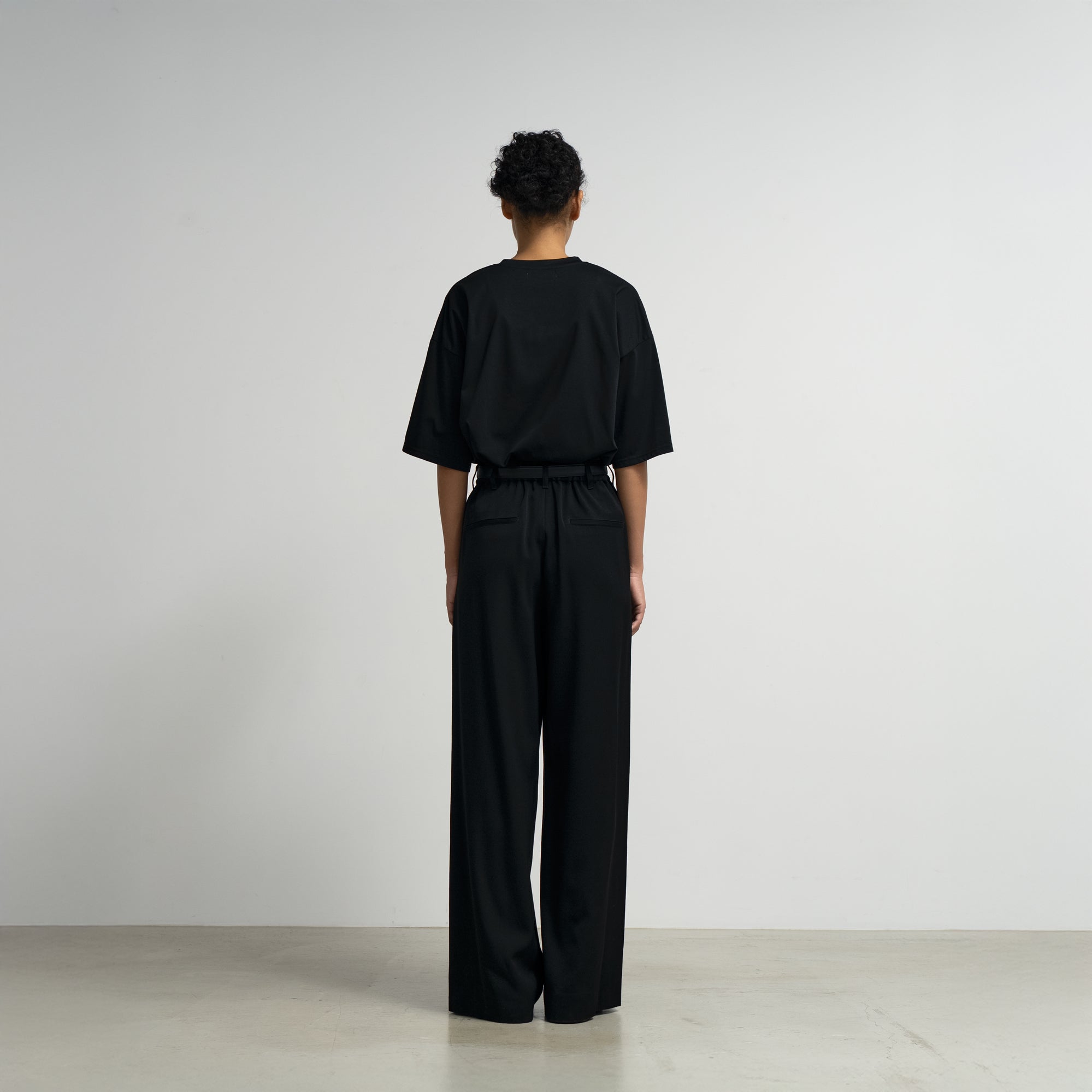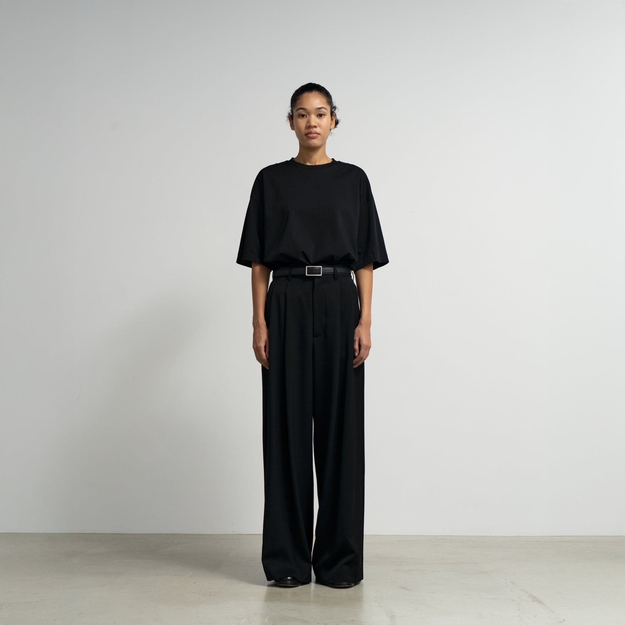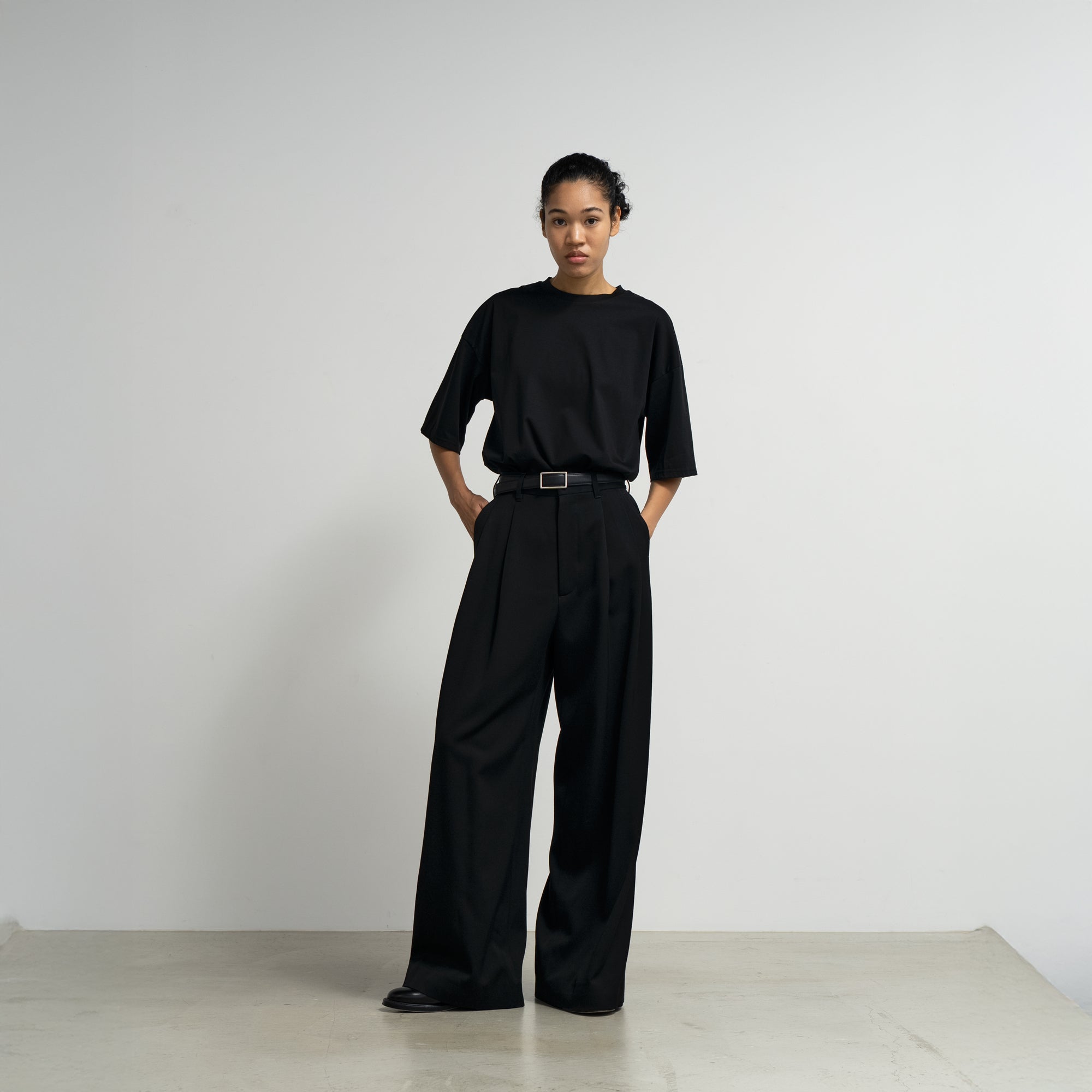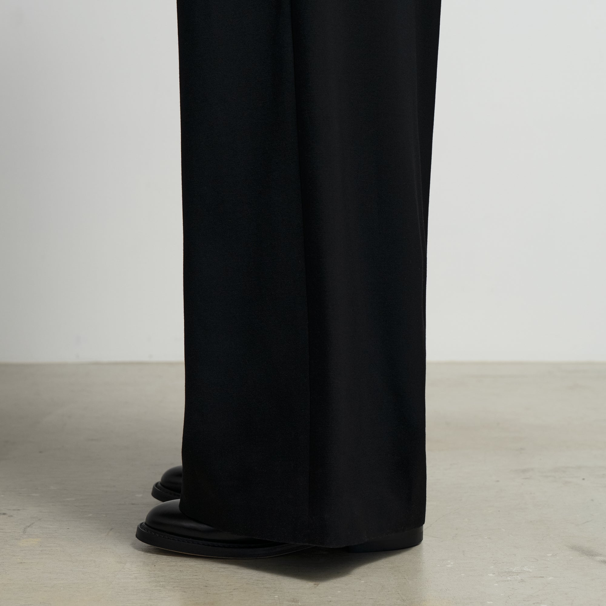 良質なメリノウールを使用した朱子織りのドスキン素材。一般的にタキシードに使われるような高密素材で柔らかさと光沢感が特徴。通常より染色時間を長くし「黒より黒い」濃染加工をすることで、よりシャープで深い黒色を表現している。フロントに2本のタックをあしらい裾に向かって緩やかに広がっていくワイドなトラウザー。後ろウエストにゴムを設けたイージーな着用感。