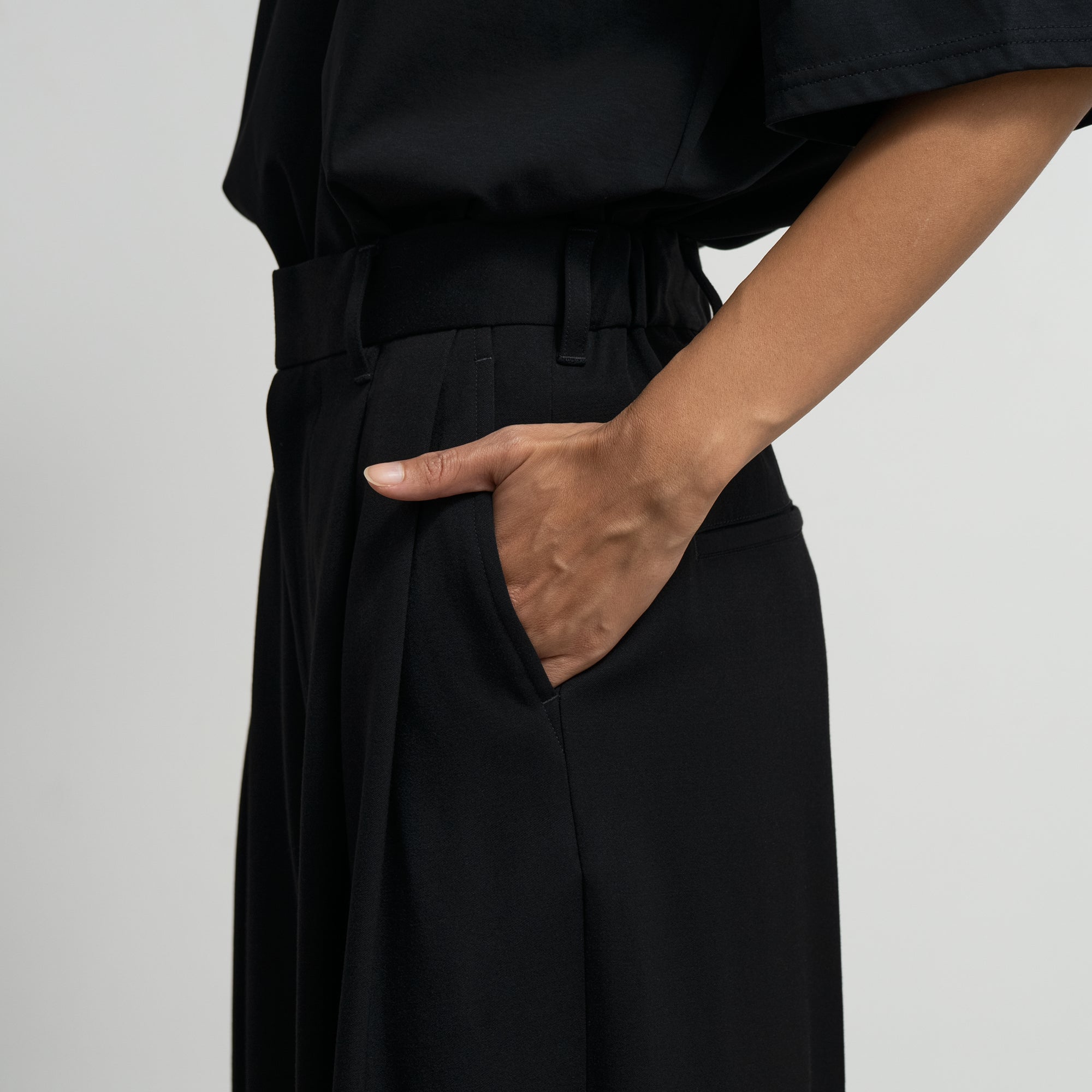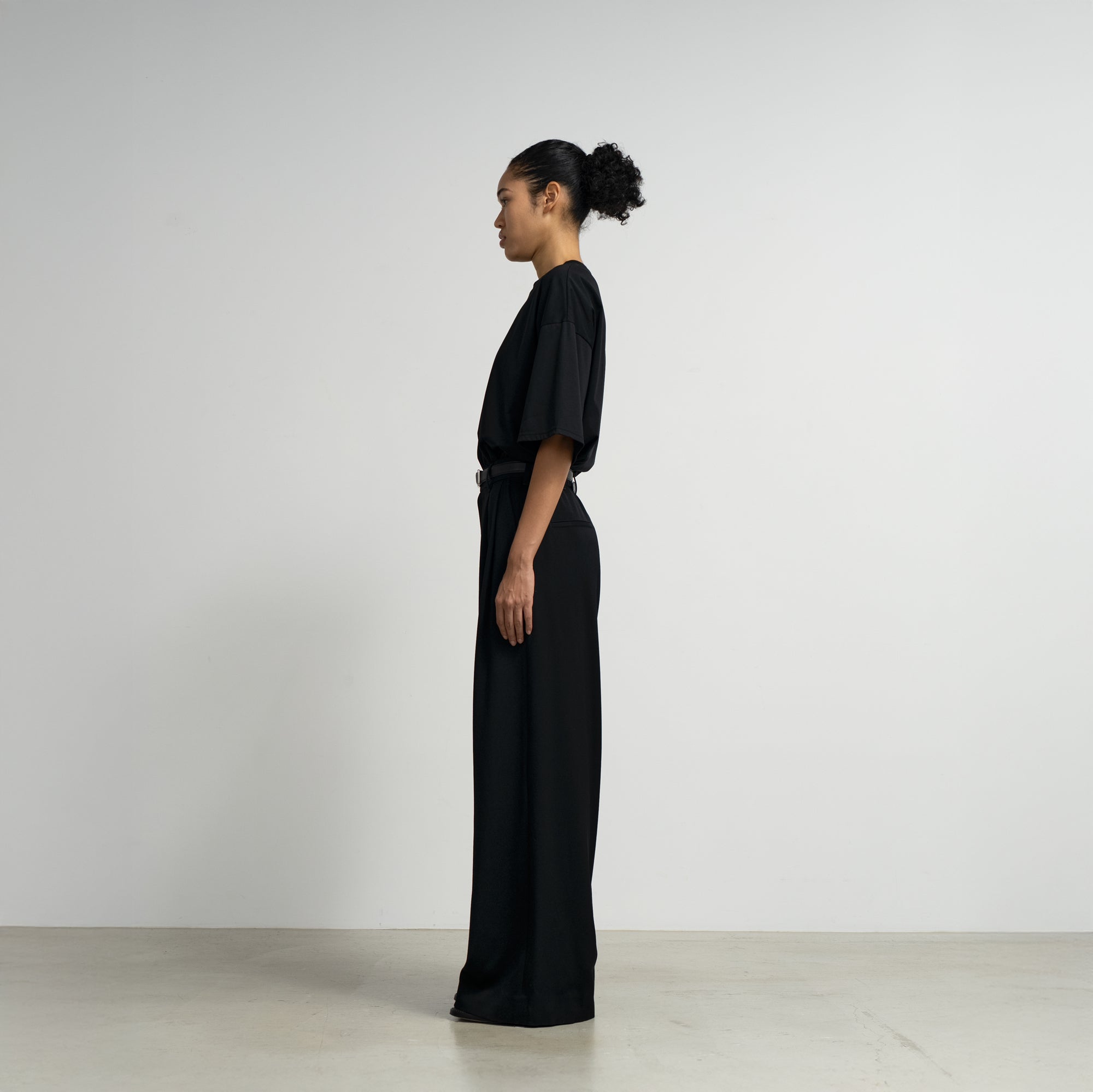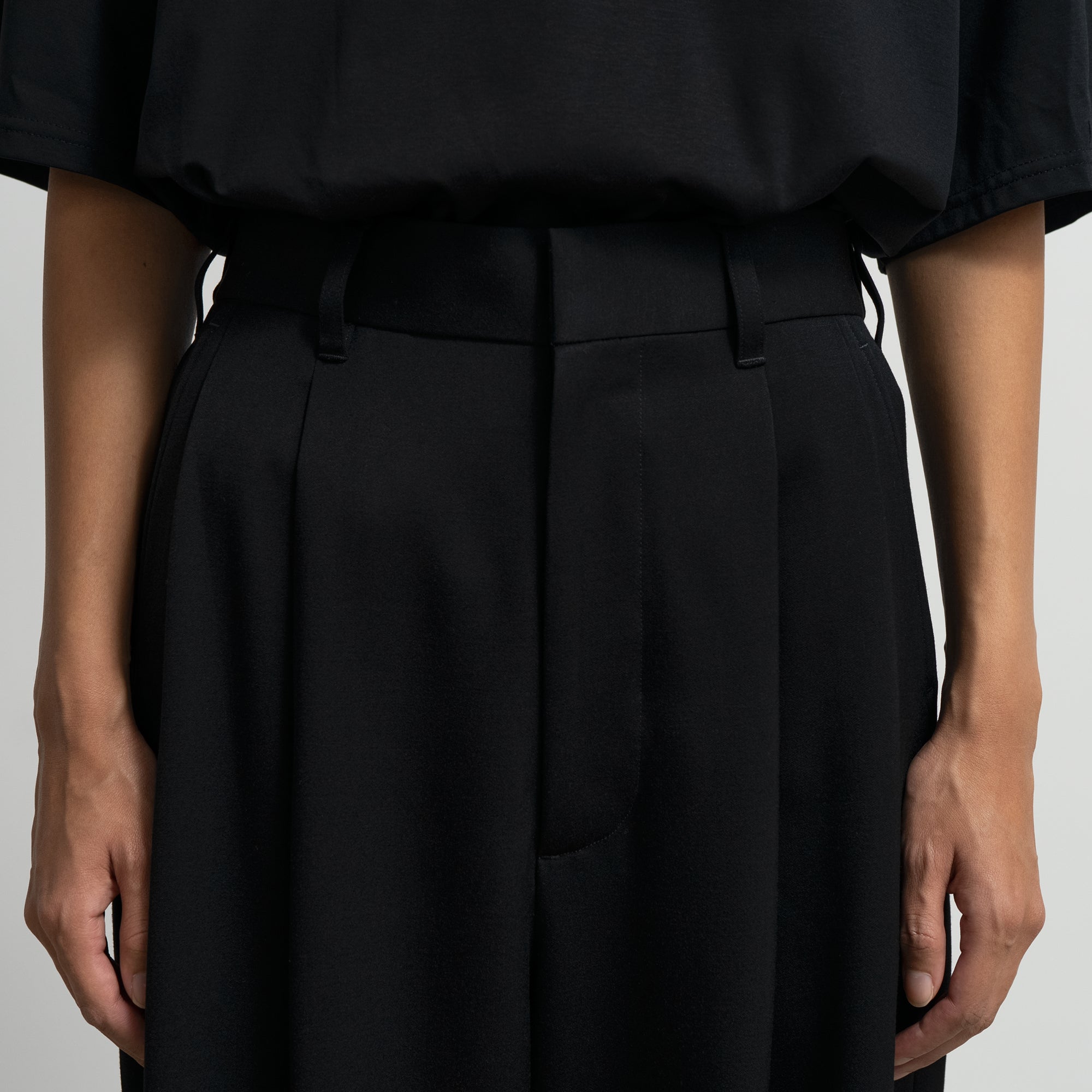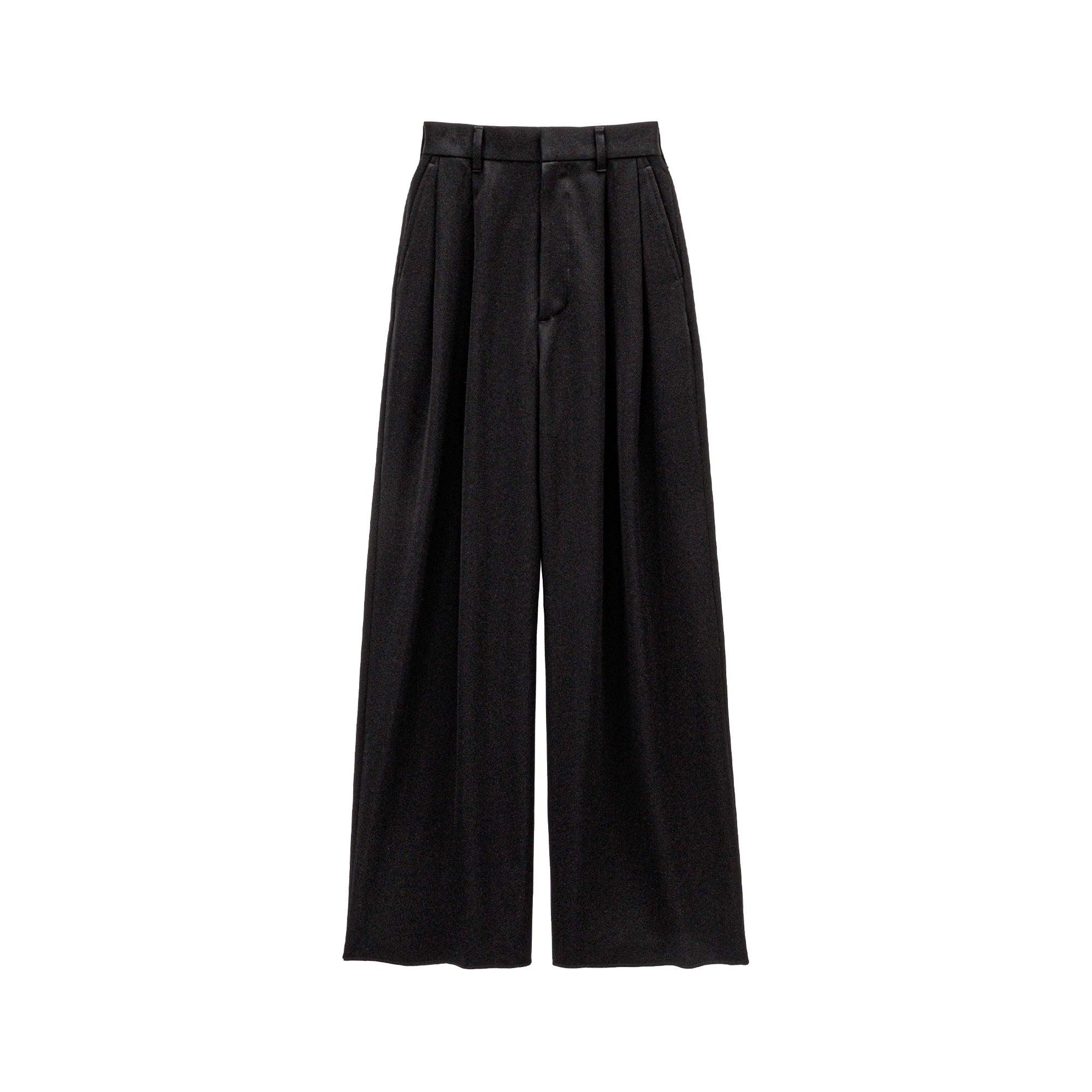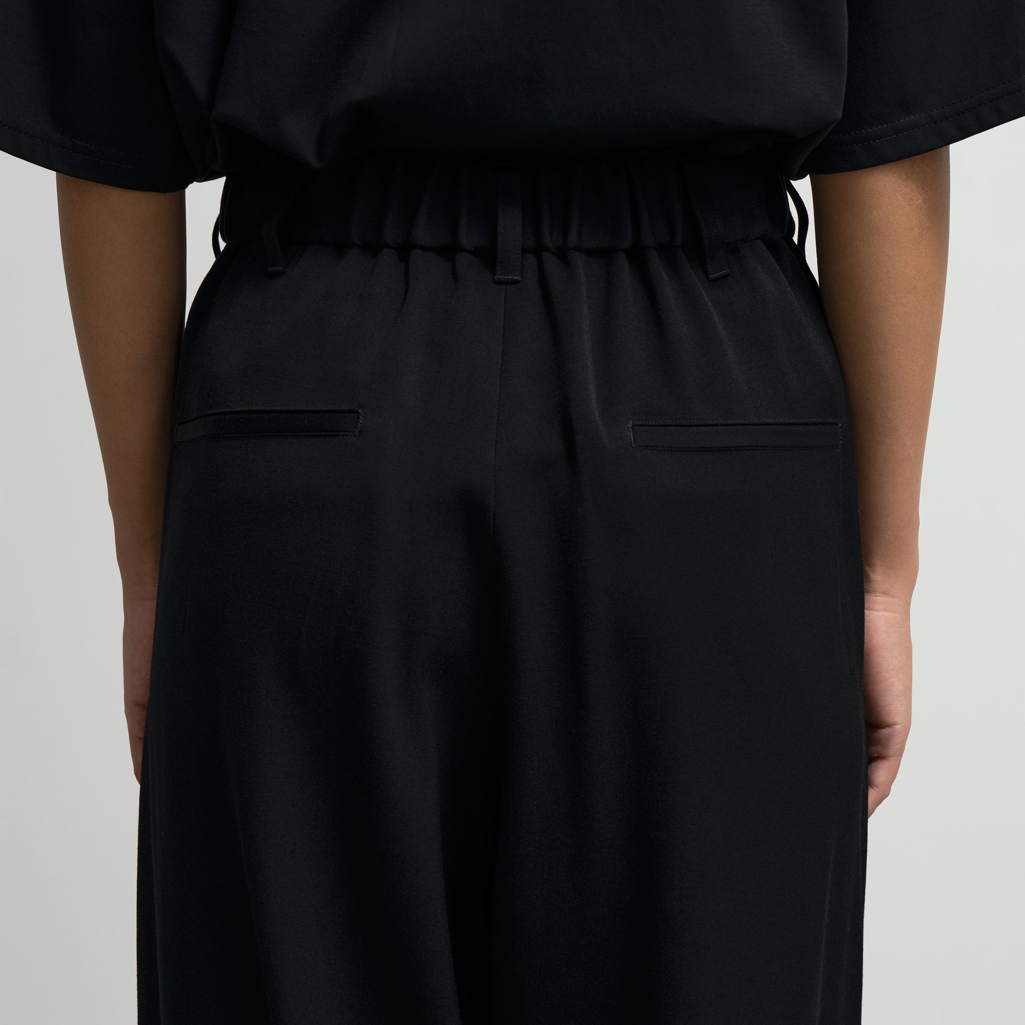 良質なメリノウールを使用した朱子織りのドスキン素材。一般的にタキシードに使われるような高密素材で柔らかさと光沢感が特徴。通常より染色時間を長くし「黒より黒い」濃染加工をすることで、よりシャープで深い黒色を表現している。フロントに2本のタックをあしらい裾に向かって緩やかに広がっていくワイドなトラウザー。後ろウエストにゴムを設けたイージーな着用感。