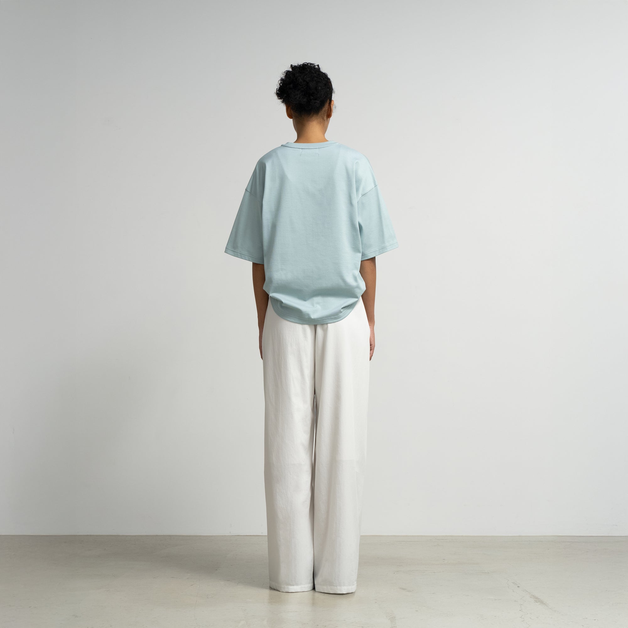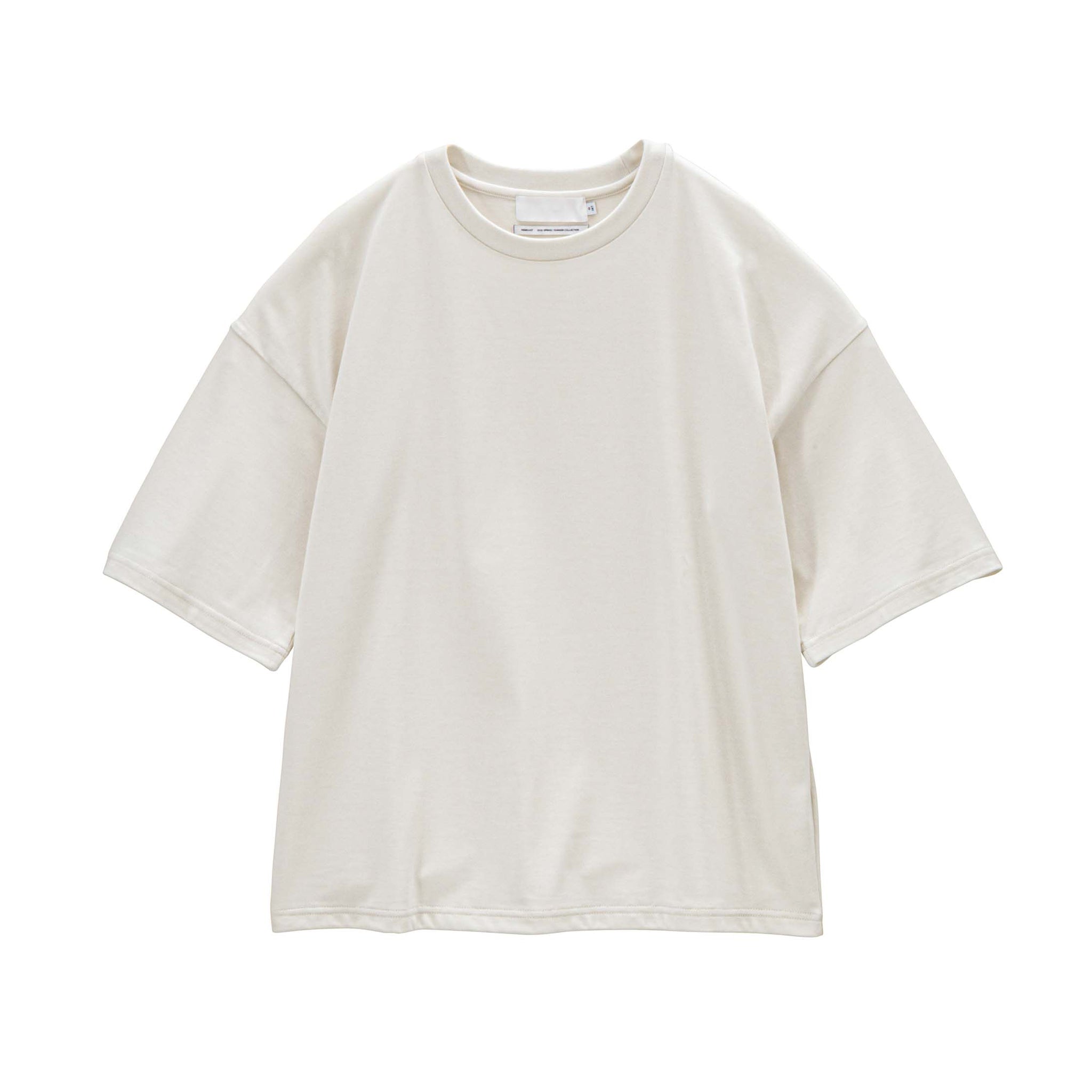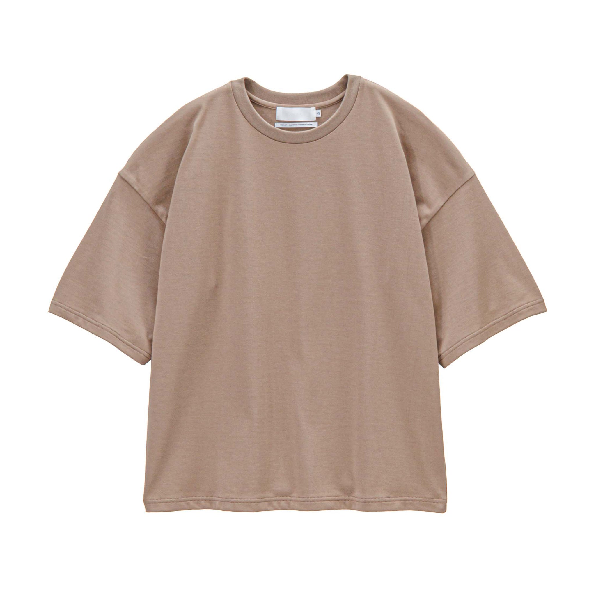 非常に細い糸を3本撚り合わせた糸を使用し、表面は非常に滑らかで、自然な光沢感を放ち、肌になじむ柔らかな天竺を使用したTシャツ。上品な表情でありながら、ゆったりとしたシルエットで心地良く着用できる一枚。