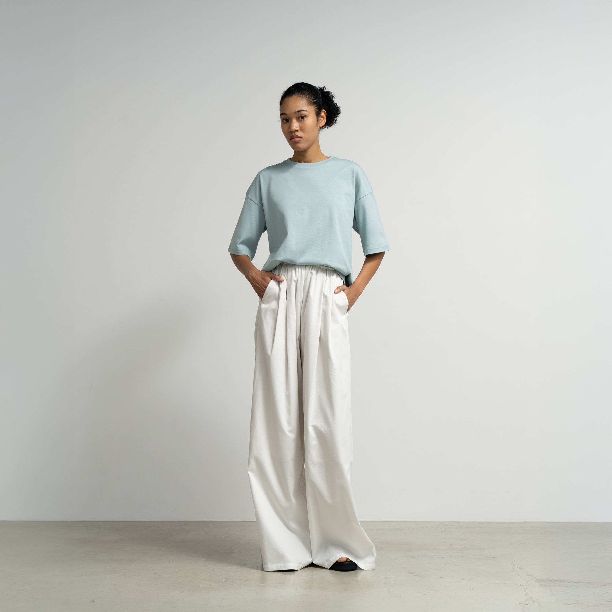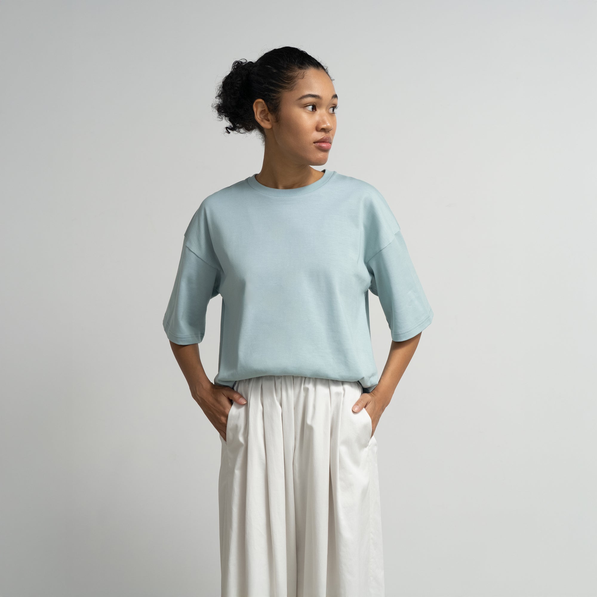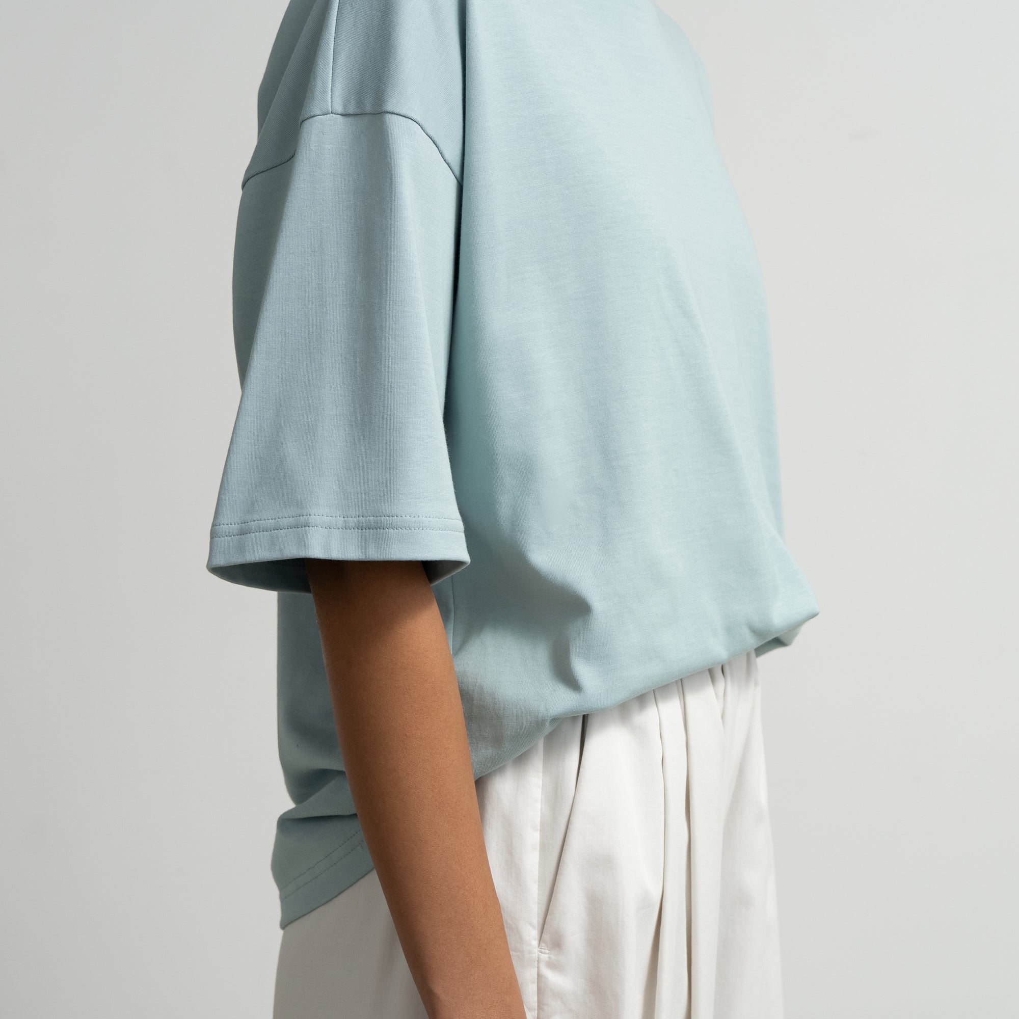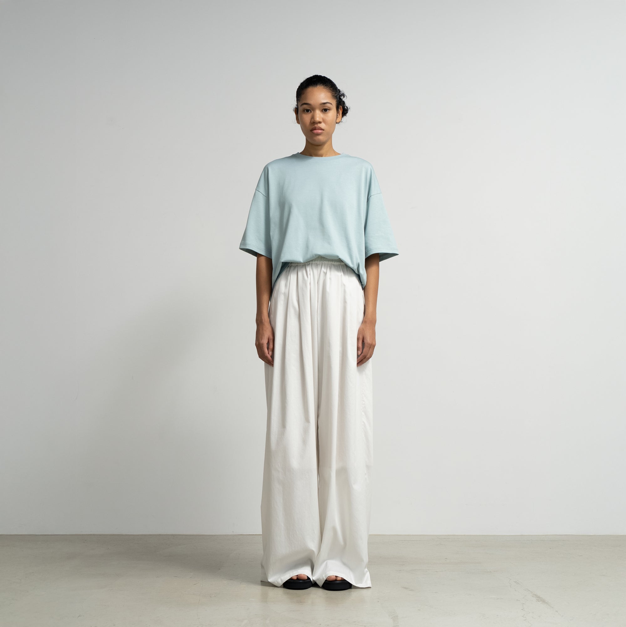 非常に細い糸を3本撚り合わせた糸を使用し、表面は非常に滑らかで、自然な光沢感を放ち、肌になじむ柔らかな天竺を使用したTシャツ。上品な表情でありながら、ゆったりとしたシルエットで心地良く着用できる一枚。