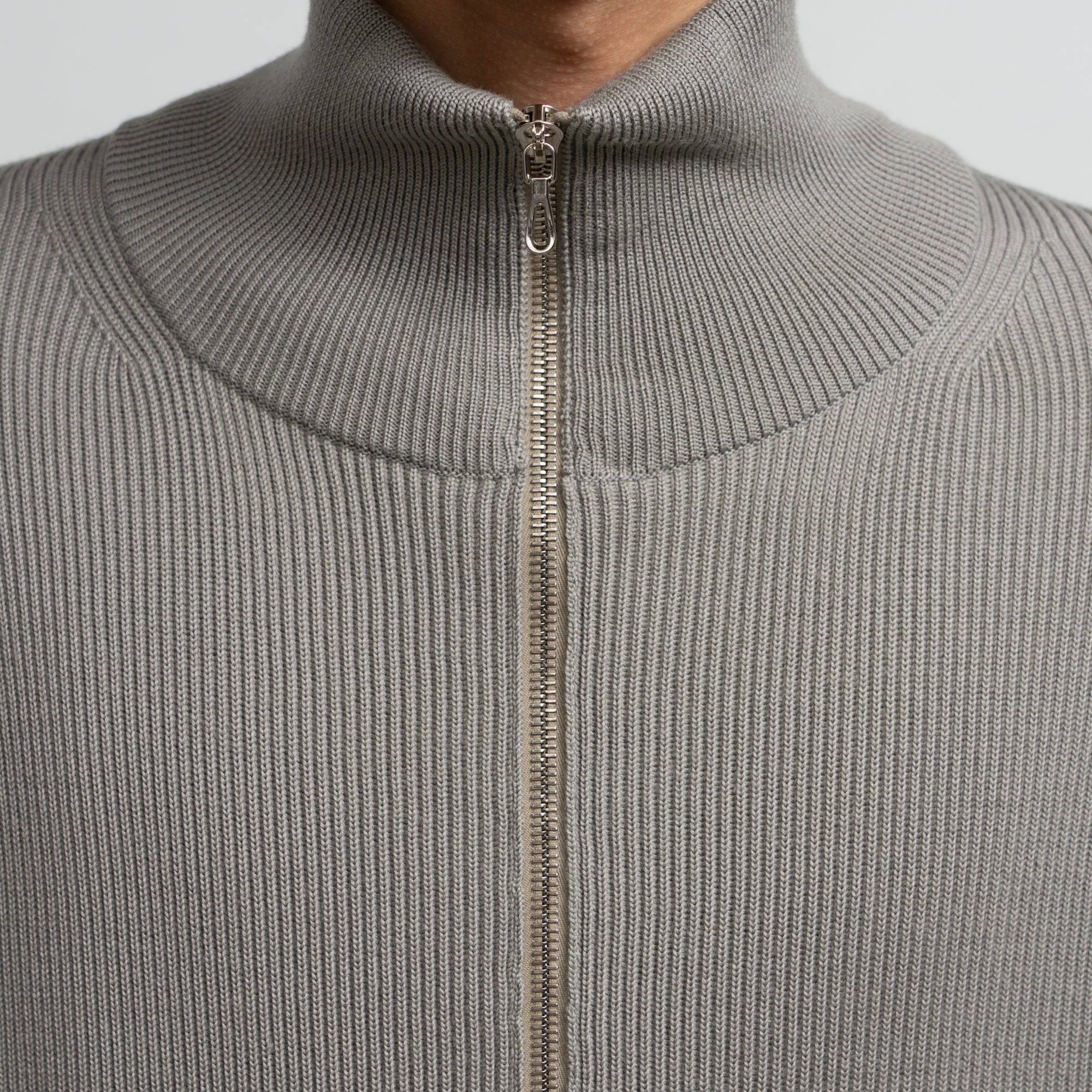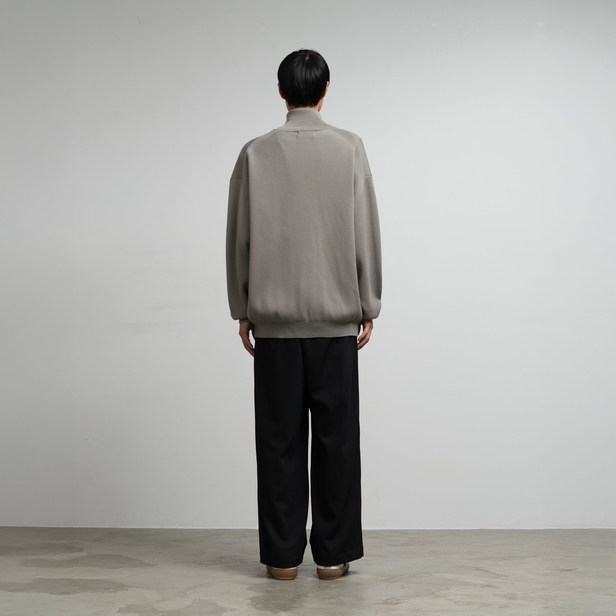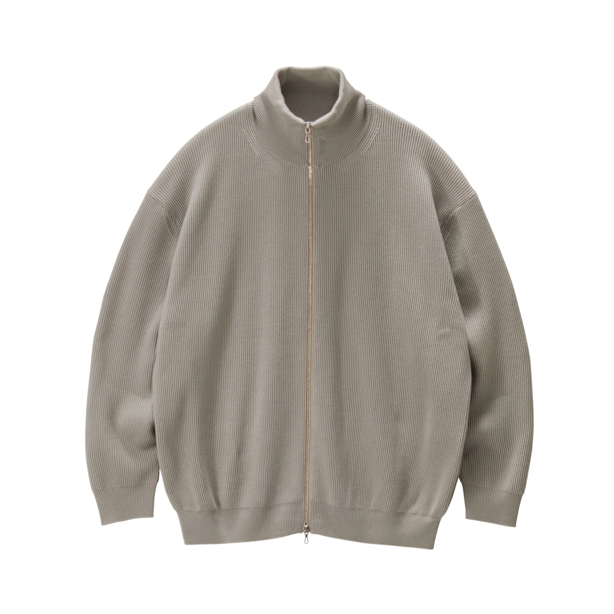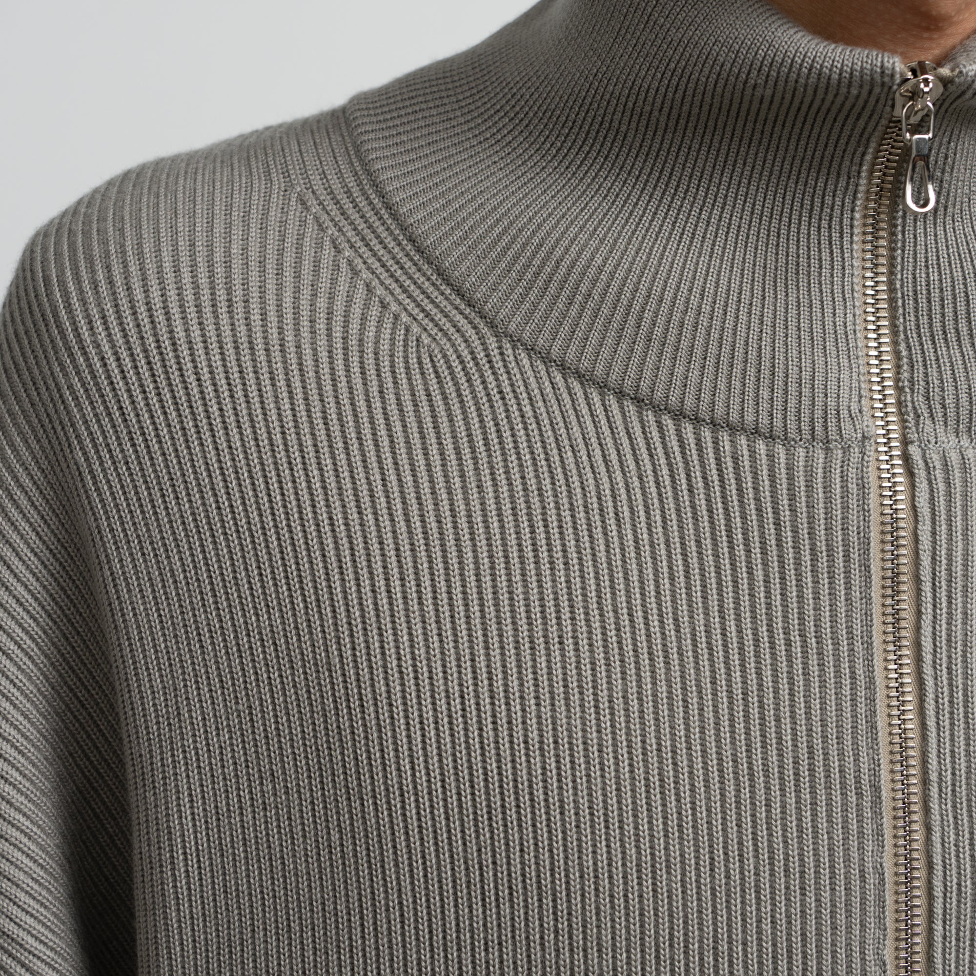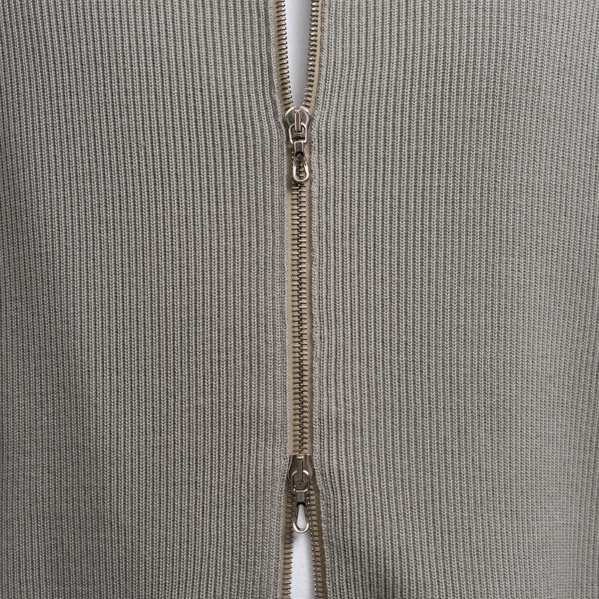 非常に細かく上質で艶やかなメリノウールを使用して、限界まで度詰めに編み立てたミドルゲージニット。フロントに配したダブルジップが着こなしの幅を広げてくれる。