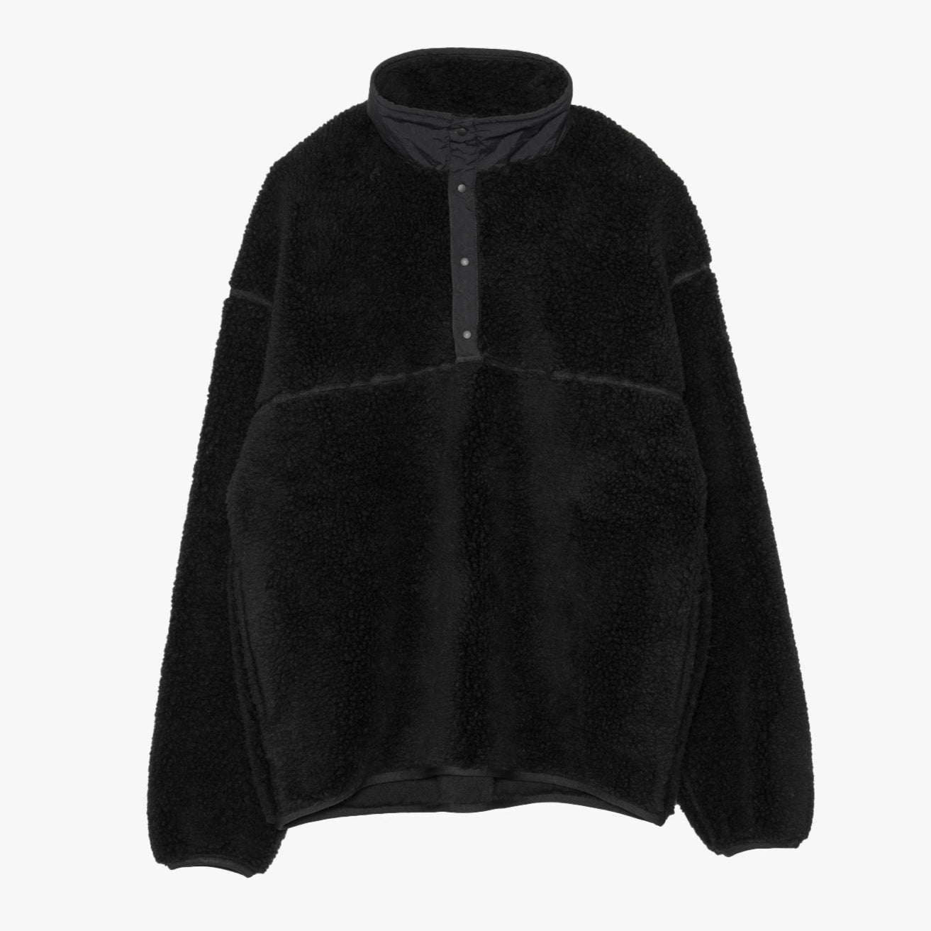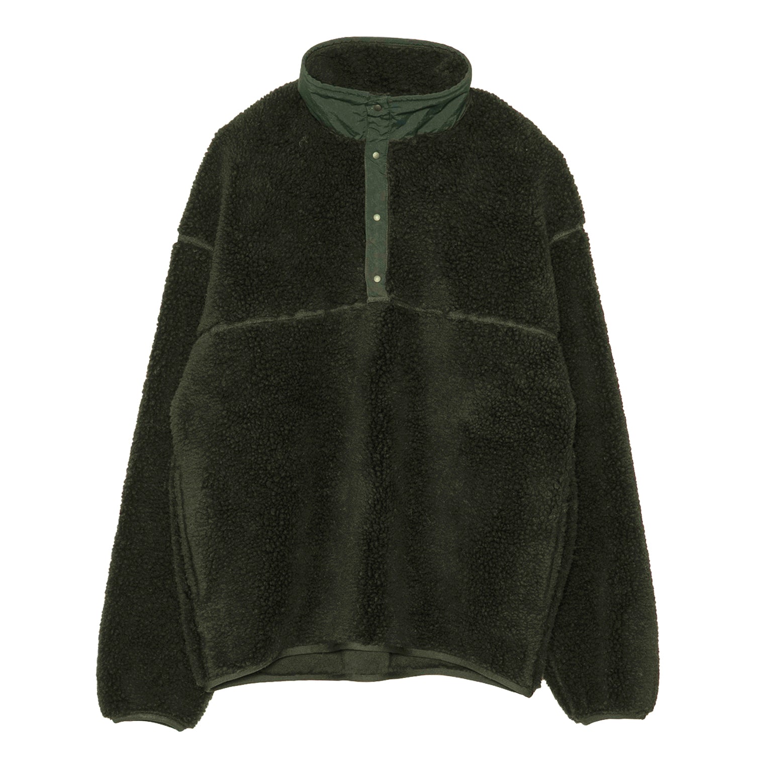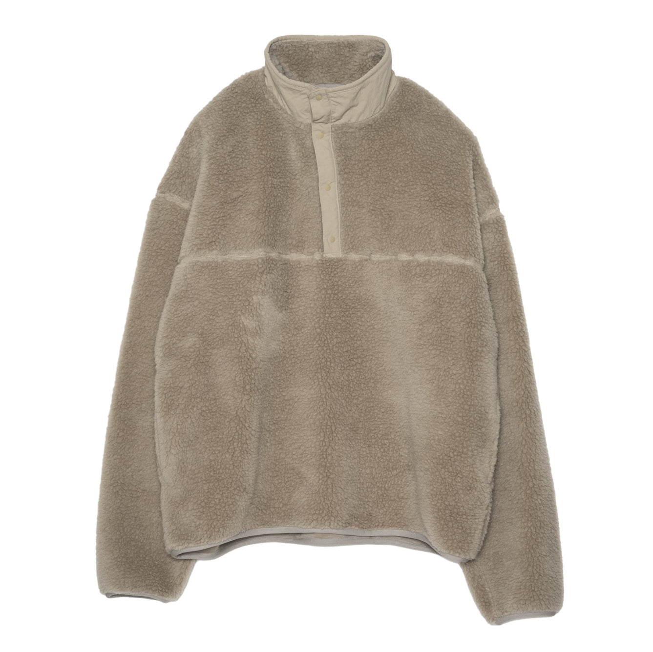 上質な羊毛ならではの温もりとふんわりとした肌触りが魅力のウールボア。通常は合成繊維を使用する土台にも贅沢にウールを用いて縮絨を絶妙に調整することで、しなやかさを損なわずに仕上げた素材。90sテイストのアウトドアブルゾンを現代風にアップデートし、ボリュームのあるシルエットにアレンジしたプルオーバー。アームホールや身幅にはゆとりを持たせ、リラックスした雰囲気を演出する。ユニセックス展開。